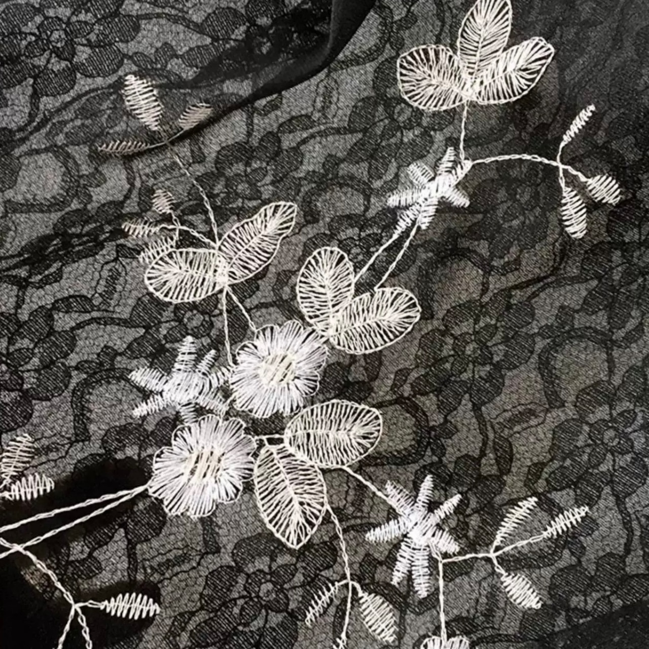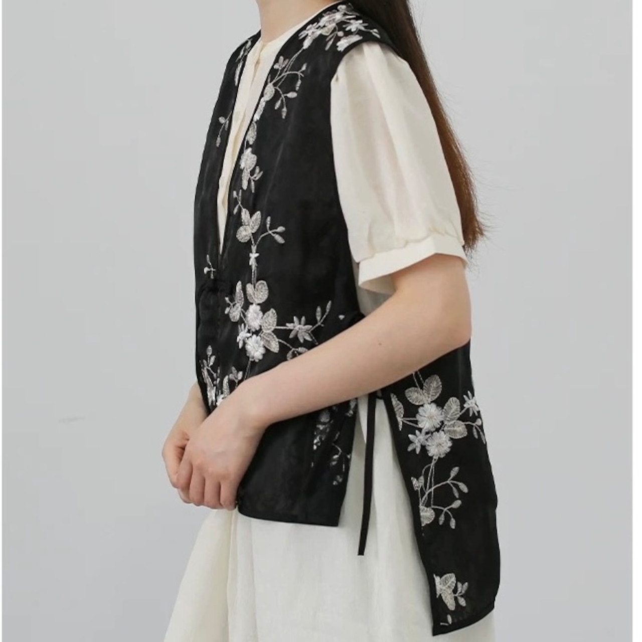 フラワー刺繍が施されたレース素材のベスト。シンプルなコーデにプラスするだけで、一気に華やかな印象に。