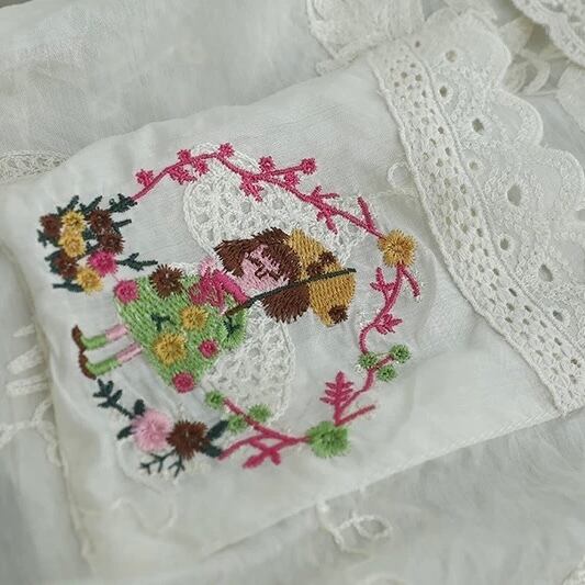 胸元のリボンや裾のフリルが可愛らしく、両ポケットには女の子とお花の刺繍入り。