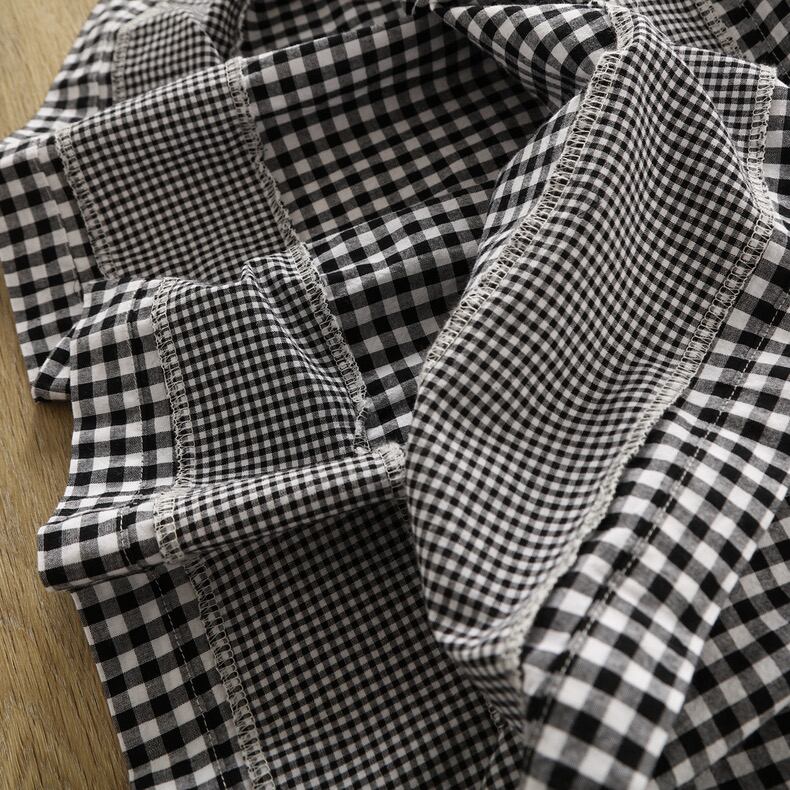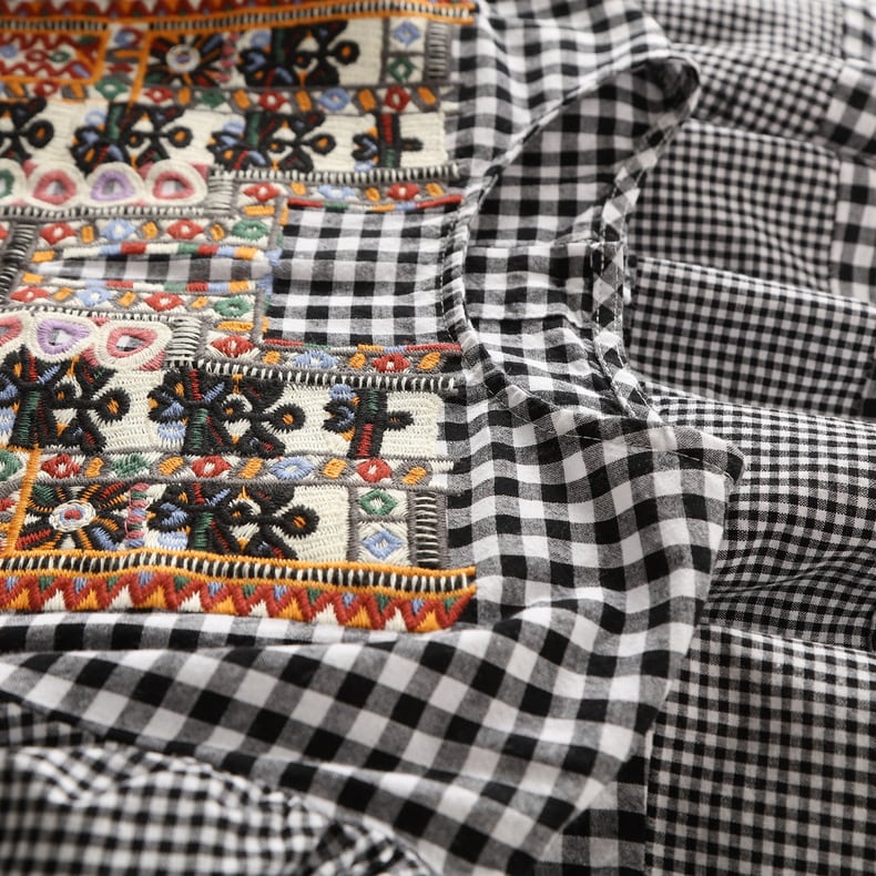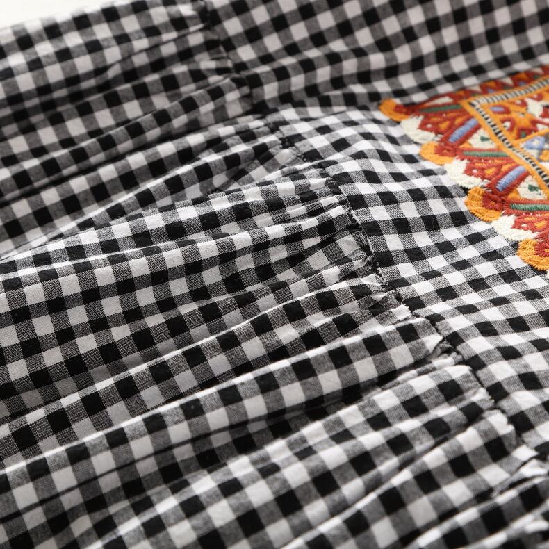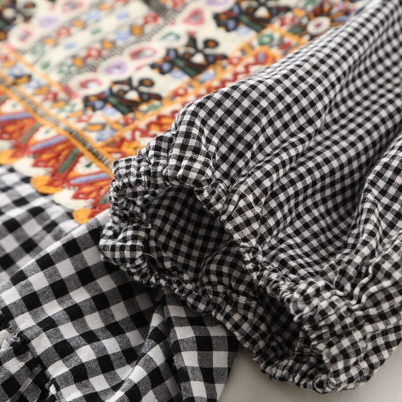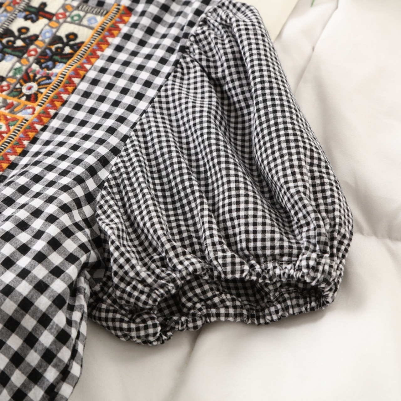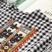 胸元に施された幾何学風の刺繍柄が印象的で、シンプルな中にも華やかさを感じさせます。袖はふっくらとしたパフスリーブ、裾には異なるチェック柄を切り替えて、さりげない遊び心もプラス。