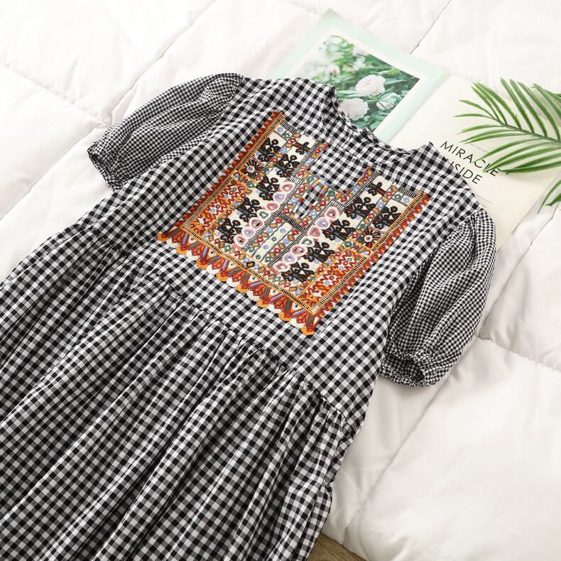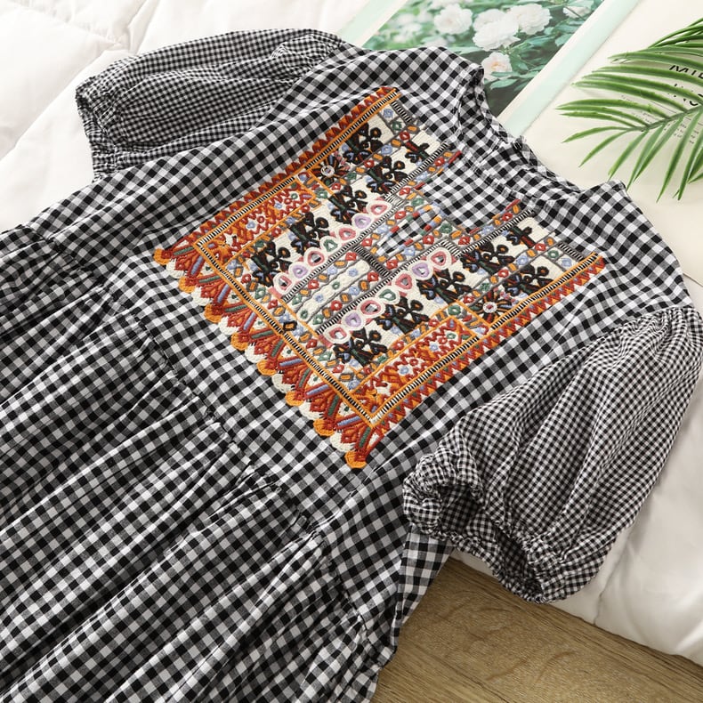 カラフル刺繍ギンガムチェックパフスリーブワンピース fu0719