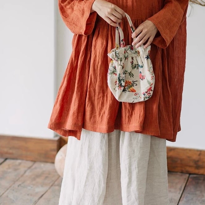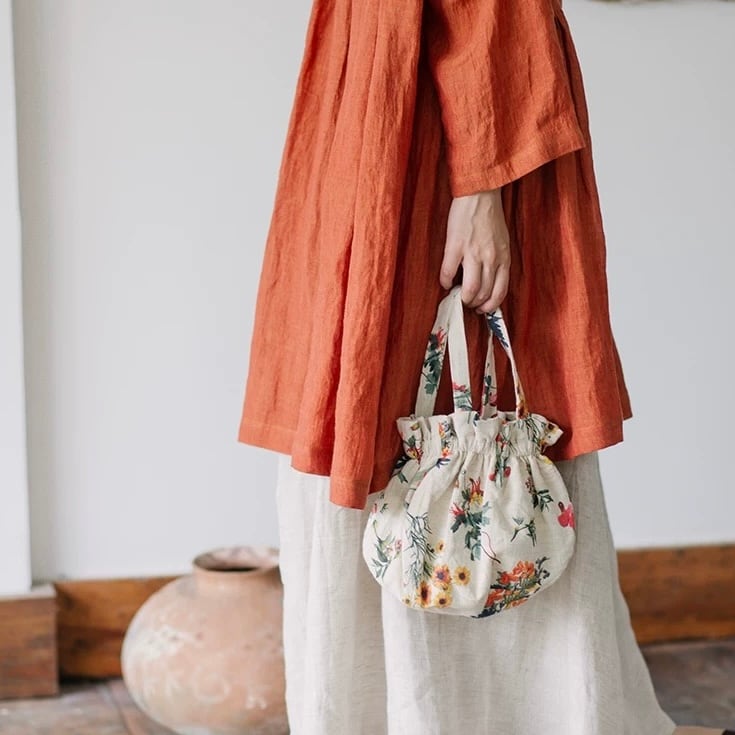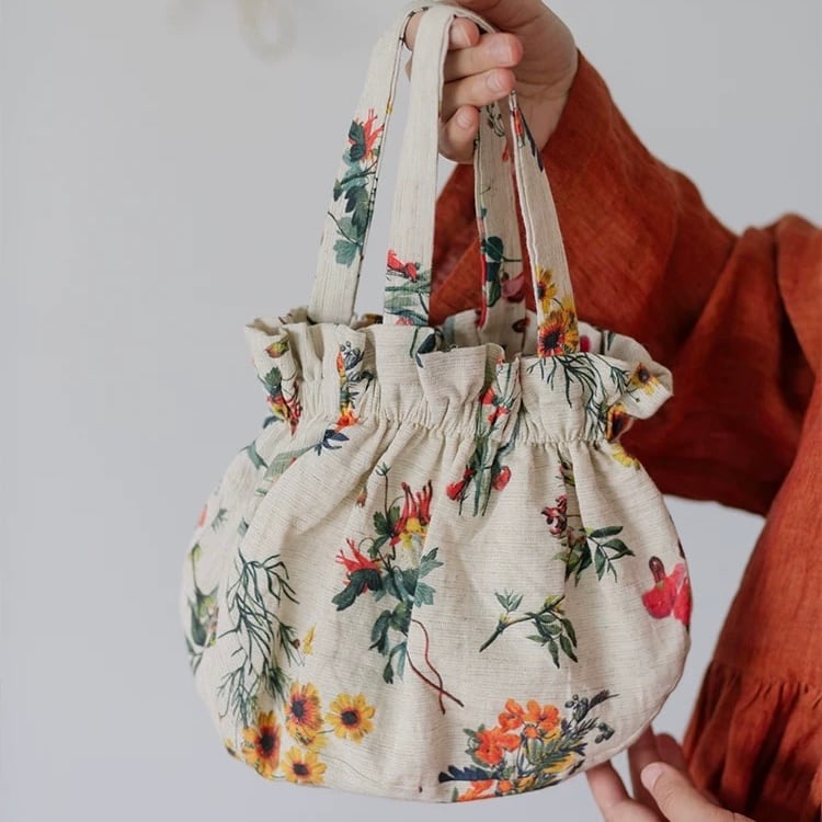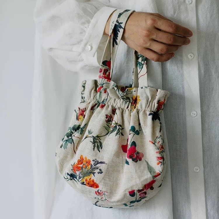 コーデのアクセントになる、ナチュラルな花柄の巾着バッグ。