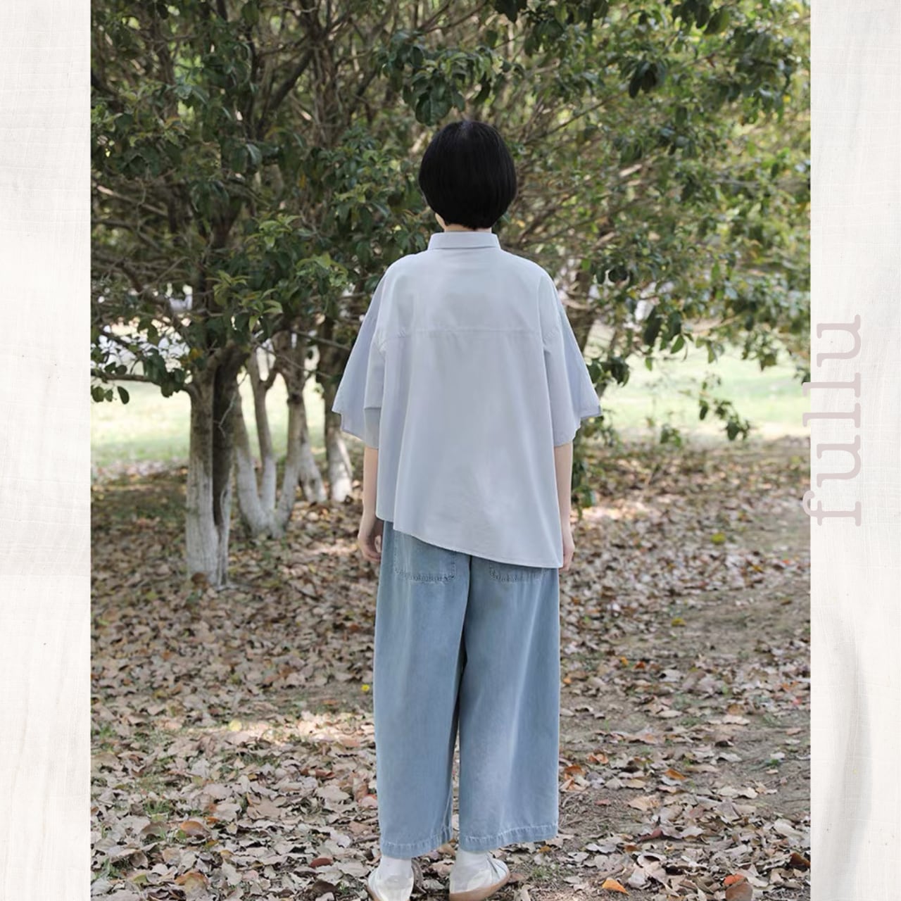 ドロップショルダーとゆるめの五分袖で、ナチュラルな着こなしが楽しめます。