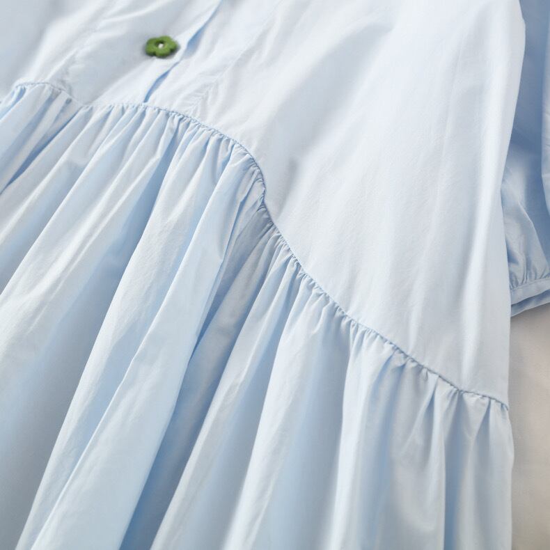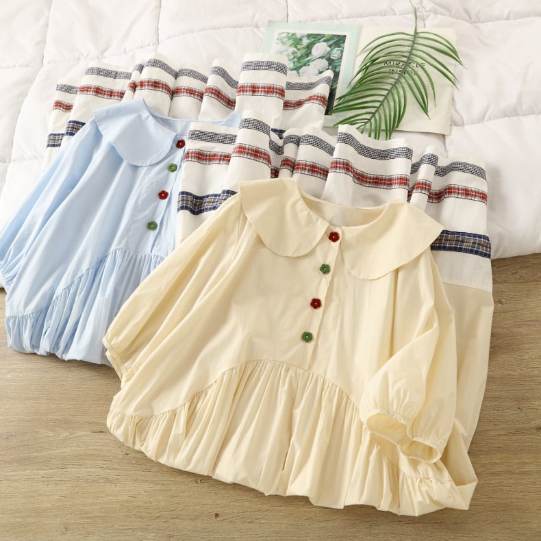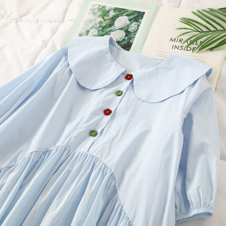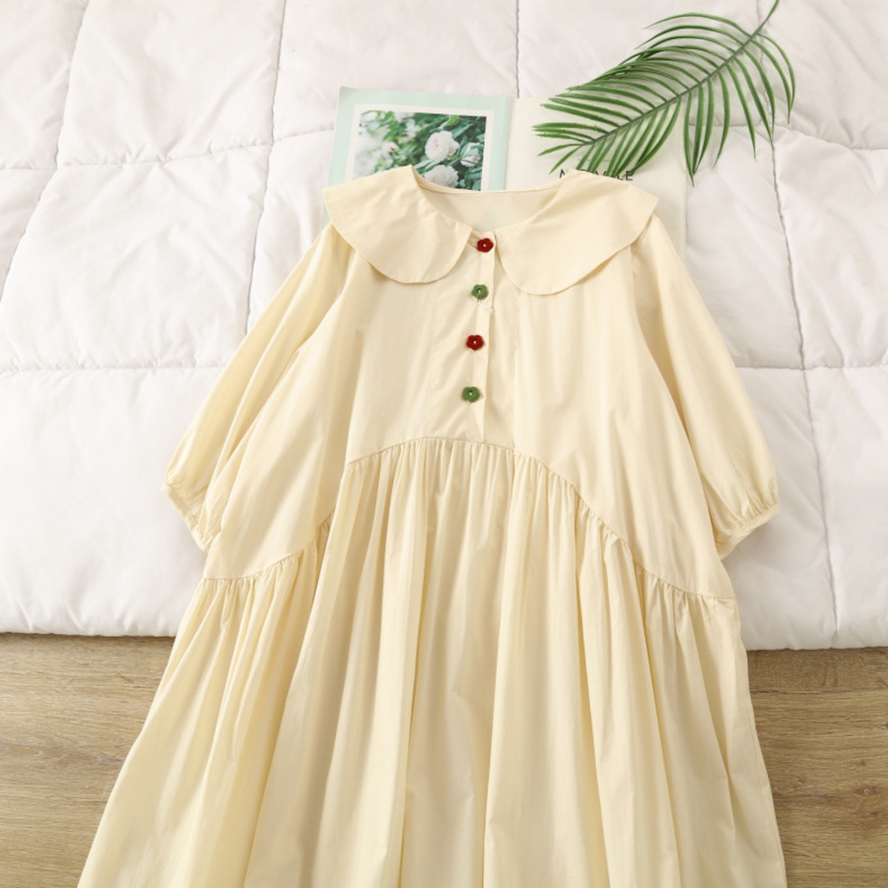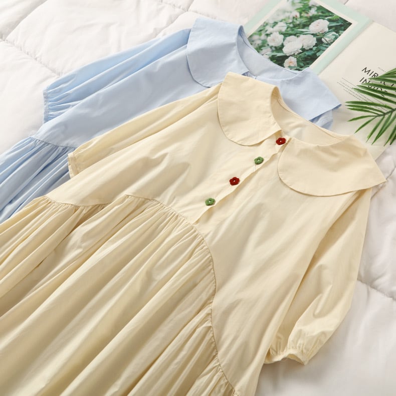 ころんと丸い襟元とカラフルなボタンが、どこか懐かしい雰囲気を漂わせます。
