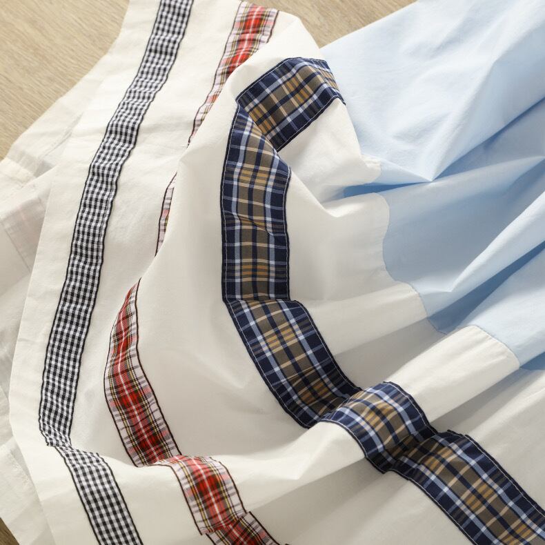 裾には赤と青のチェック柄テープを重ねて、ナチュラルな中にちょっぴり遊び心を添えました。