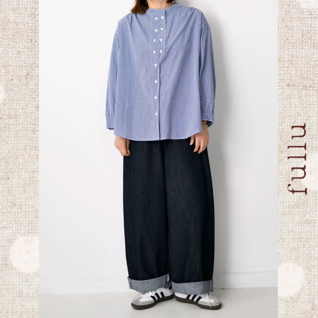 ころんと並んだボタンがアクセントになった、スタンドカラーのチェックブラウス。