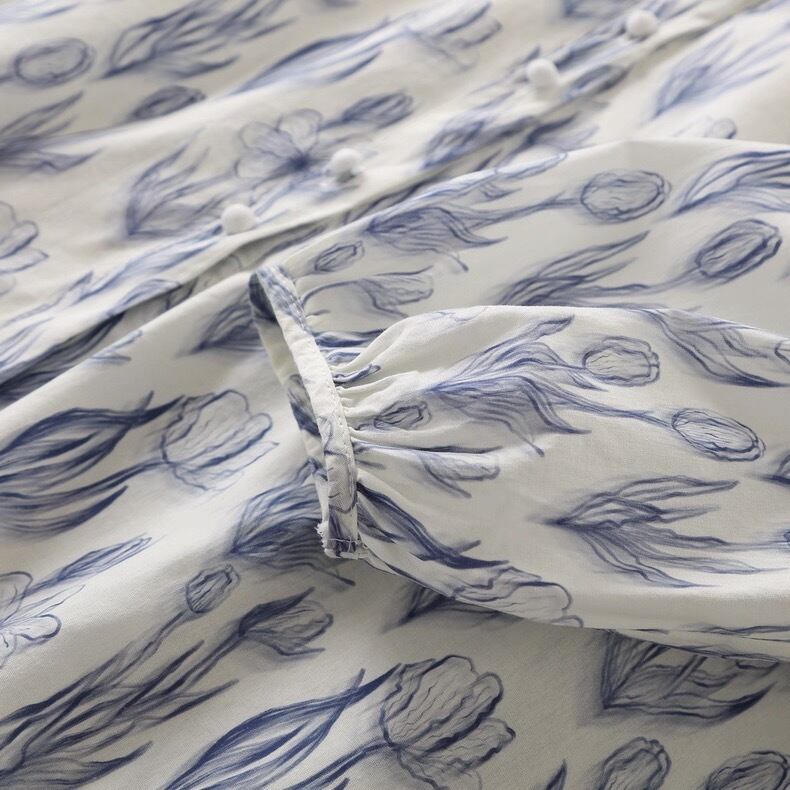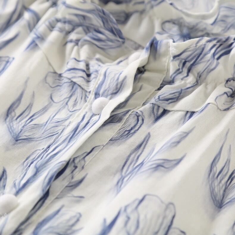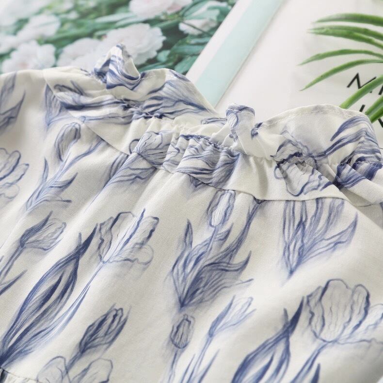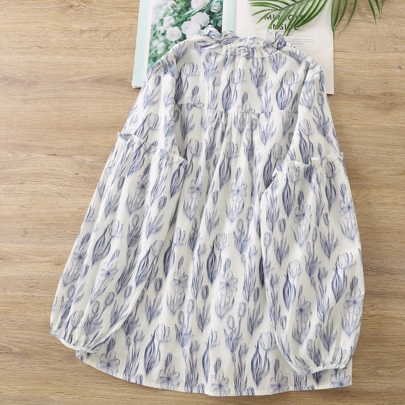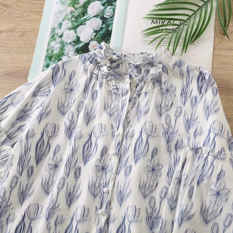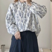 襟元のフリルがさりげなく華を添える、ブルーフローラル柄のブラウス。