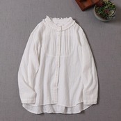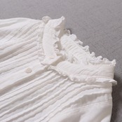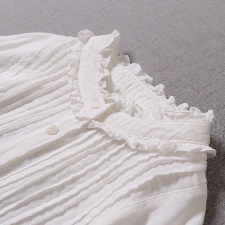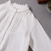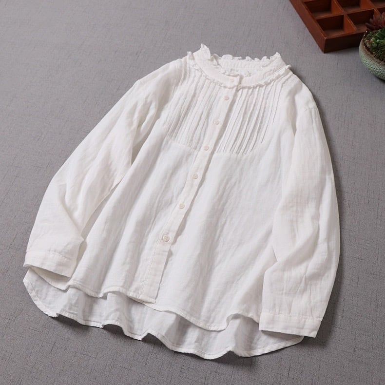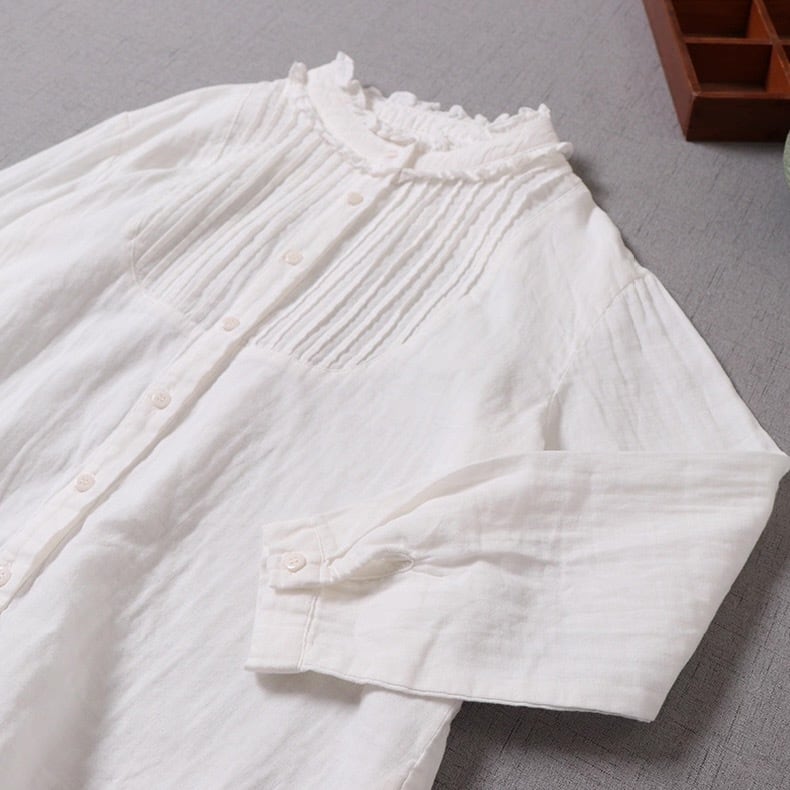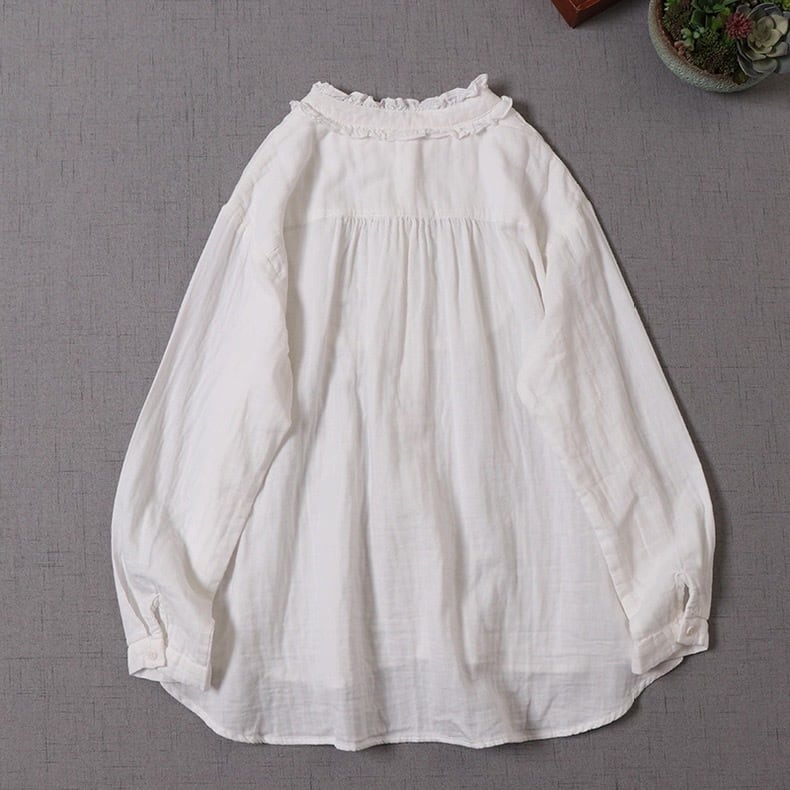 小さなフリル襟がさりげなく目を引く、ナチュラルな印象のコットンブラウス。