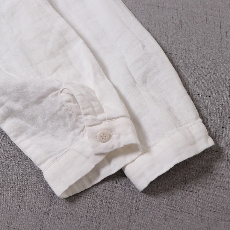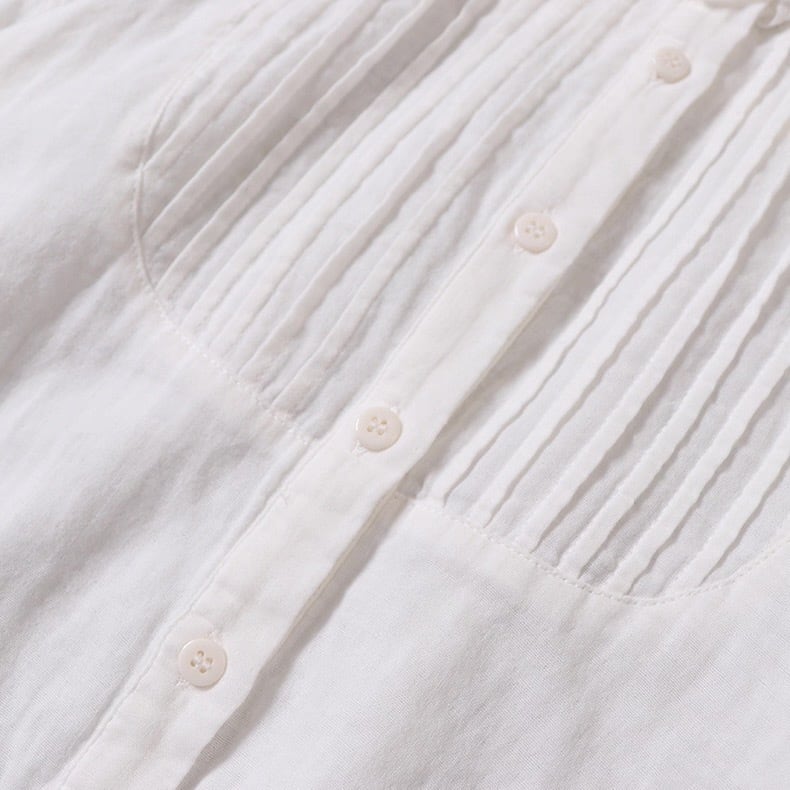 胸元には細やかなピンタックがあしらわれており、シンプルながらも表情のあるデザインです。