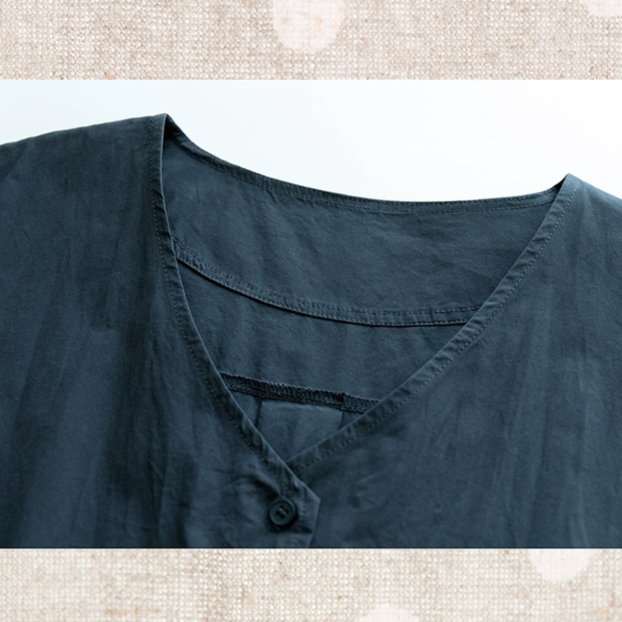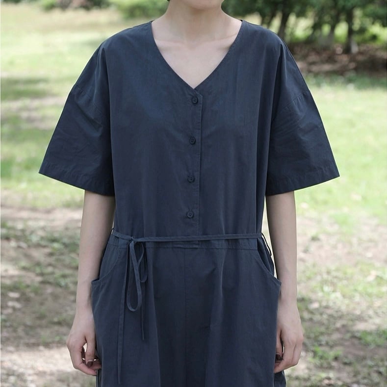 デコルテをすっきり見せてくれるVネックと、ボタンデザインが程よいアクセントに。