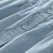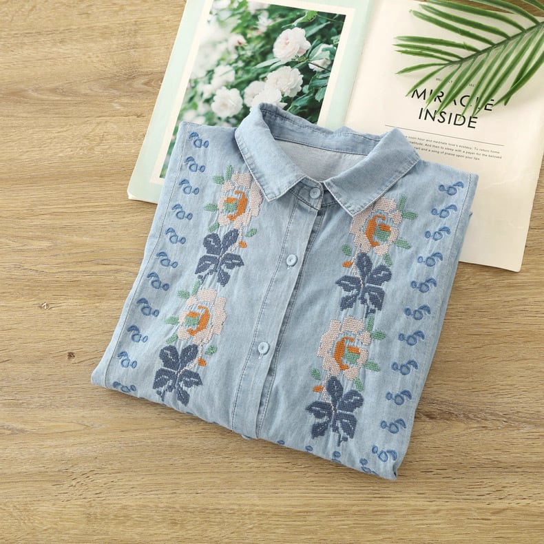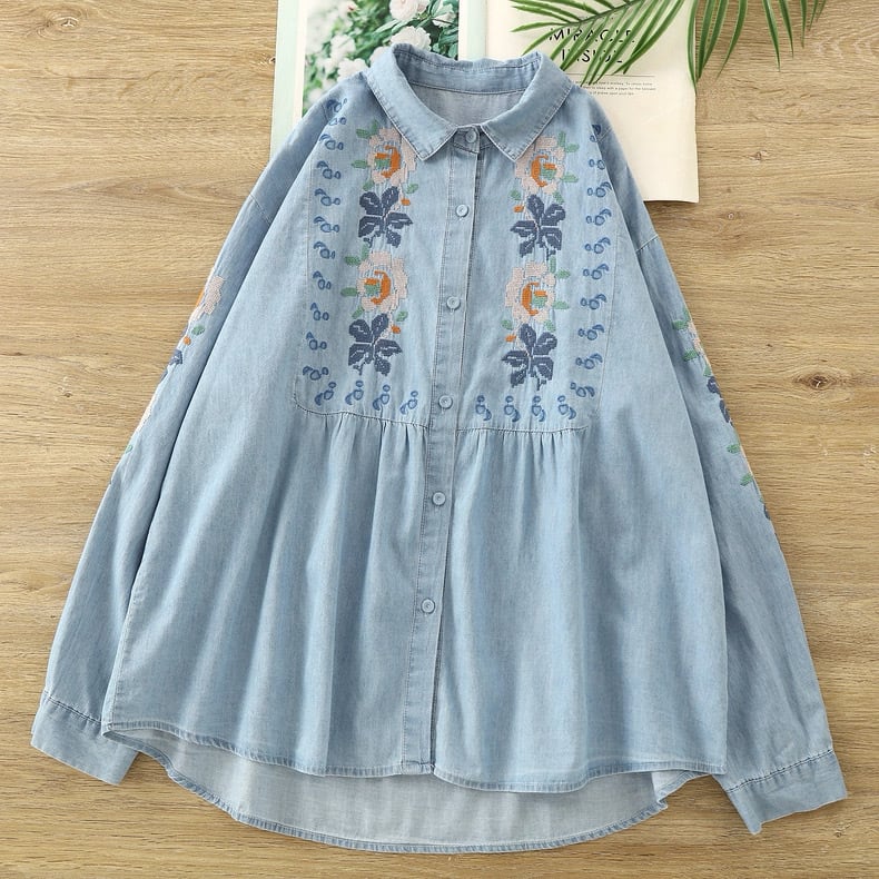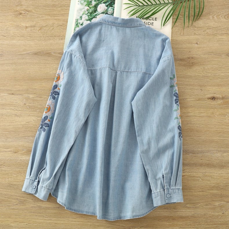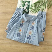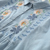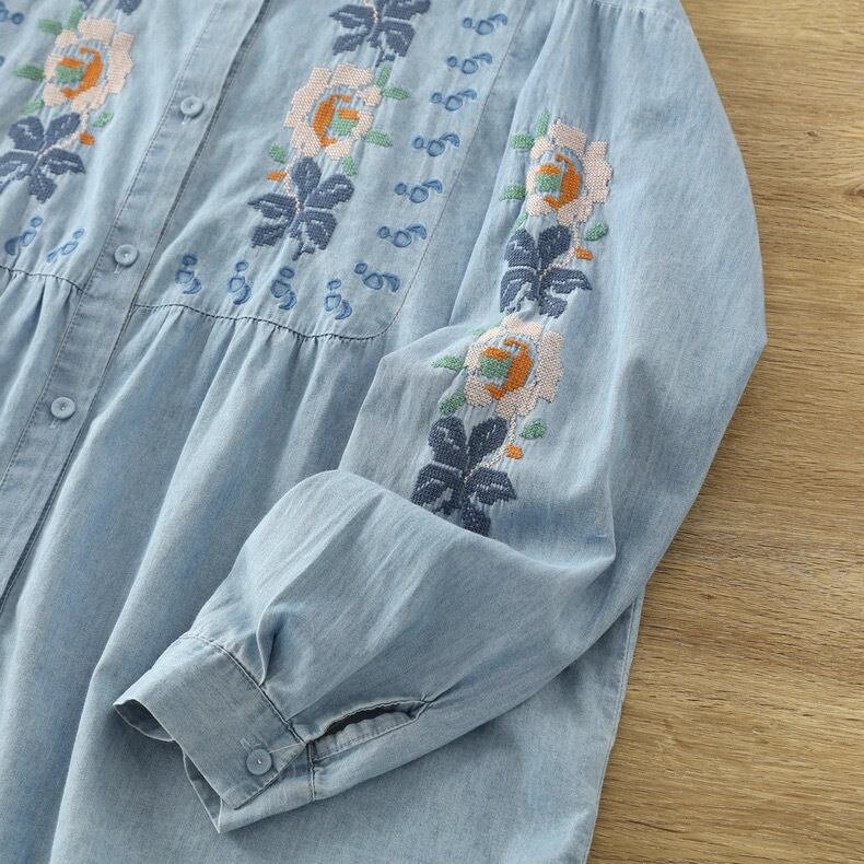 淡いブルーのデニム生地に、フロントと袖に施された色鮮やかな花柄刺繍が映えるシャツです。胸元の切り替えから広がるゆるやかなフレアシルエットが、自然な動きをプラス。前開きデザインで羽織りとしても活躍し、パンツにもスカートにも合わせやすい一枚です。