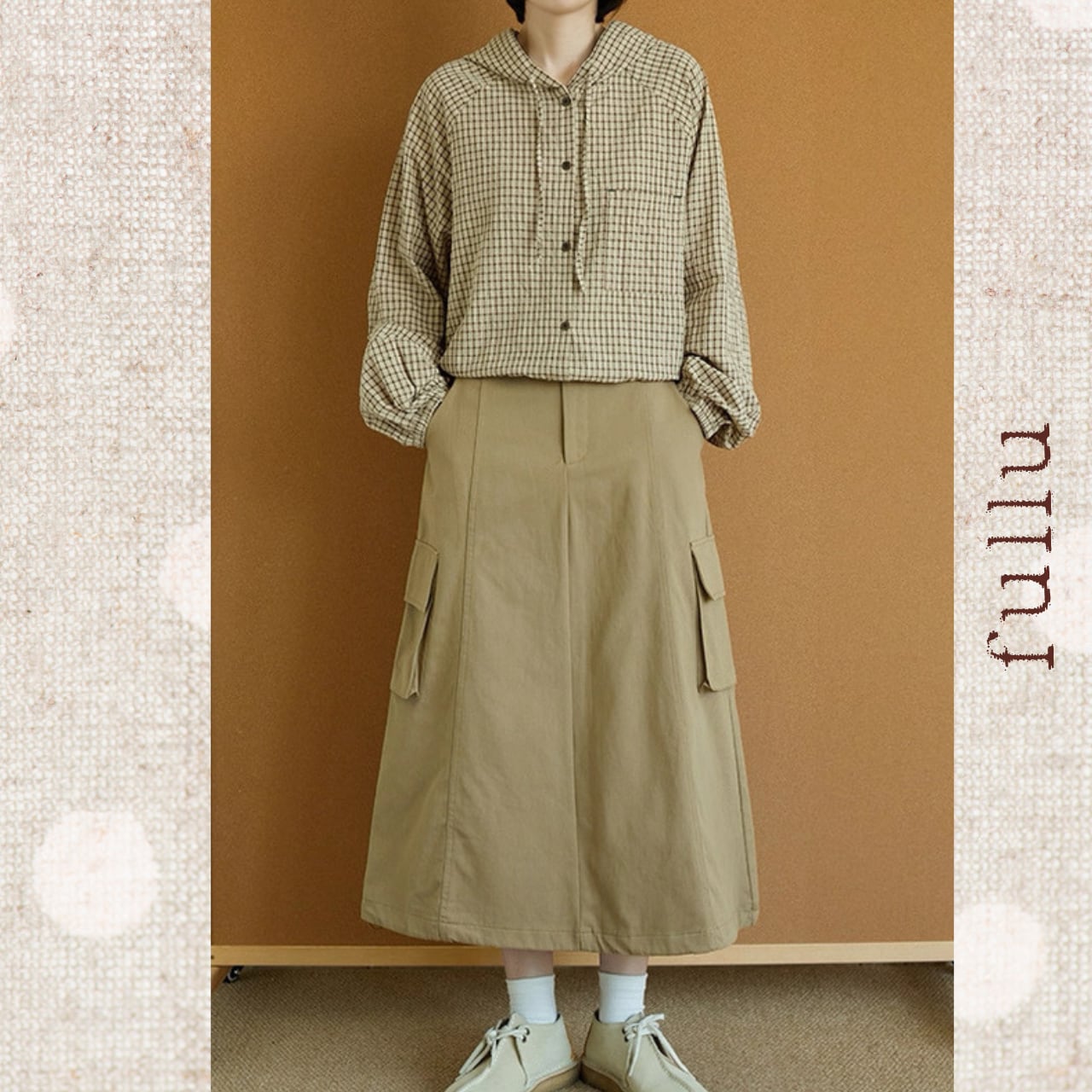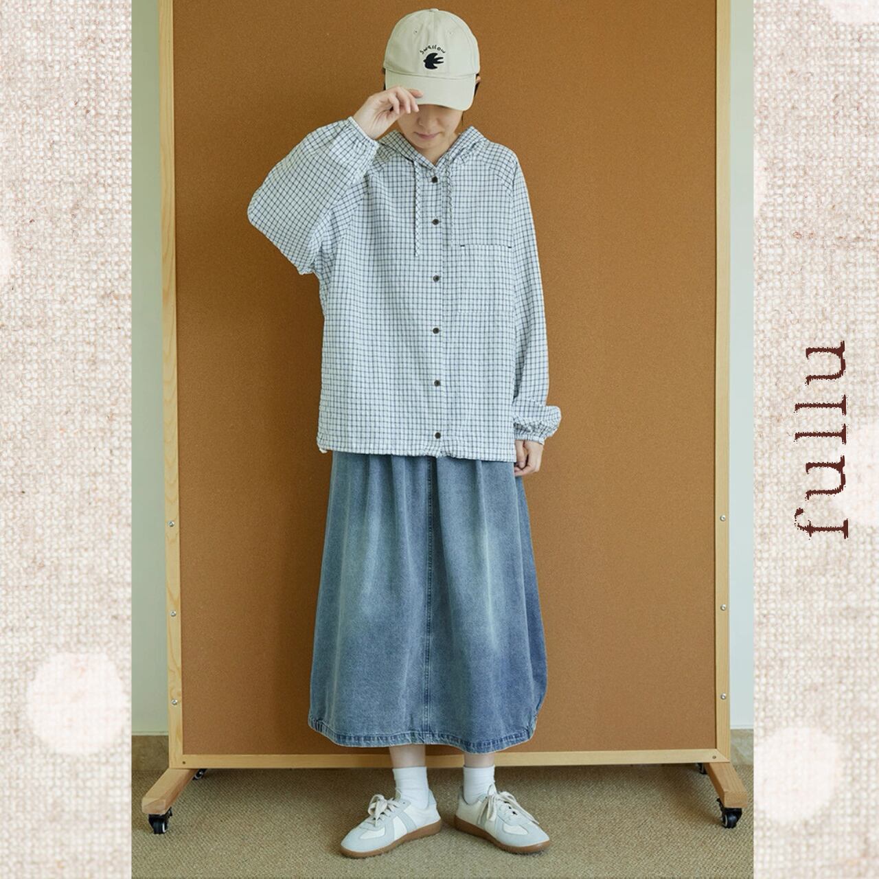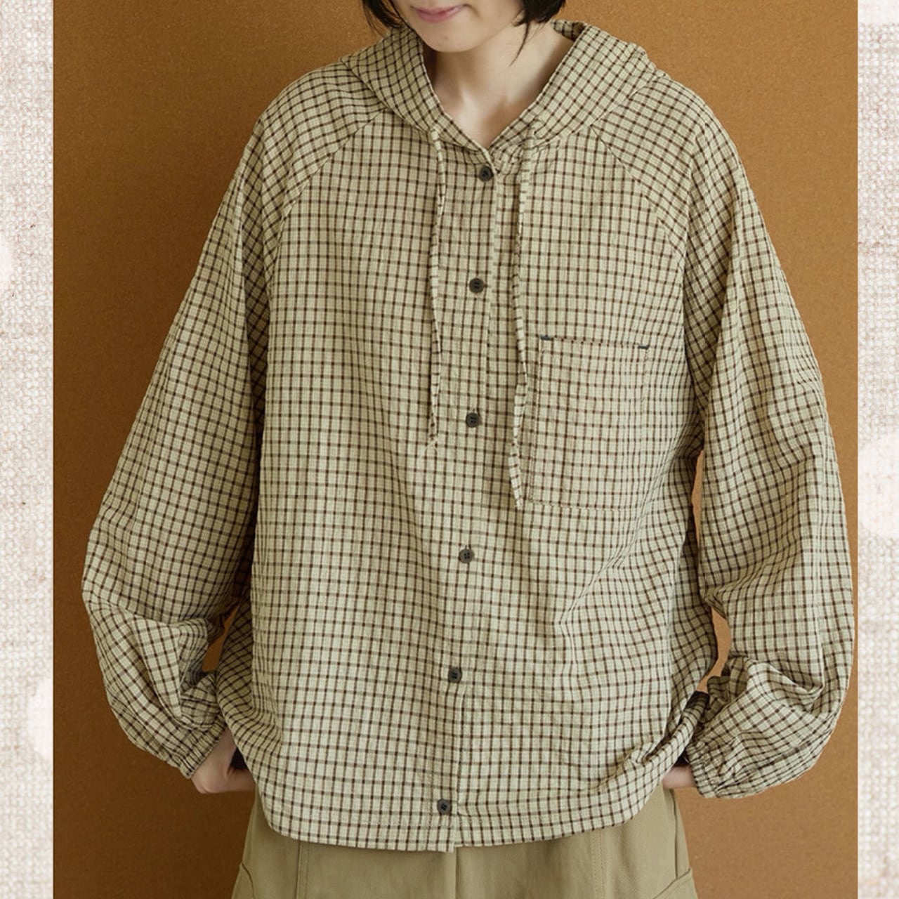 ゆったりシルエットが魅力の、チェック柄フード付きシャツ。ドロップショルダーとボリューム袖でリラックス感を演出。ボタンを閉めても羽織ってもOKな万能アイテムです。