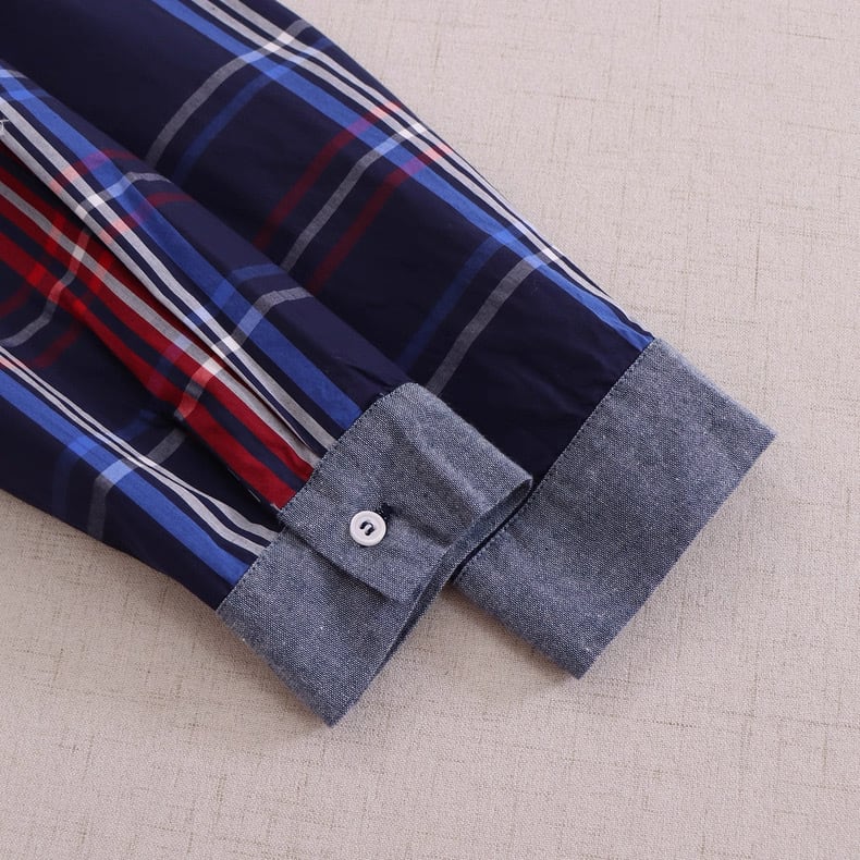 ネイビーを基調に、レッドとブルーのラインが映えるチェック柄シャツ。
