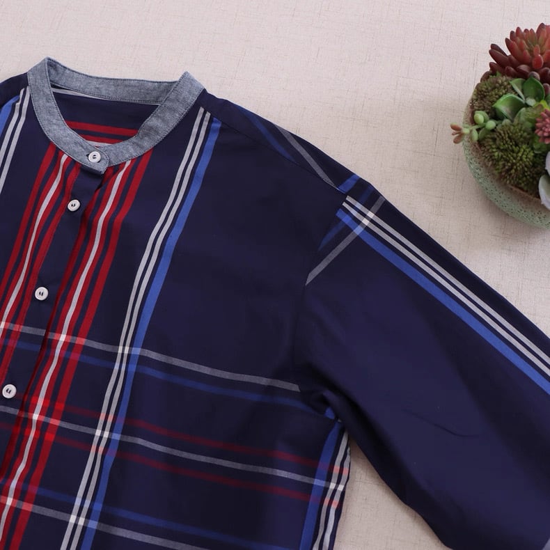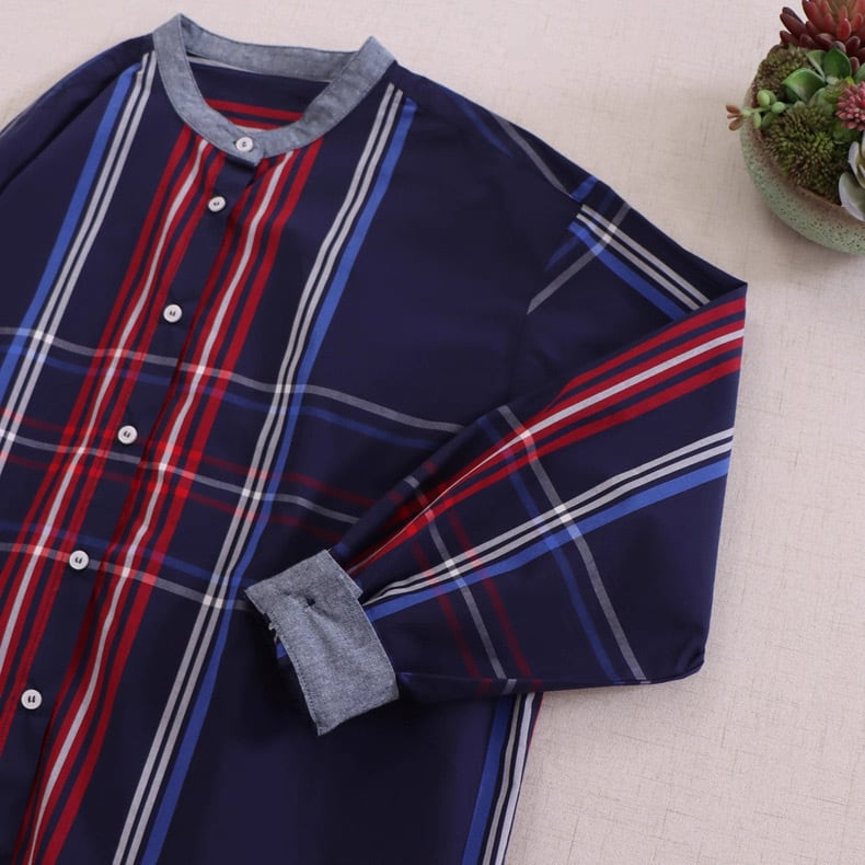 ネイビーチェックのバンドカラーシャツ fu0818