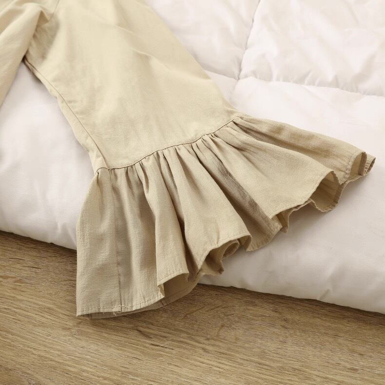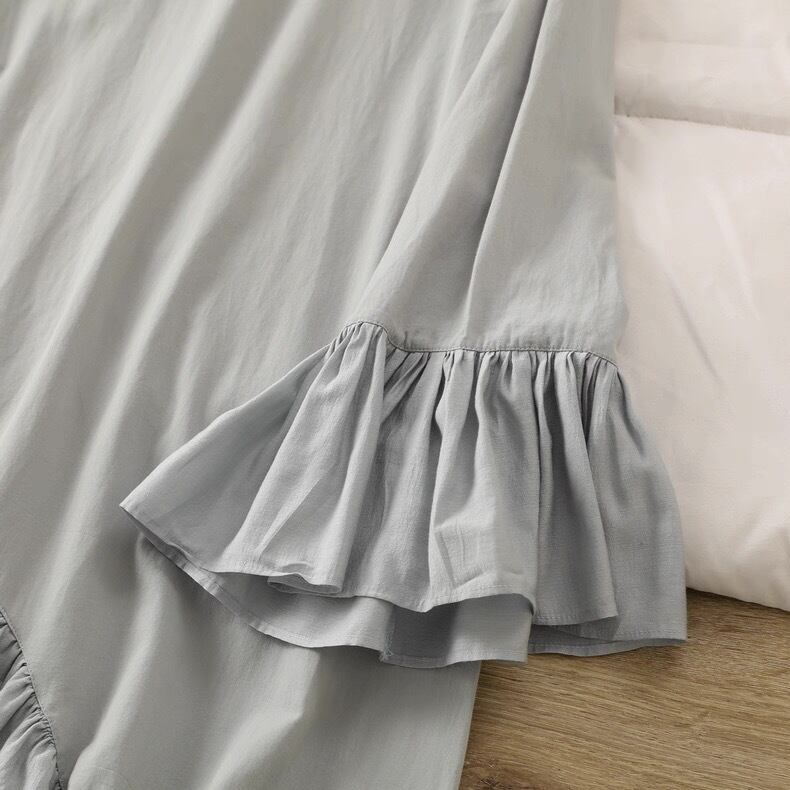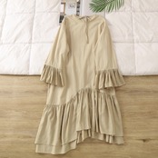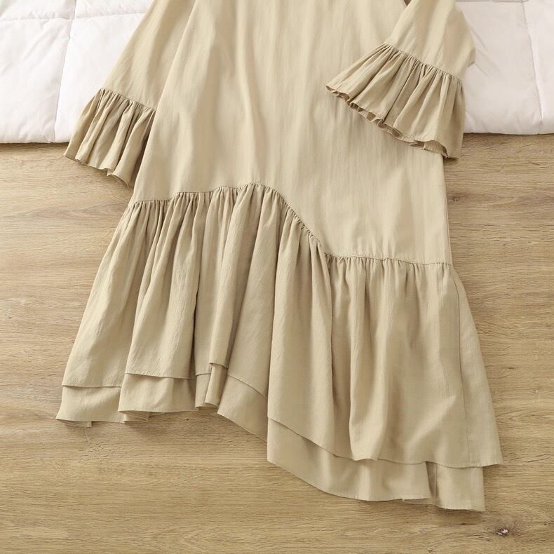袖口と裾にたっぷりと入ったフリルがポイントのワンピースです。