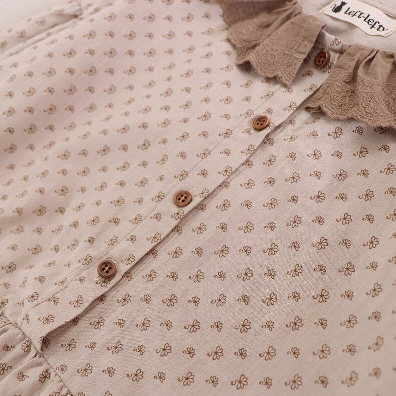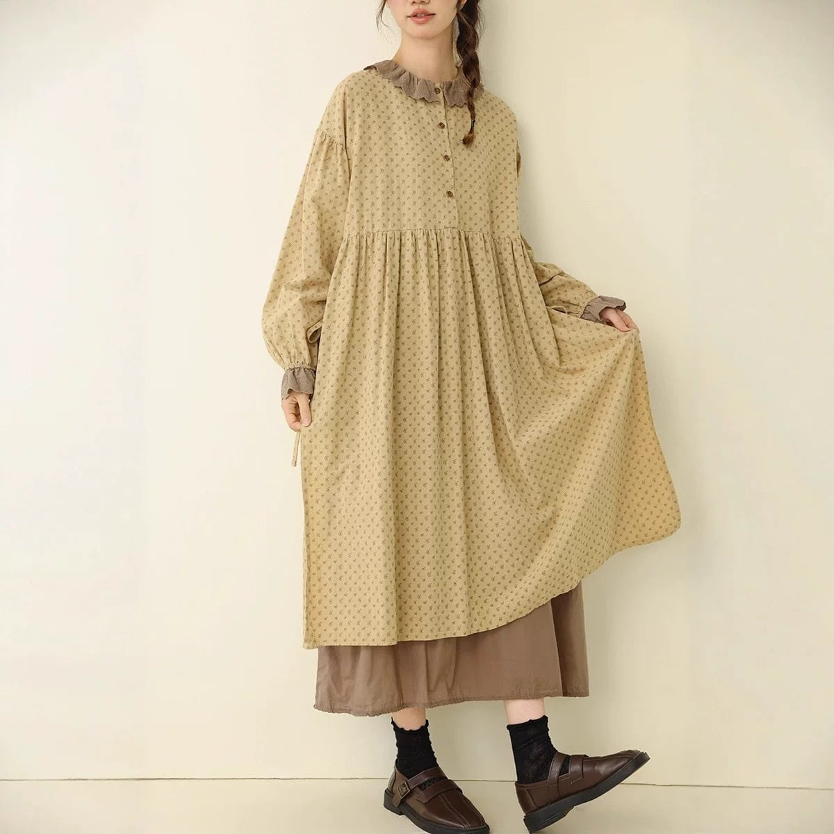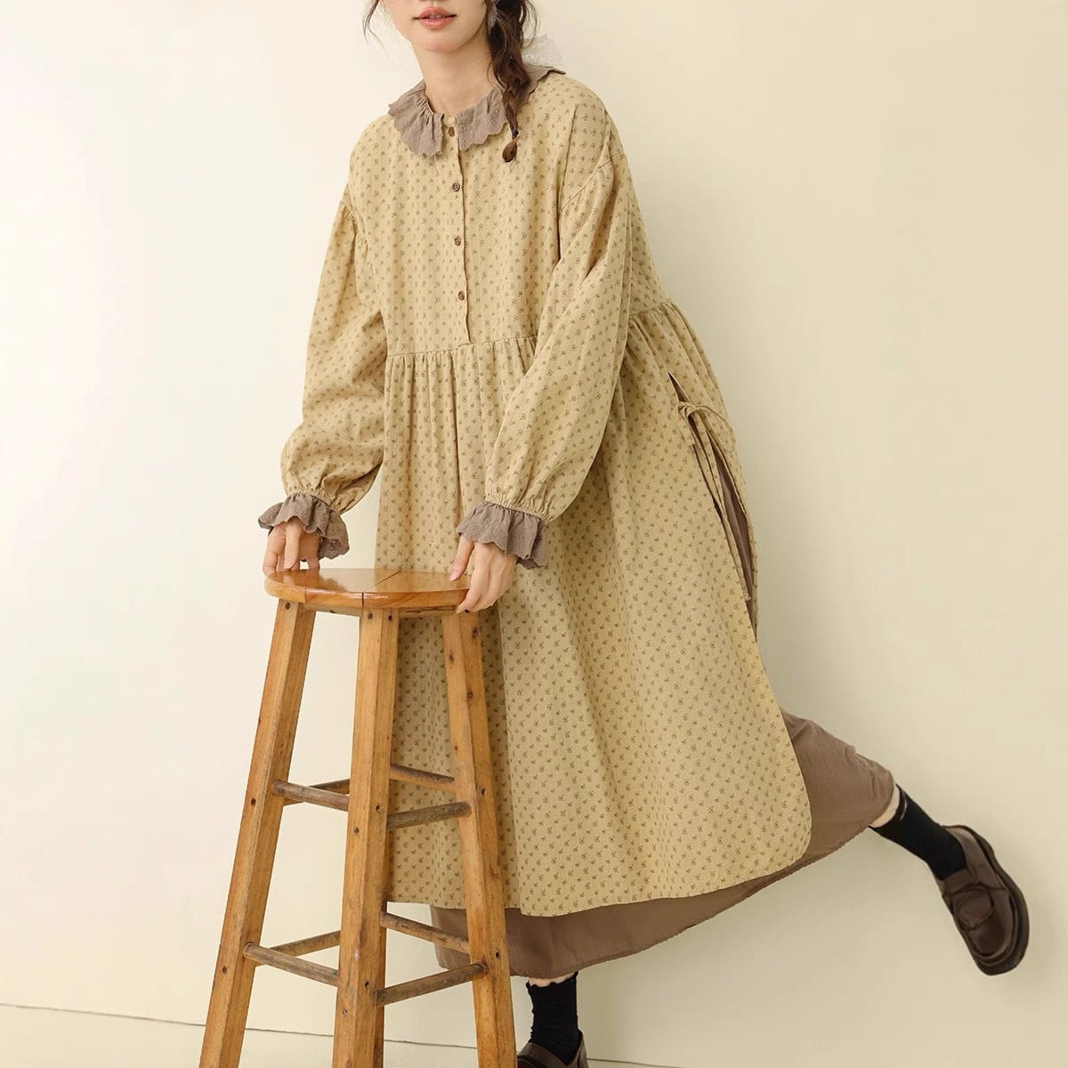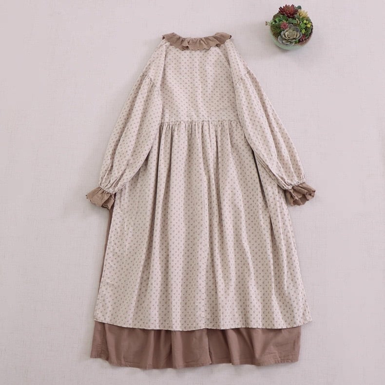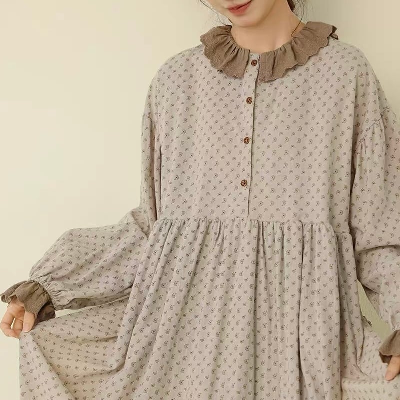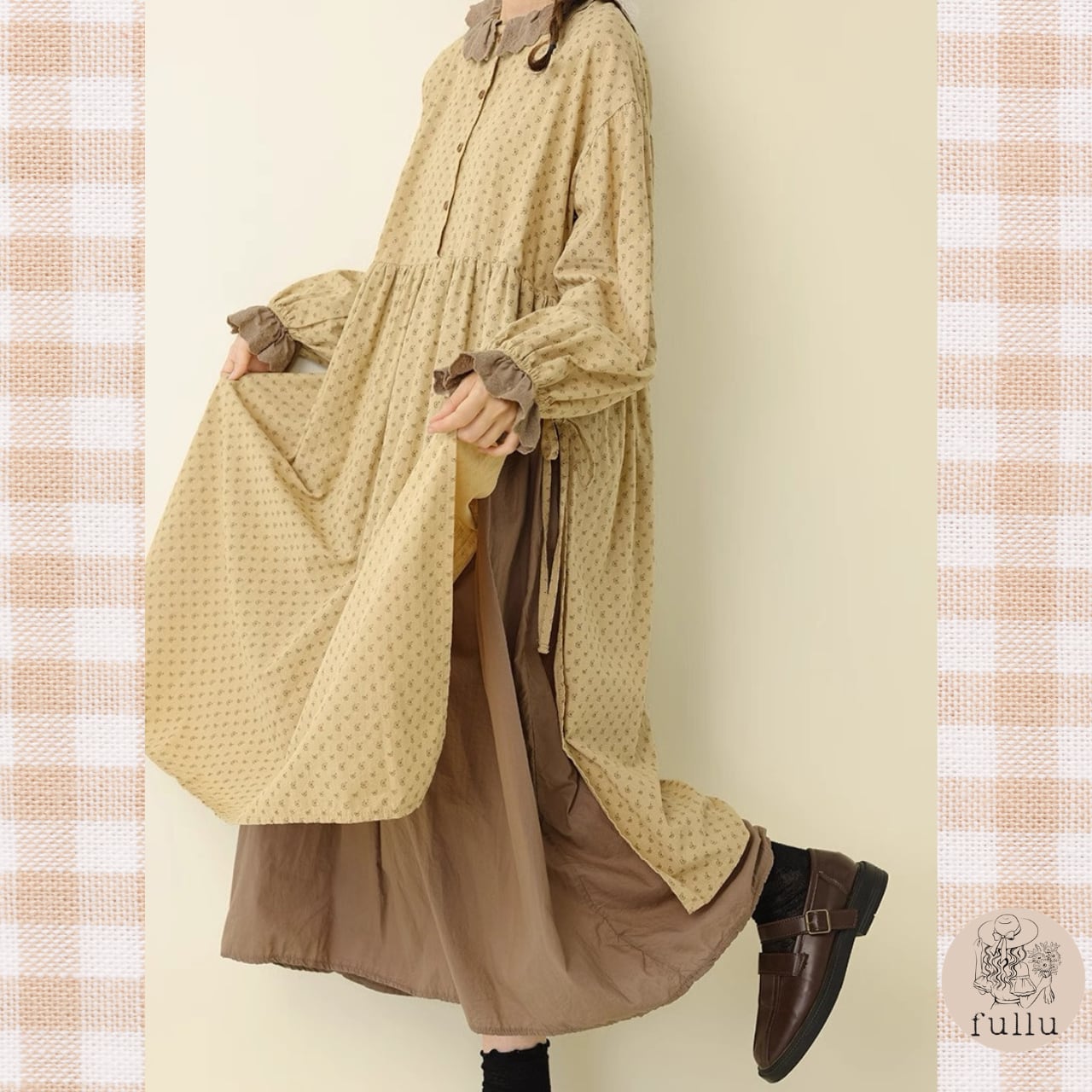 小さな花柄にフリルの襟や袖を組み合わせた、1枚で重ね着コーデが完成するワンピース。