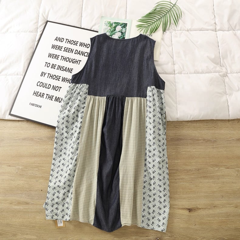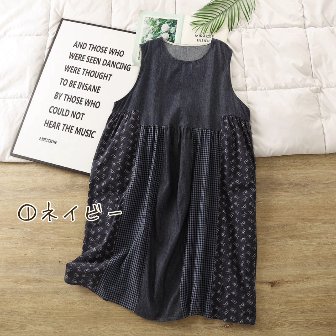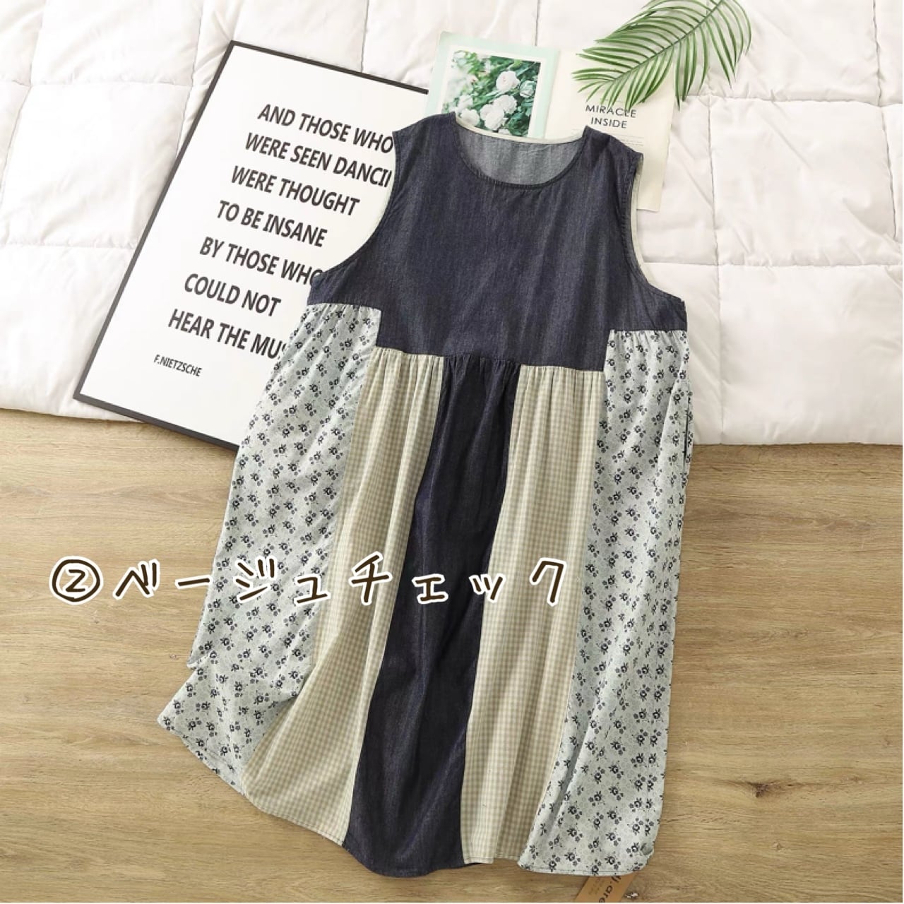 デニム生地を上身頃に使い、スカート部分をチェック柄や小花柄で切り替えたパッチワーク風のワンピースです。