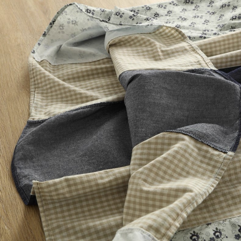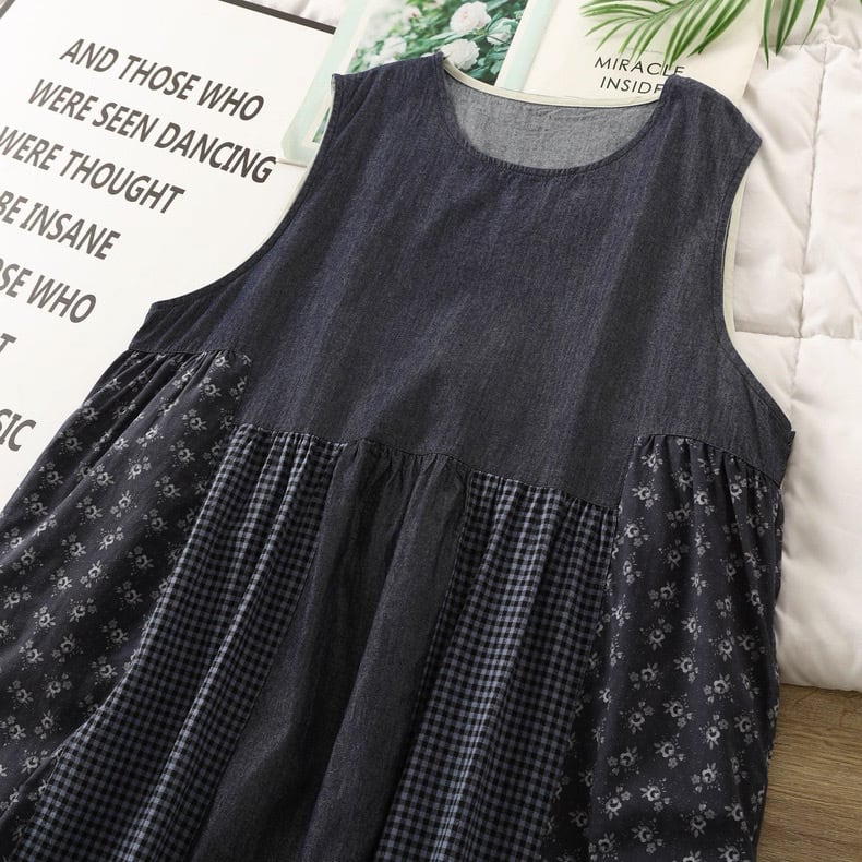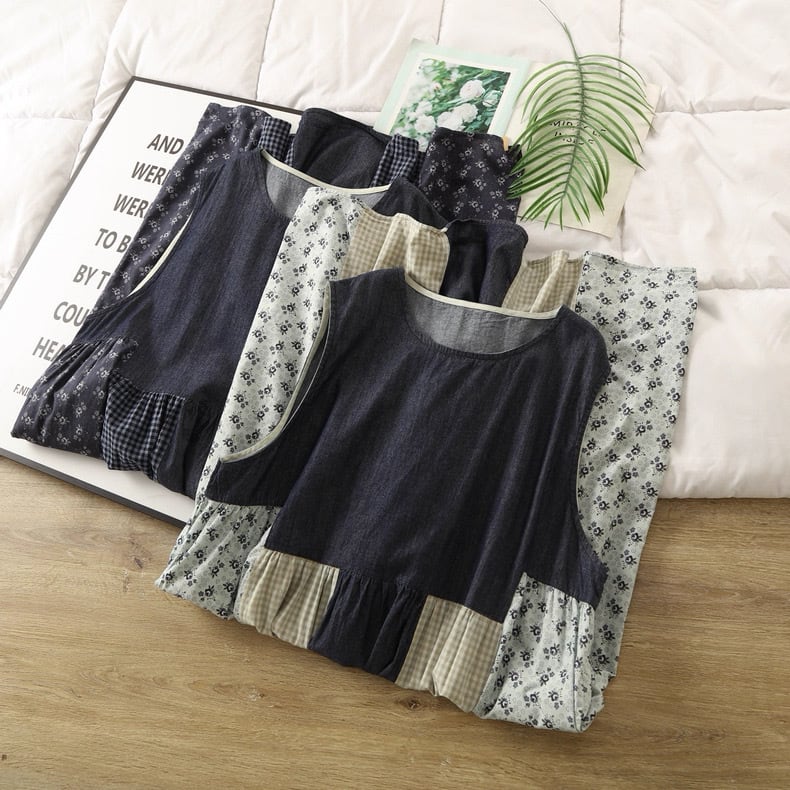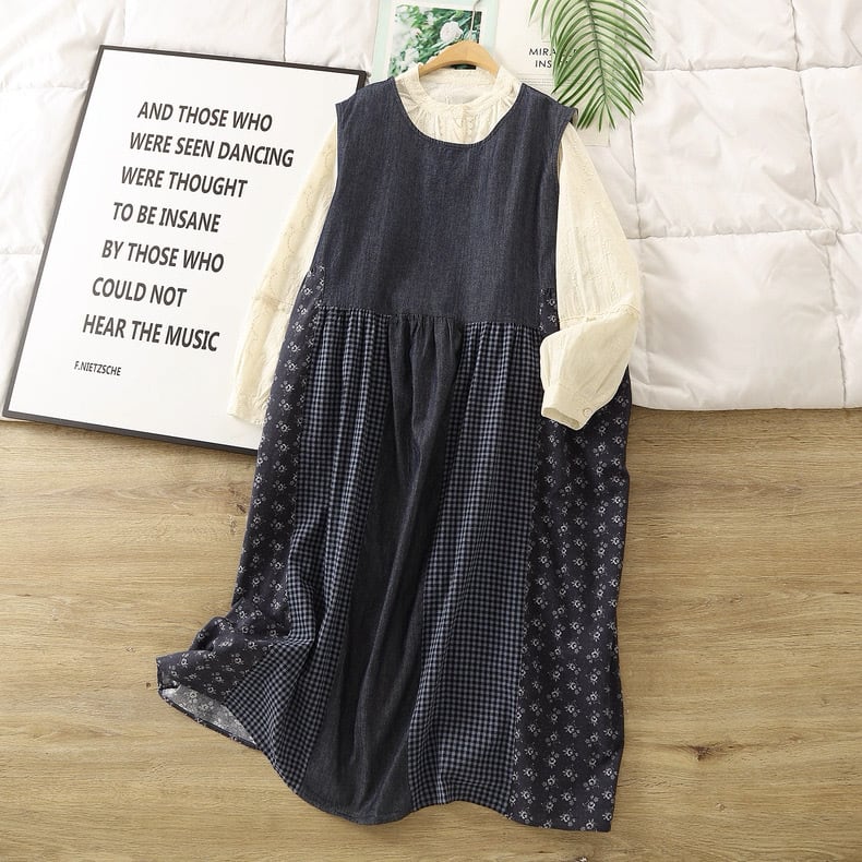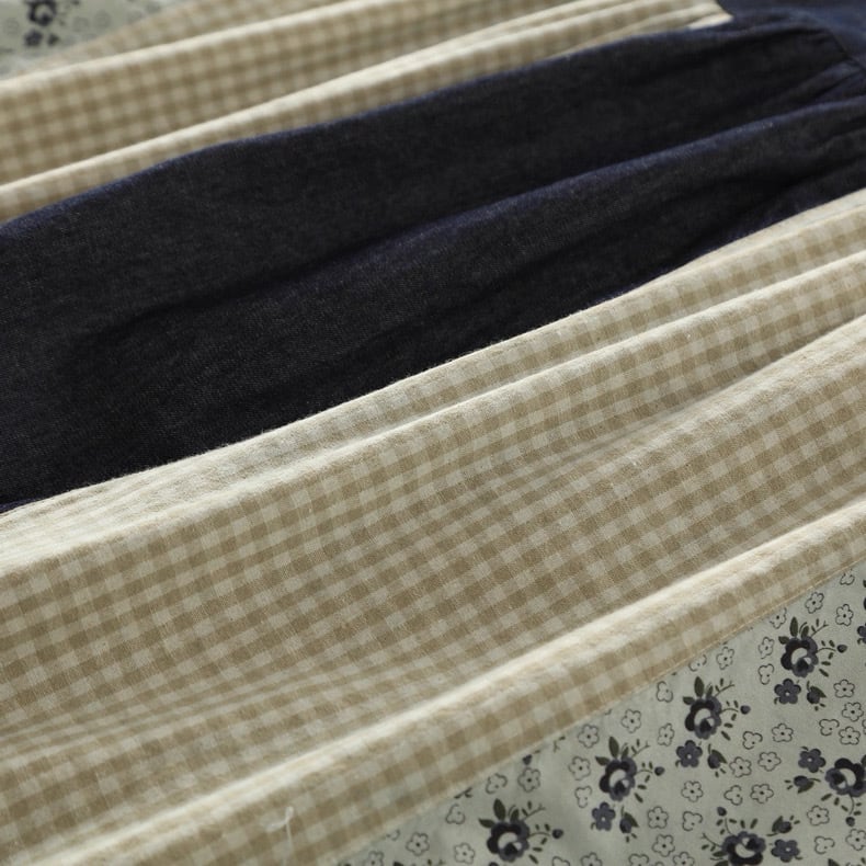 デニム生地を上身頃に使い、スカート部分をチェック柄や小花柄で切り替えたパッチワーク風のワンピースです。