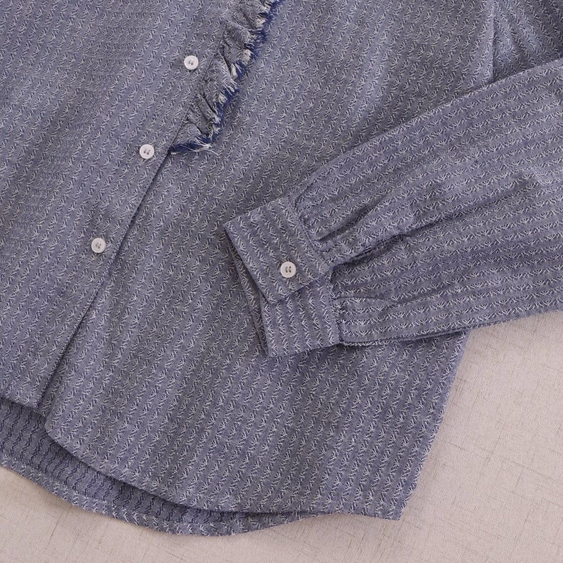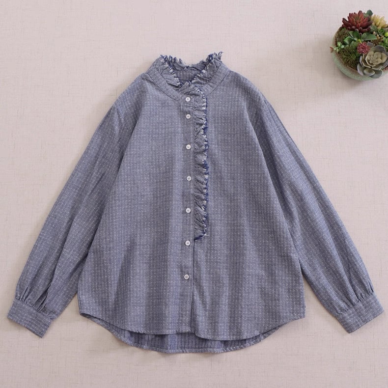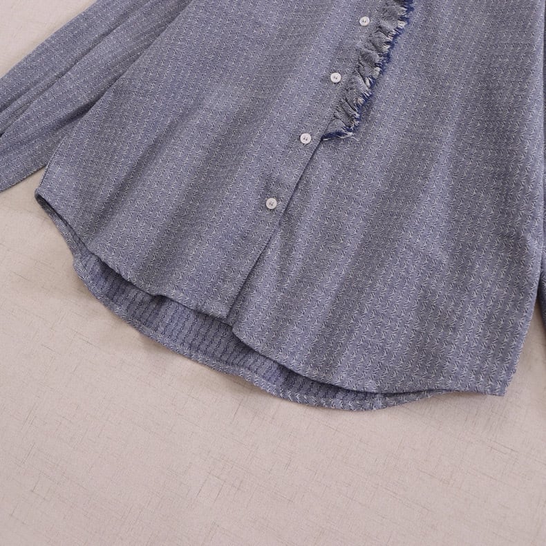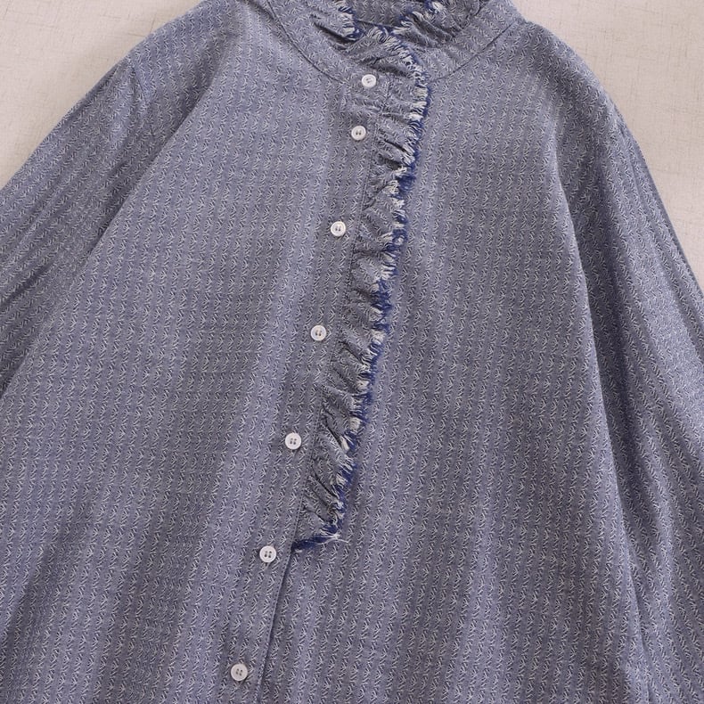 首元と前立てにあしらったフリンジがアクセントになったスタンドカラーブラウス。