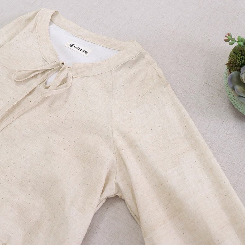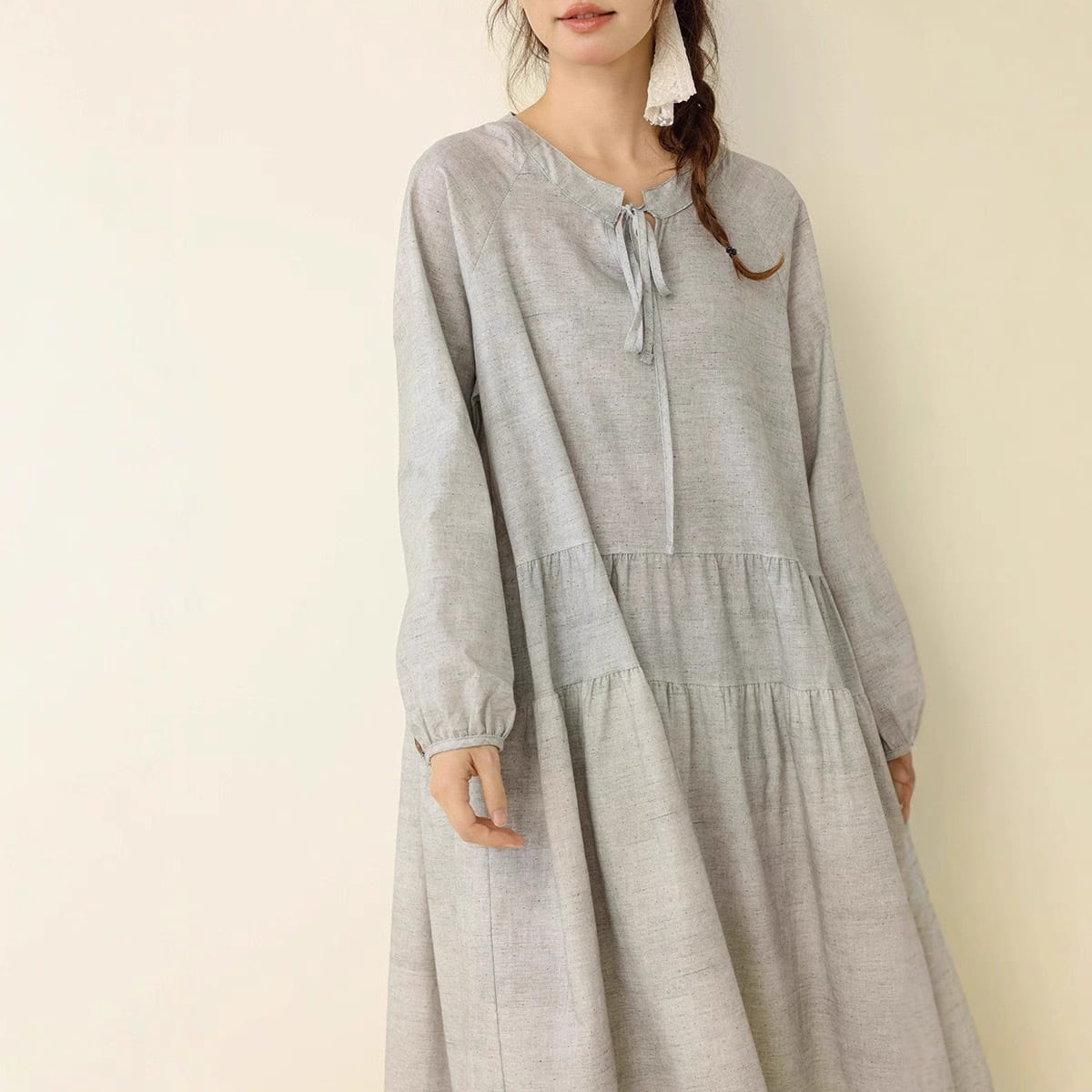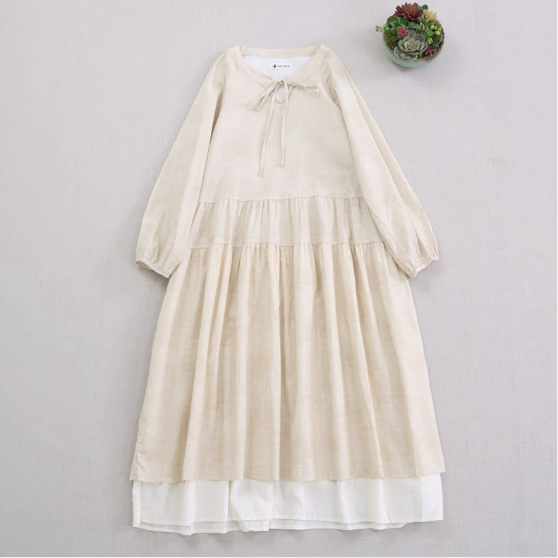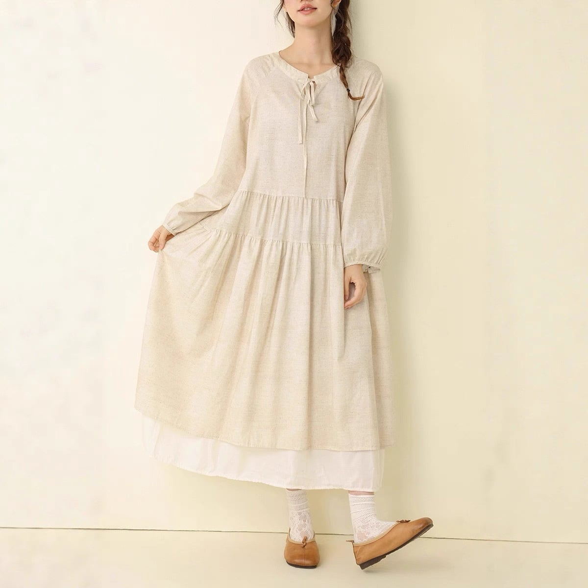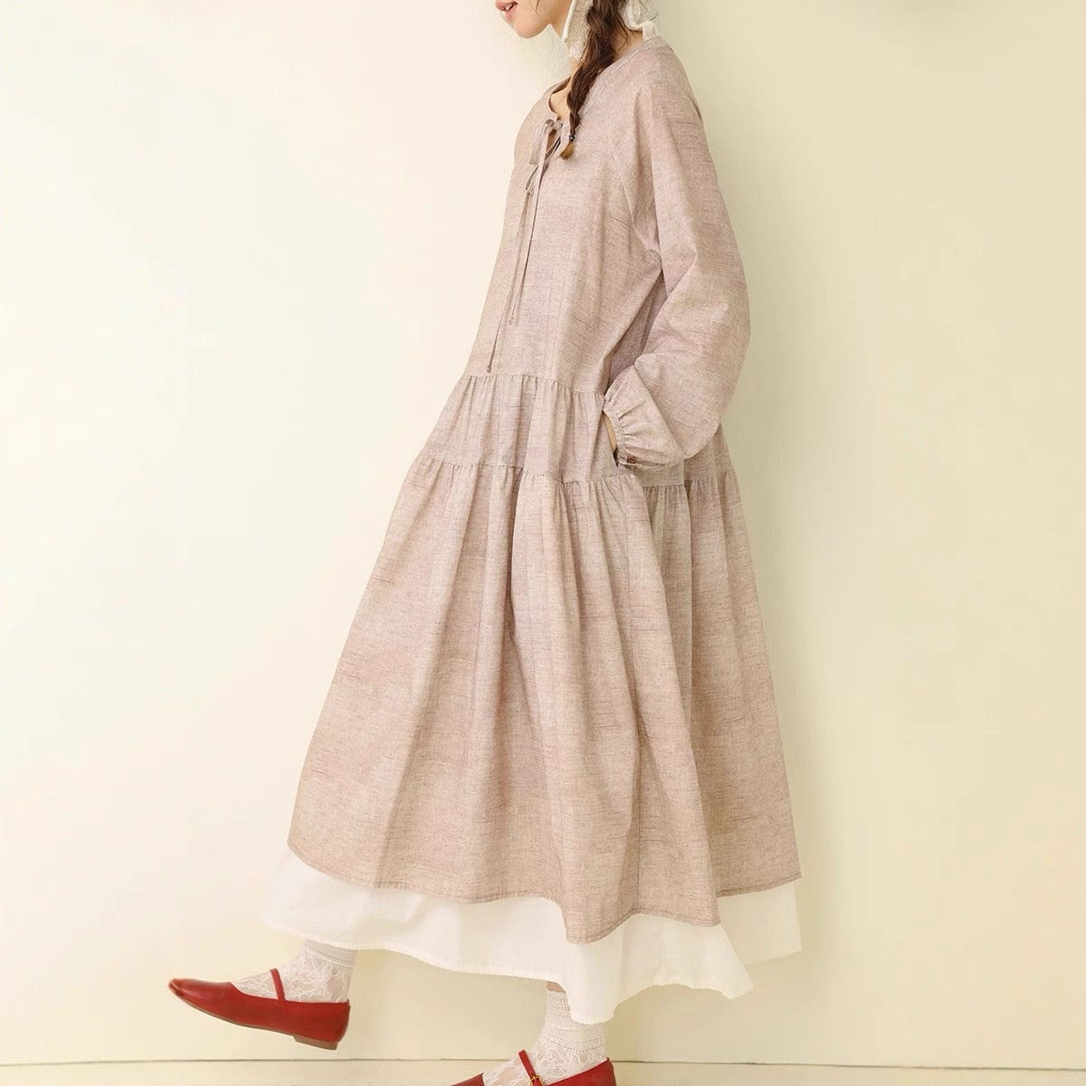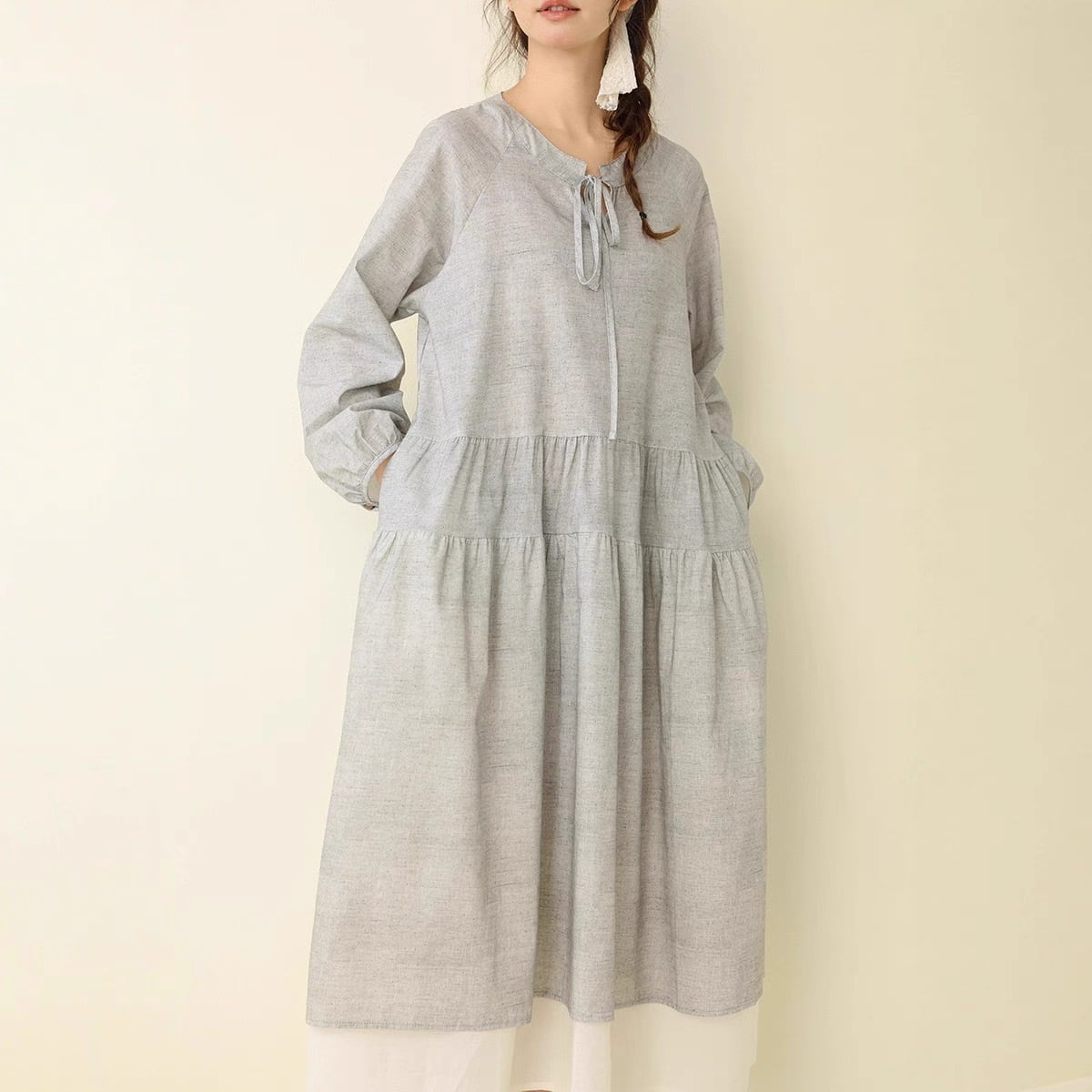 首元に結びリボンをあしらった、やさしい雰囲気のワンピース。
