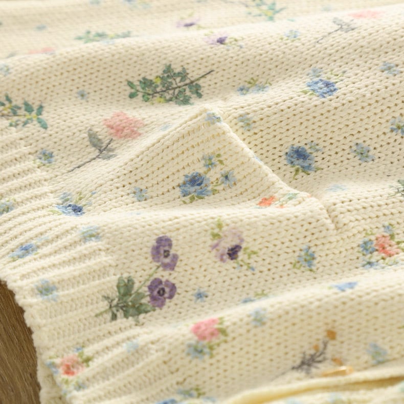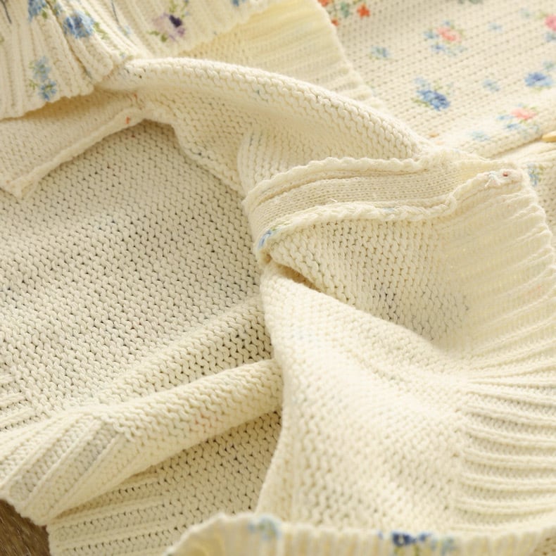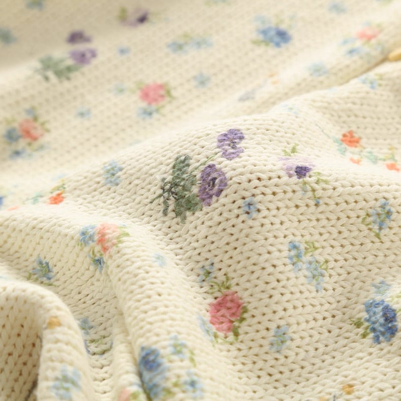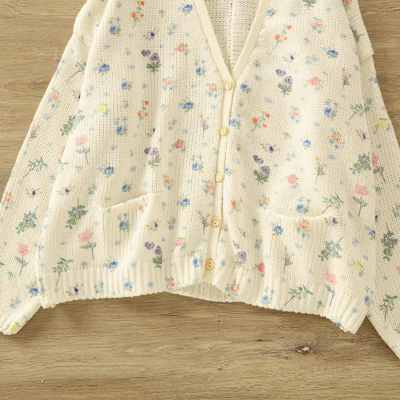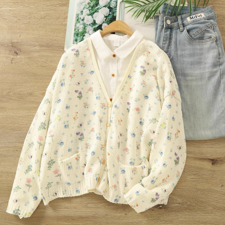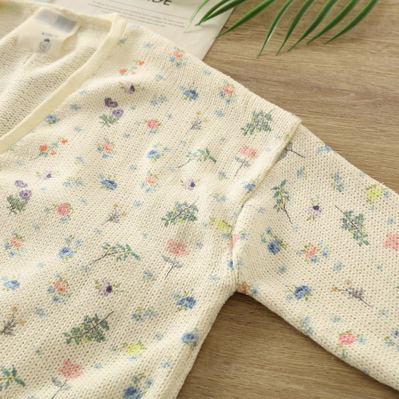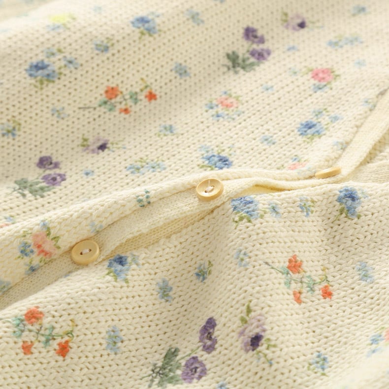 ぽつぽつと咲いた野の花をちりばめたようなニットカーディガン。