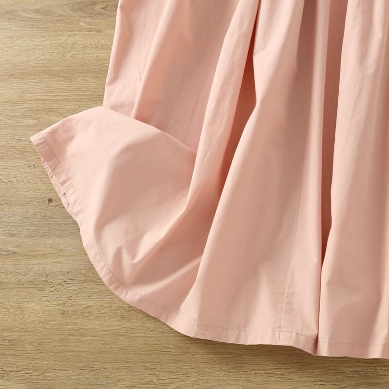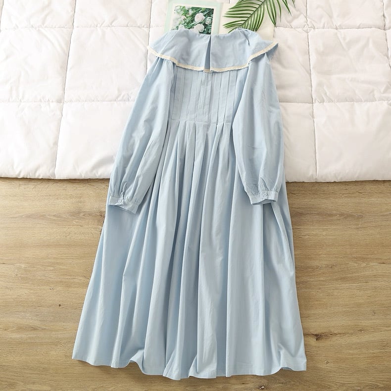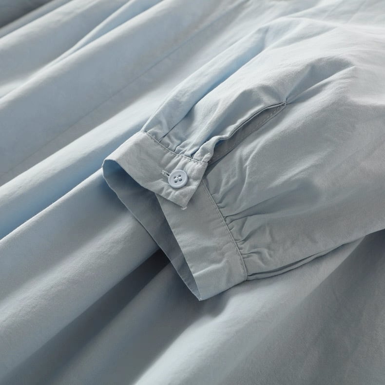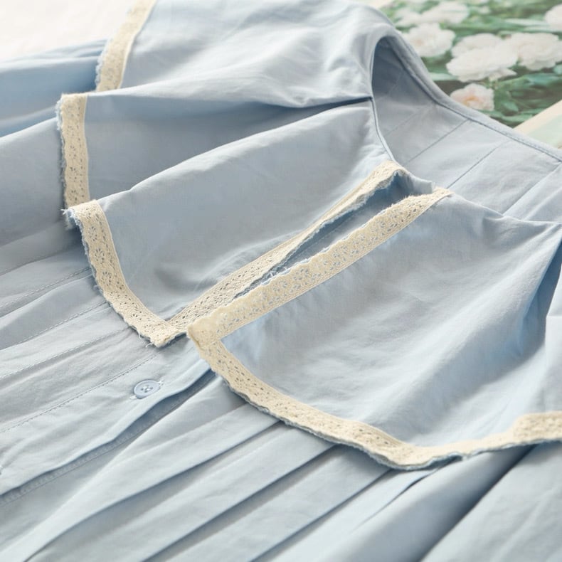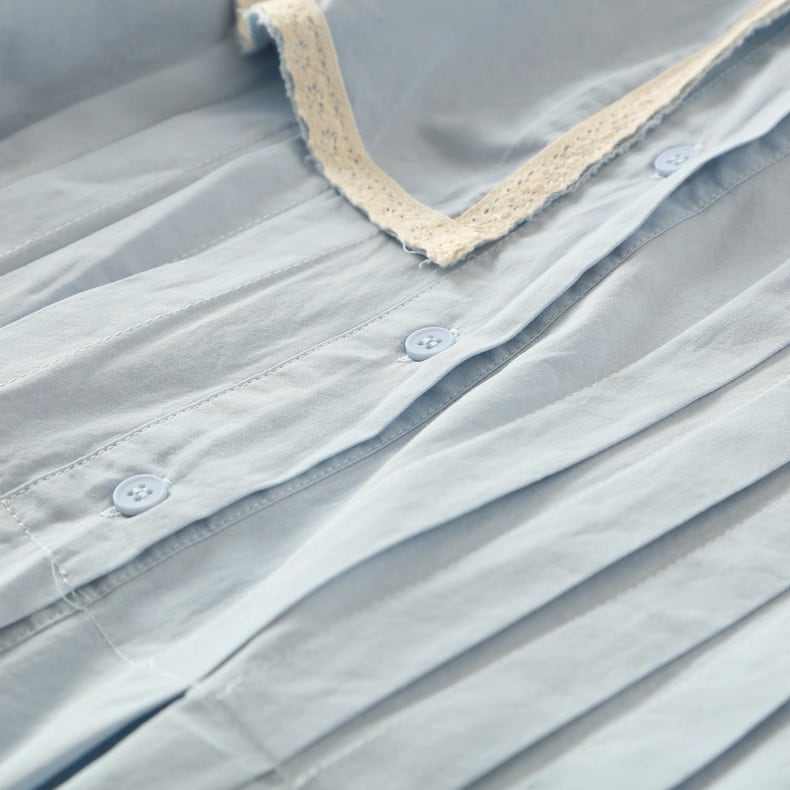 胸元のピンタックと小さなボタンが、クラシカルな雰囲気を添えています。