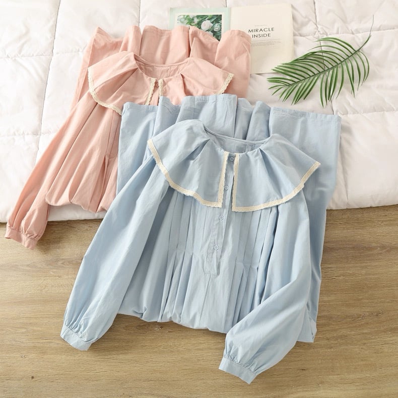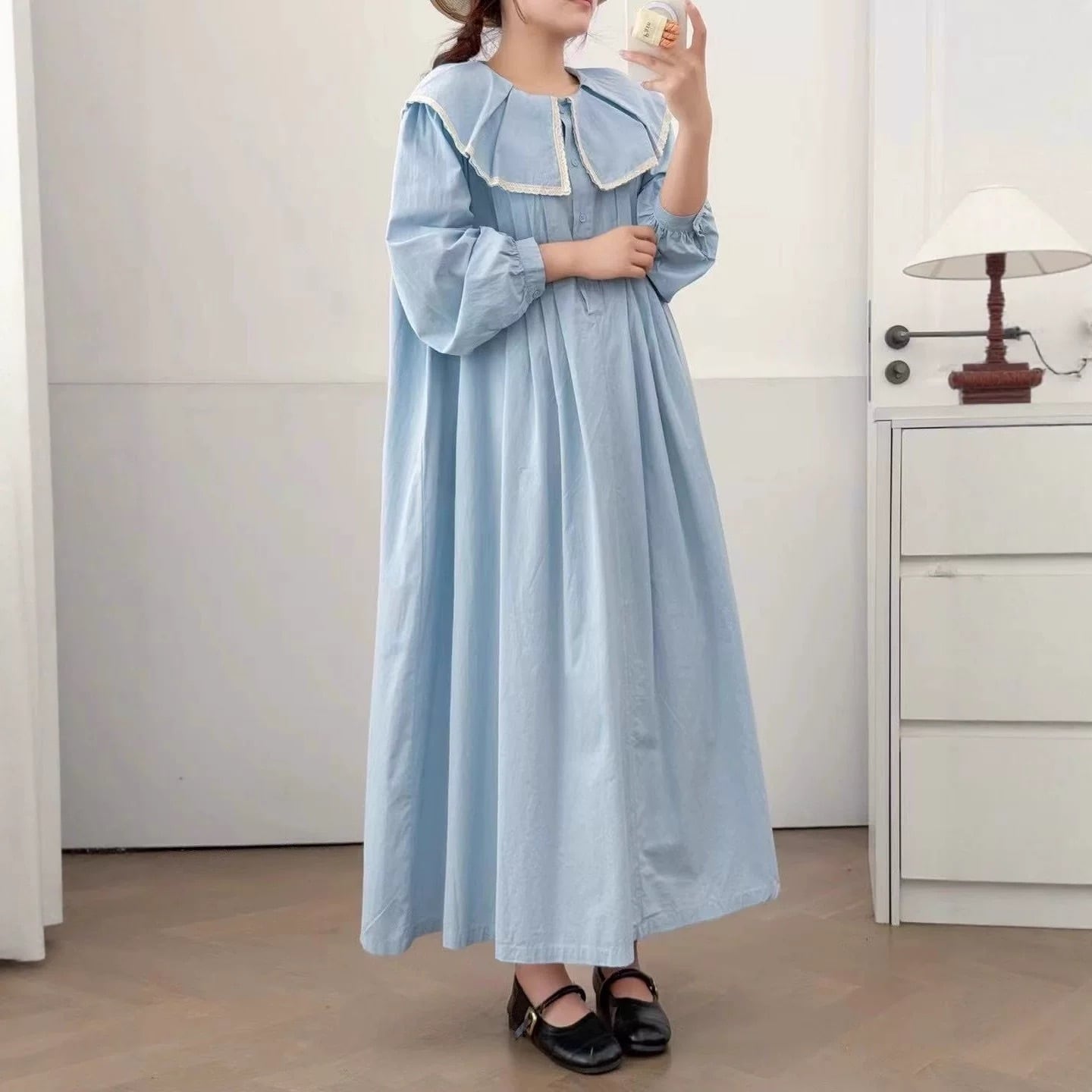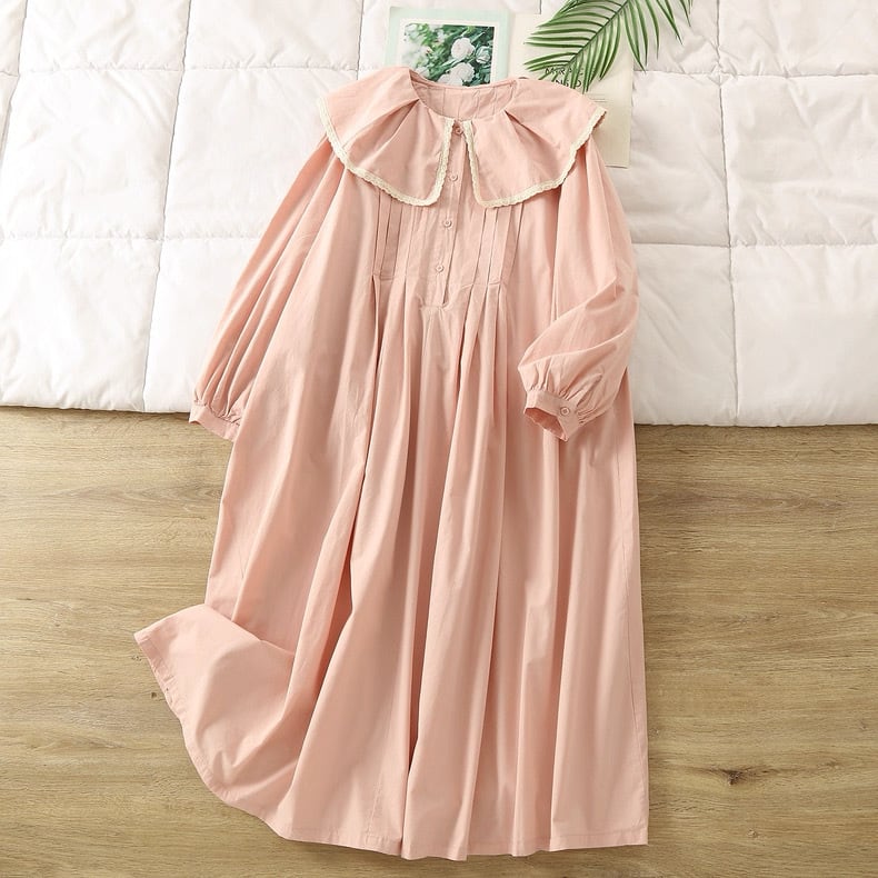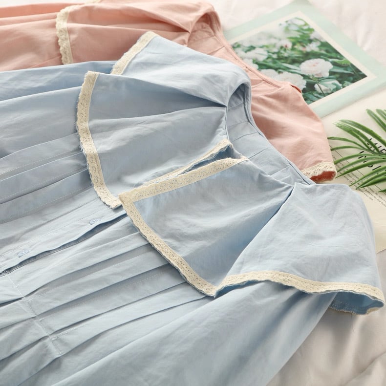 胸元のピンタックと小さなボタンが、クラシカルな雰囲気を添えています。