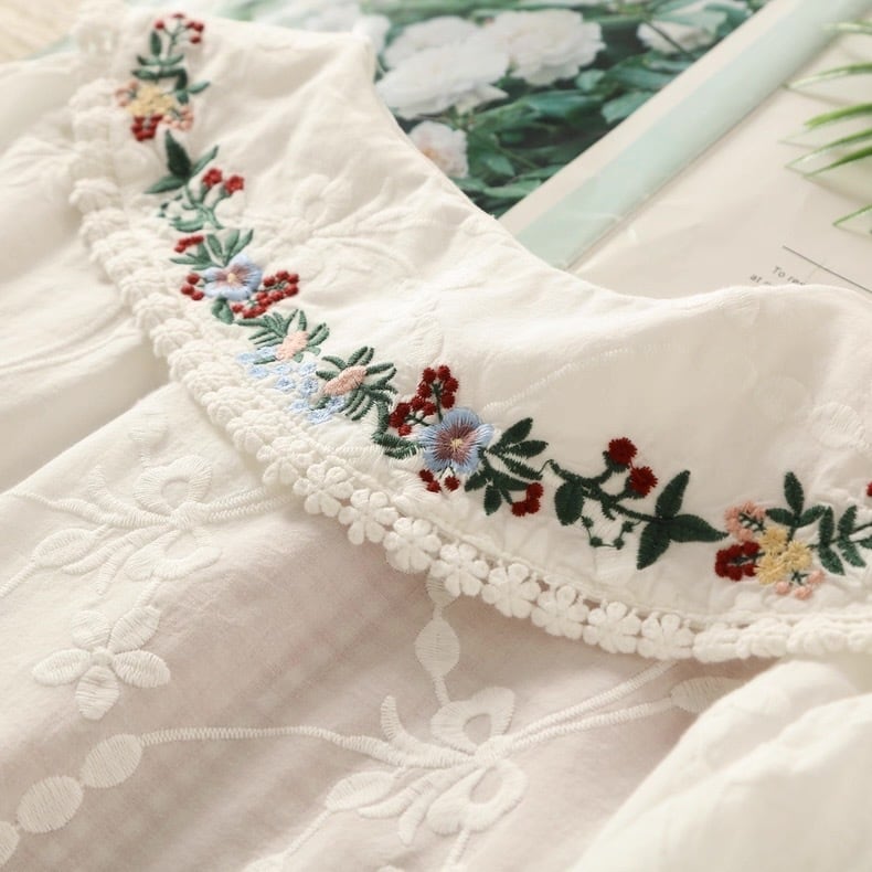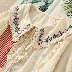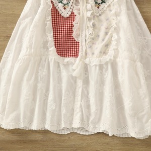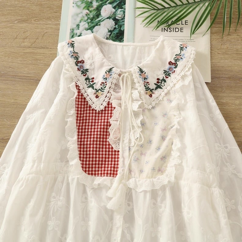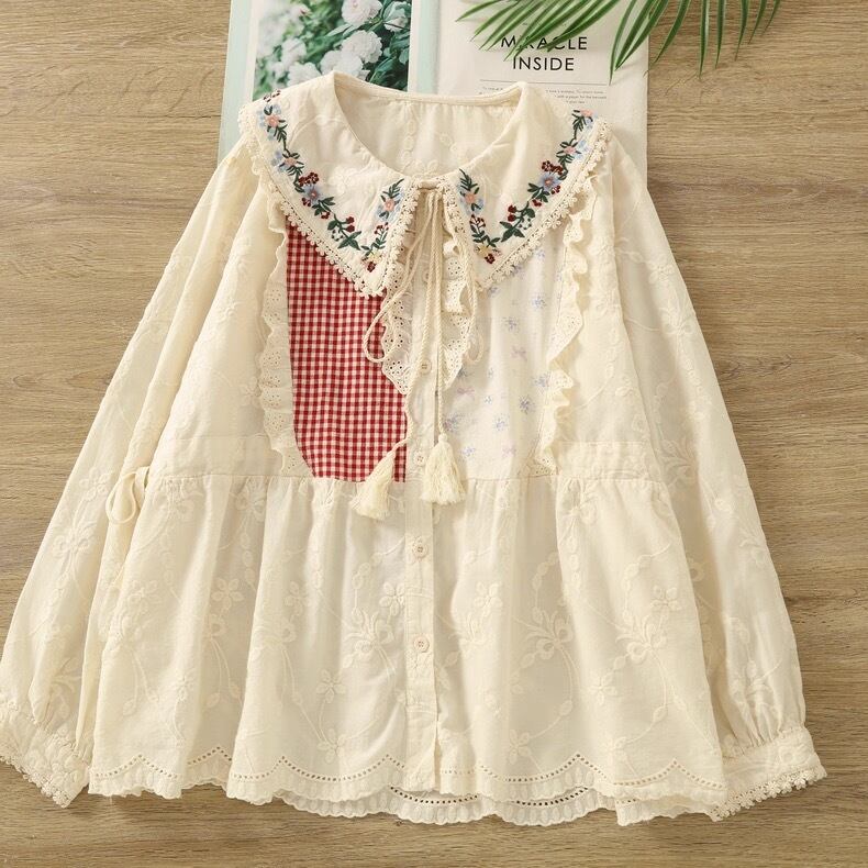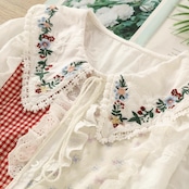 小花刺繍の大きな襟と、パッチワーク風の赤チェックが可愛いブラウス。レースのナチュラルな風合いで、素朴で愛らしいカントリースタイルにぴったりです。