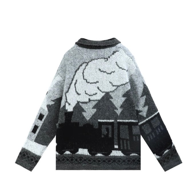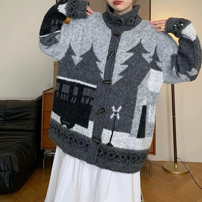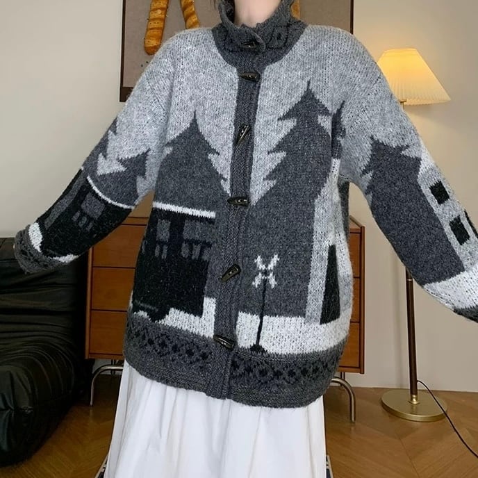 トグルボタンの森のコテージ柄ニットカーディガン 2color fu0884