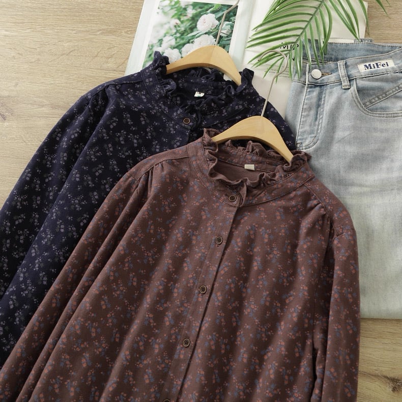 首もとと袖口のフリルがほどよいアクセントになり、カーディガンやニットとの重ね着にもおすすめです。