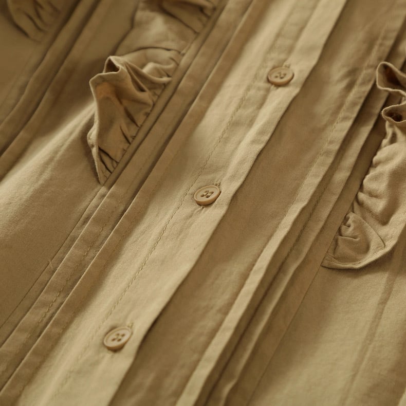 フロントに施したピンタックとフリルが目を引く前開きブラウスです。