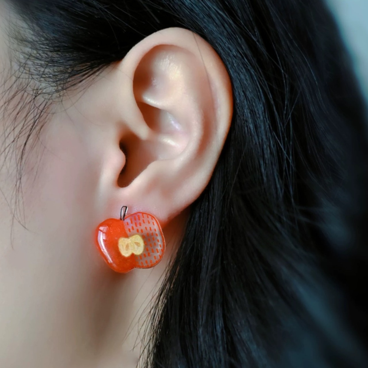 手描きタッチのアヒルとりんごをモチーフにした、左右で異なるデザインのアシンメトリーピアスです。