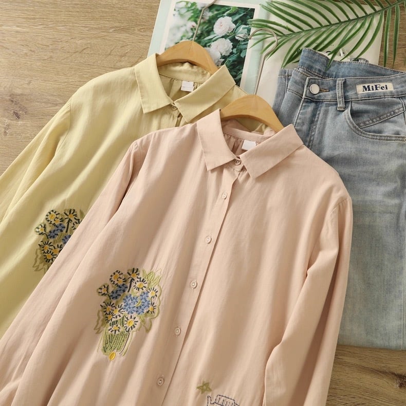 落ち着いたカラーに、花かごやフラワーベースの刺繍をほどこしたブラウス。