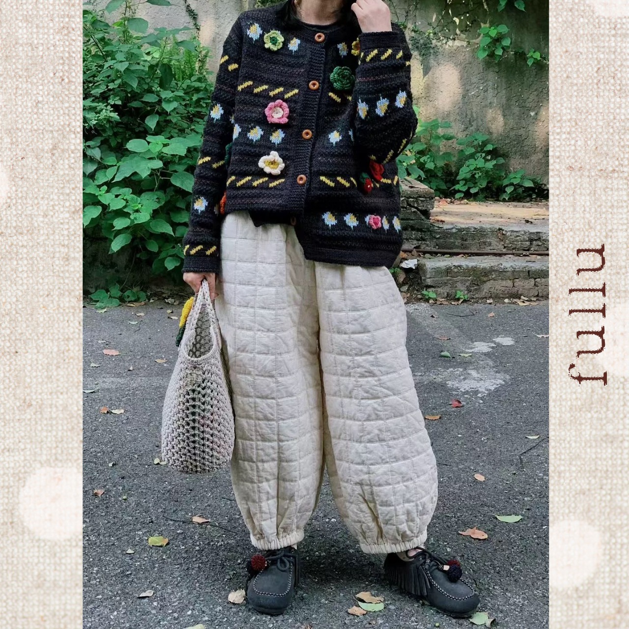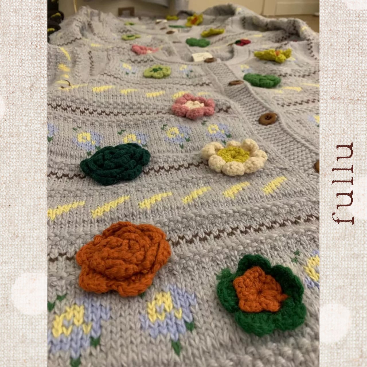 花柄の編み込みと立体モチーフを組み合わせたカーディガンです。