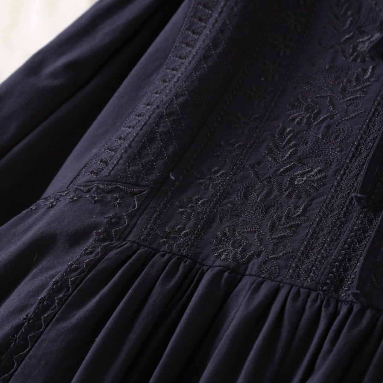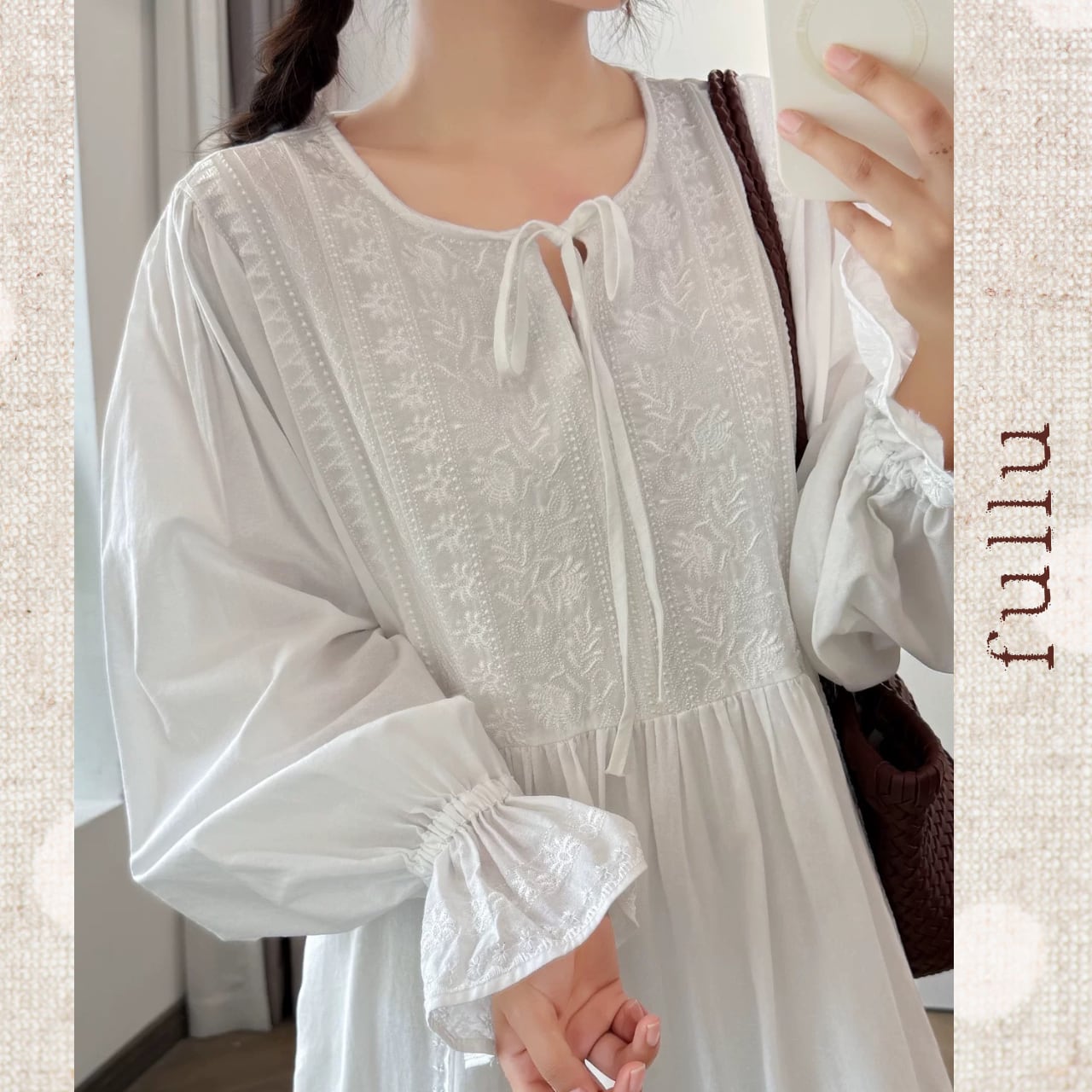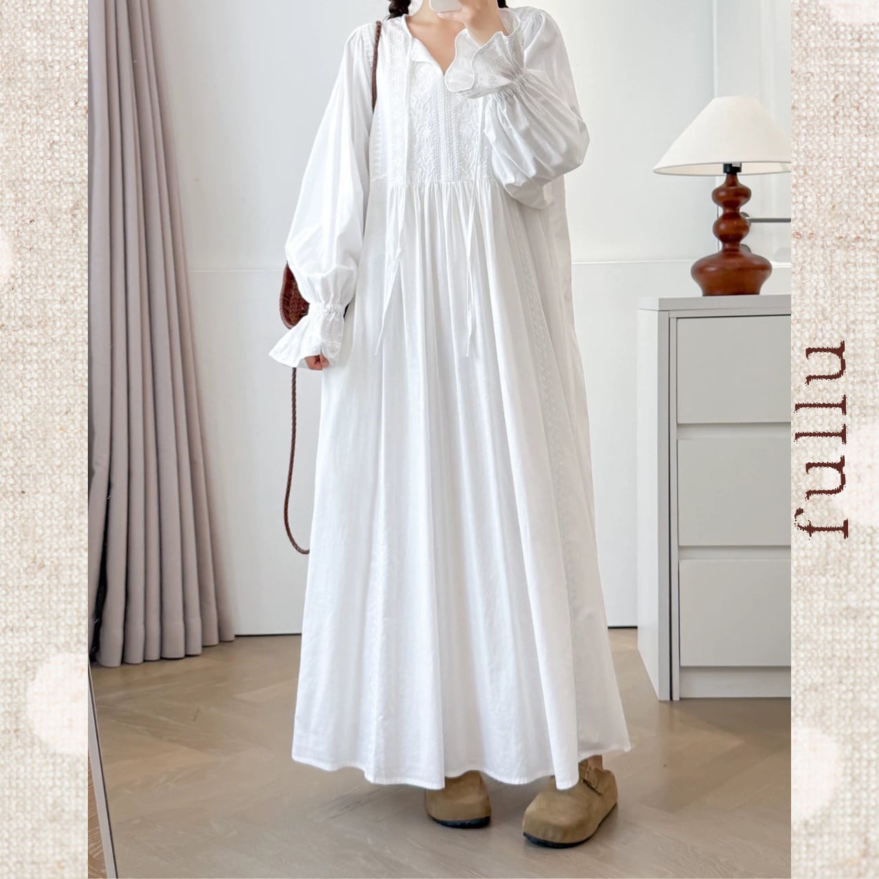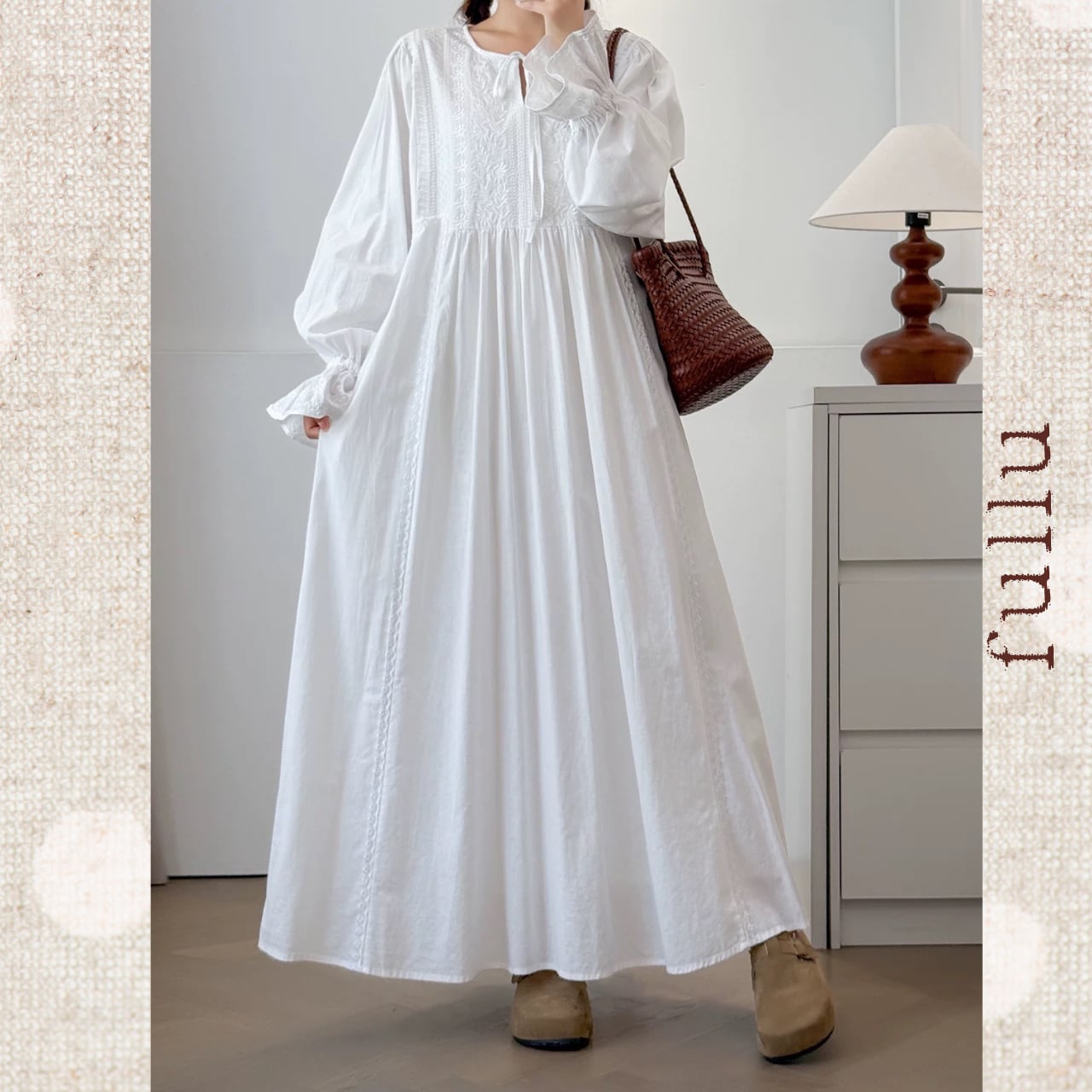 胸元からウエストにかけて施された刺繍切替が印象的なロングワンピース。