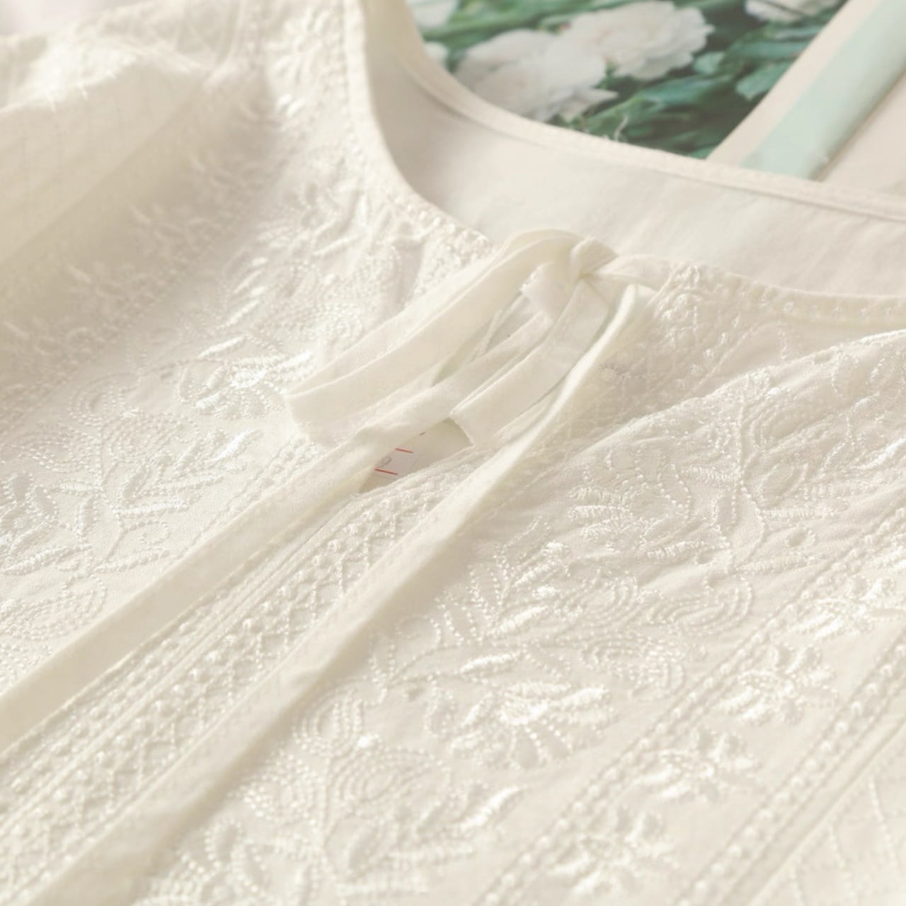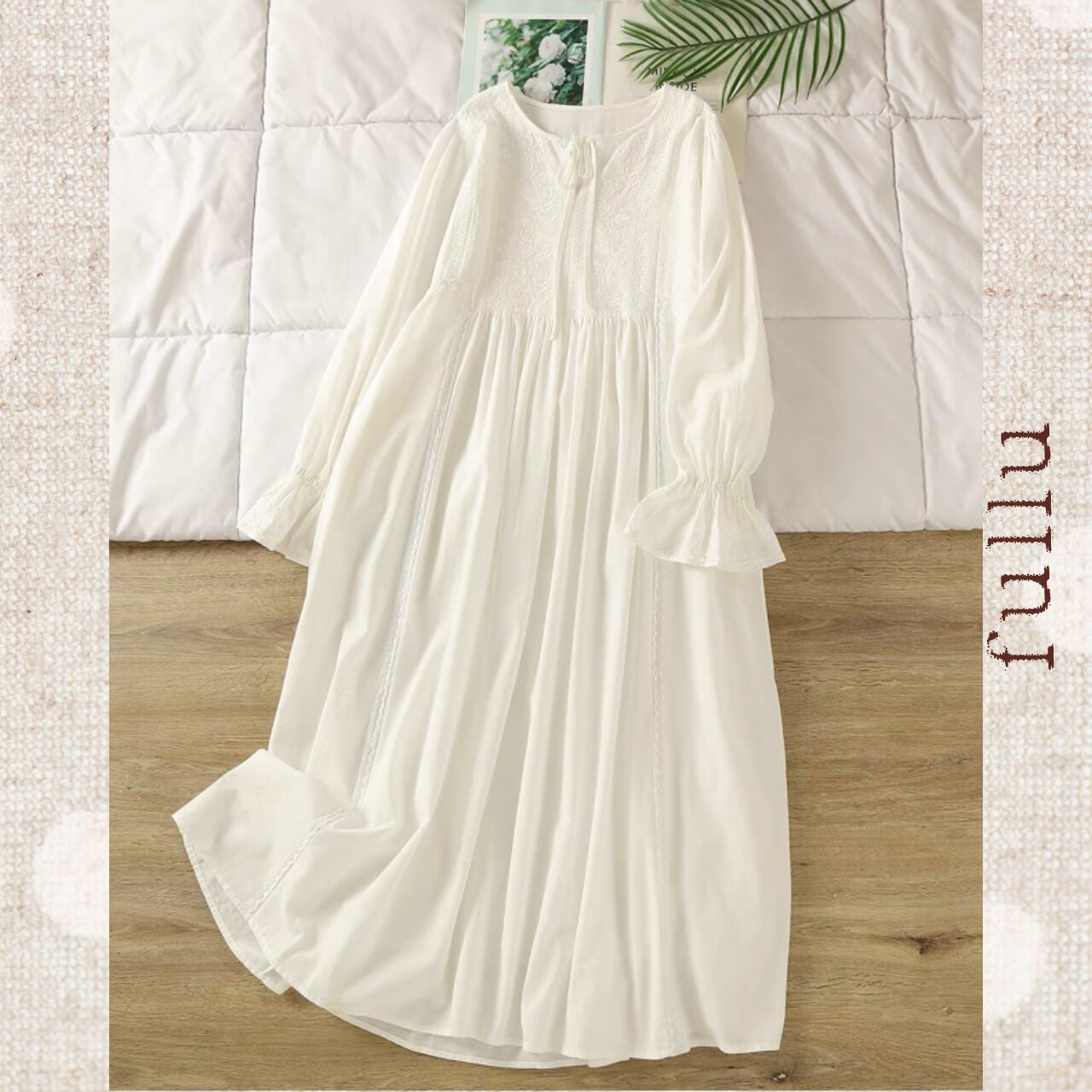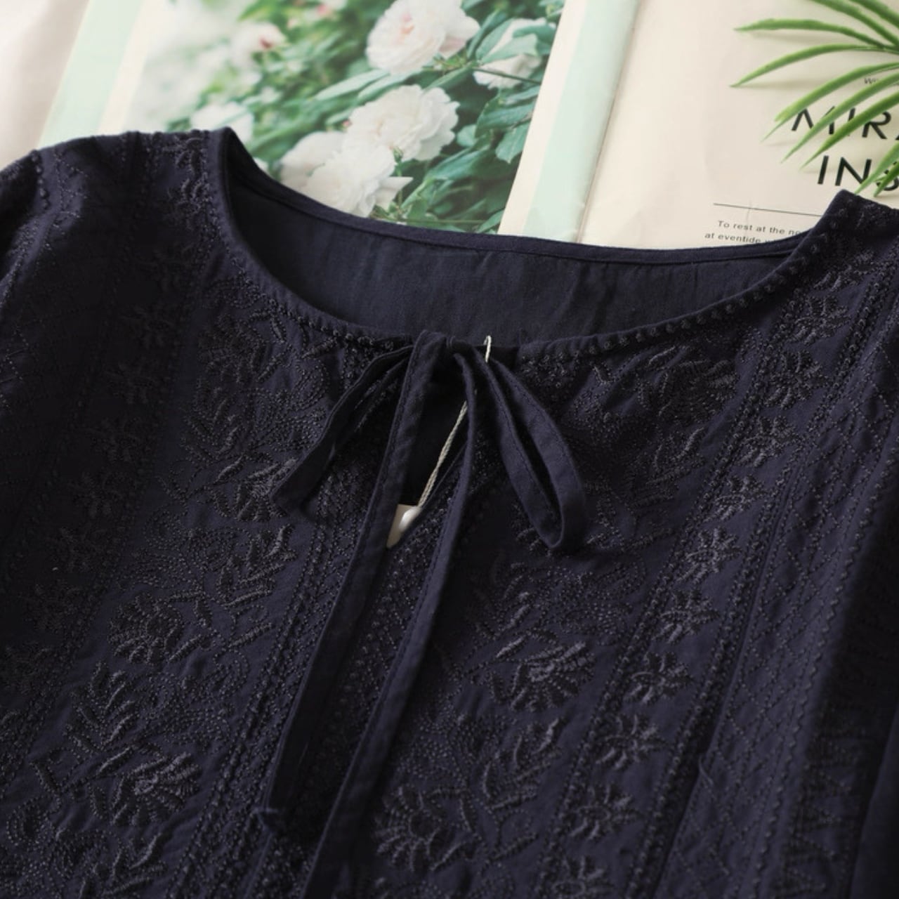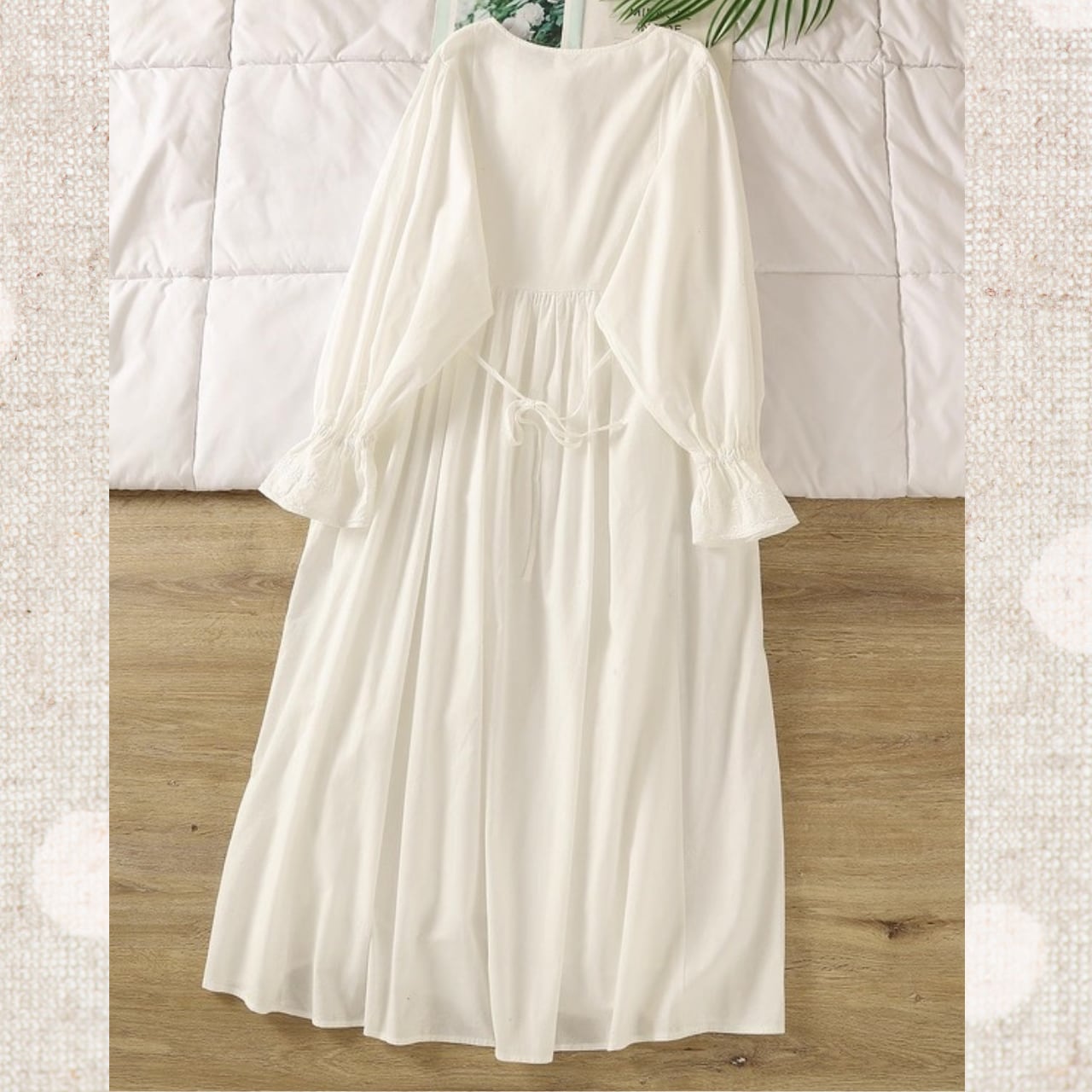 胸元からウエストにかけて施された刺繍切替が印象的なロングワンピース。