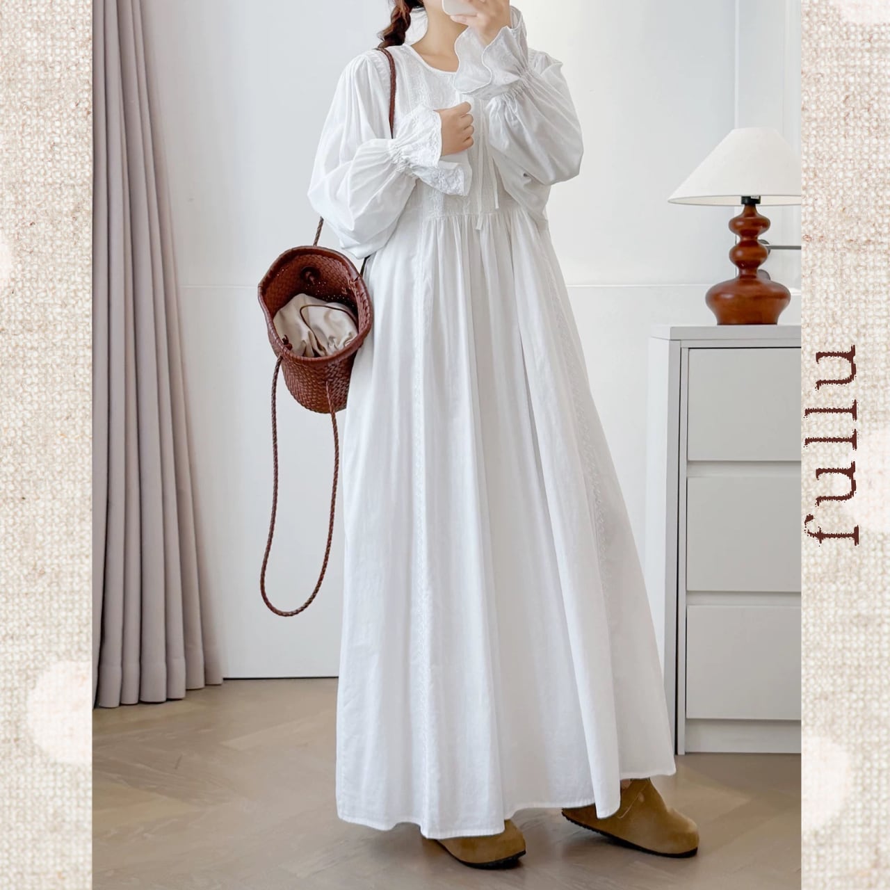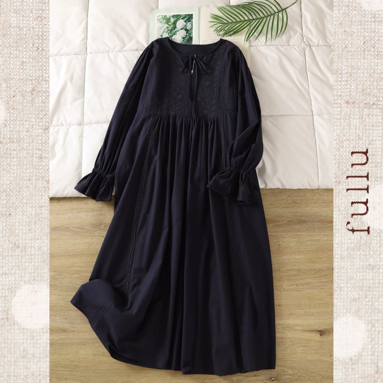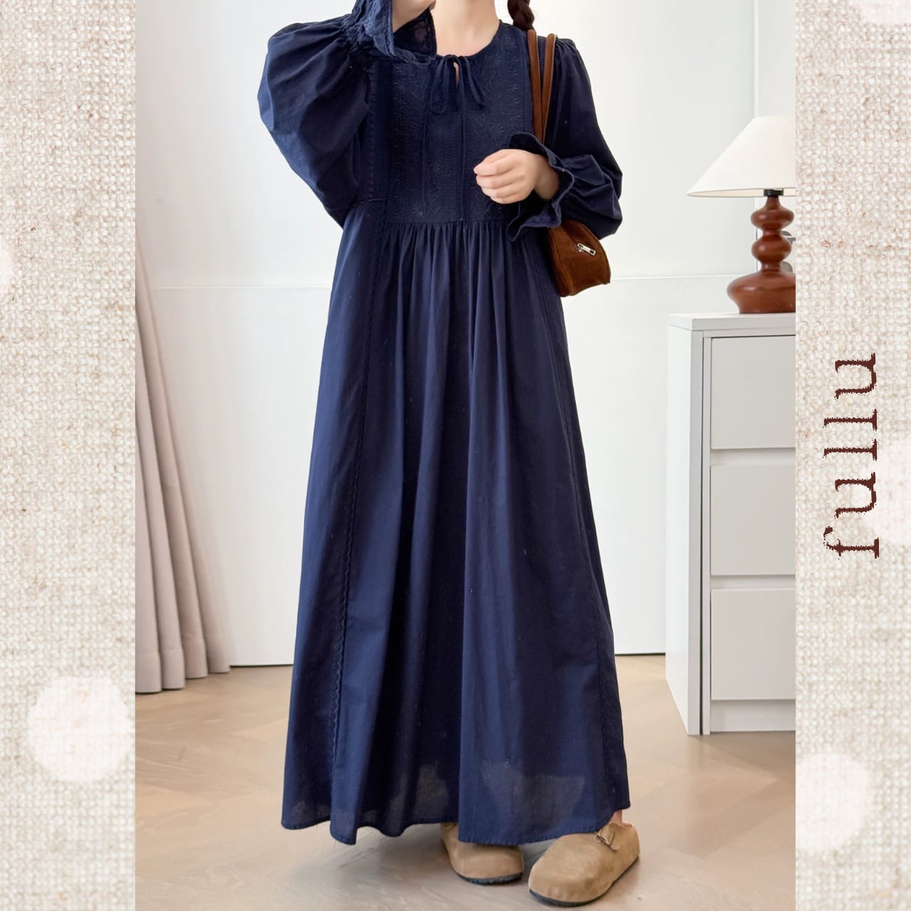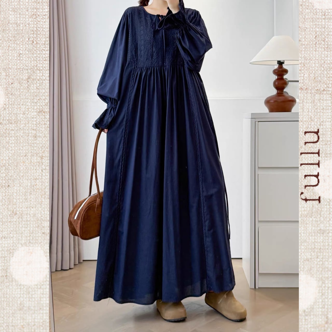 刺繍切替 ギャザーデザイン ロングワンピース 2color fu0913