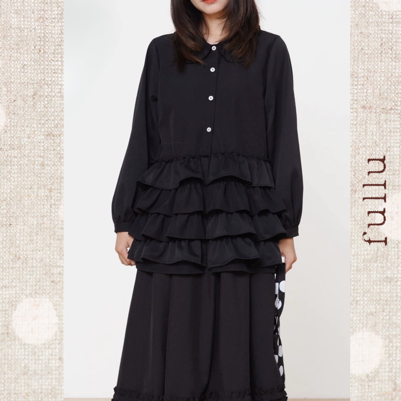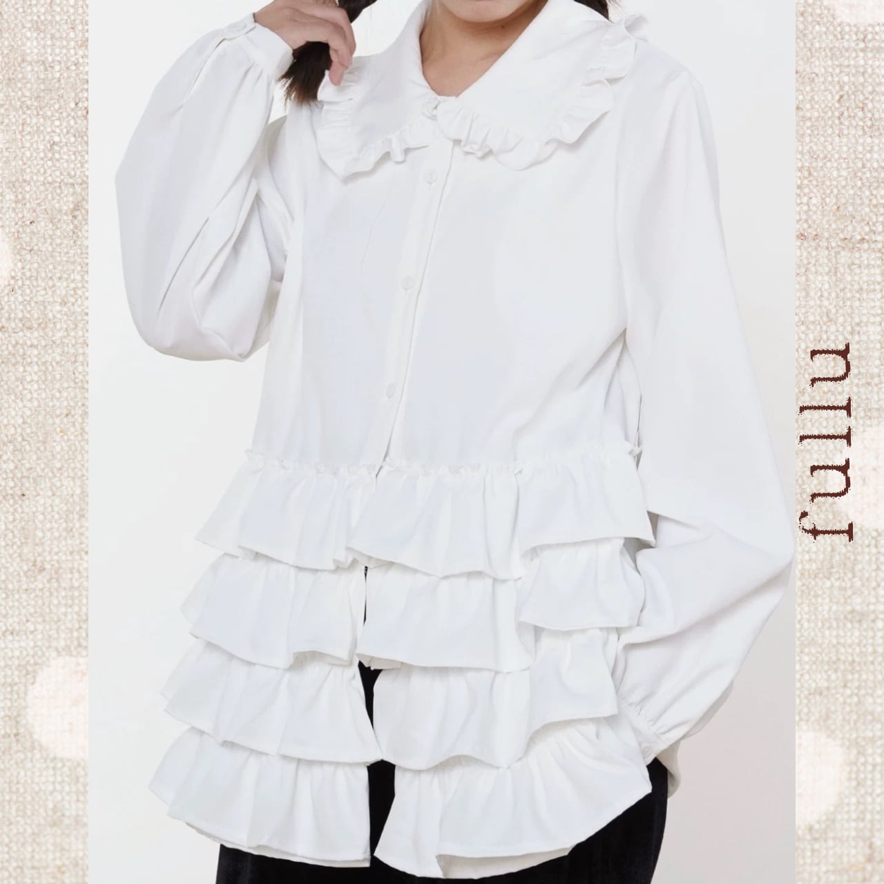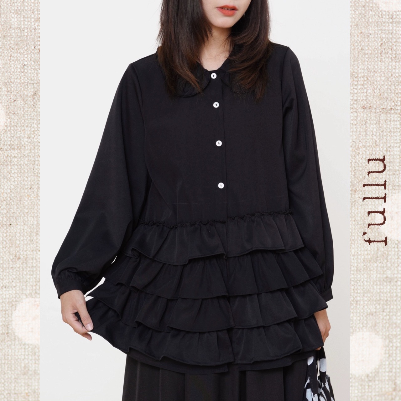 フロントに段状のフリルを重ねた、存在感のあるデザインブラウス。