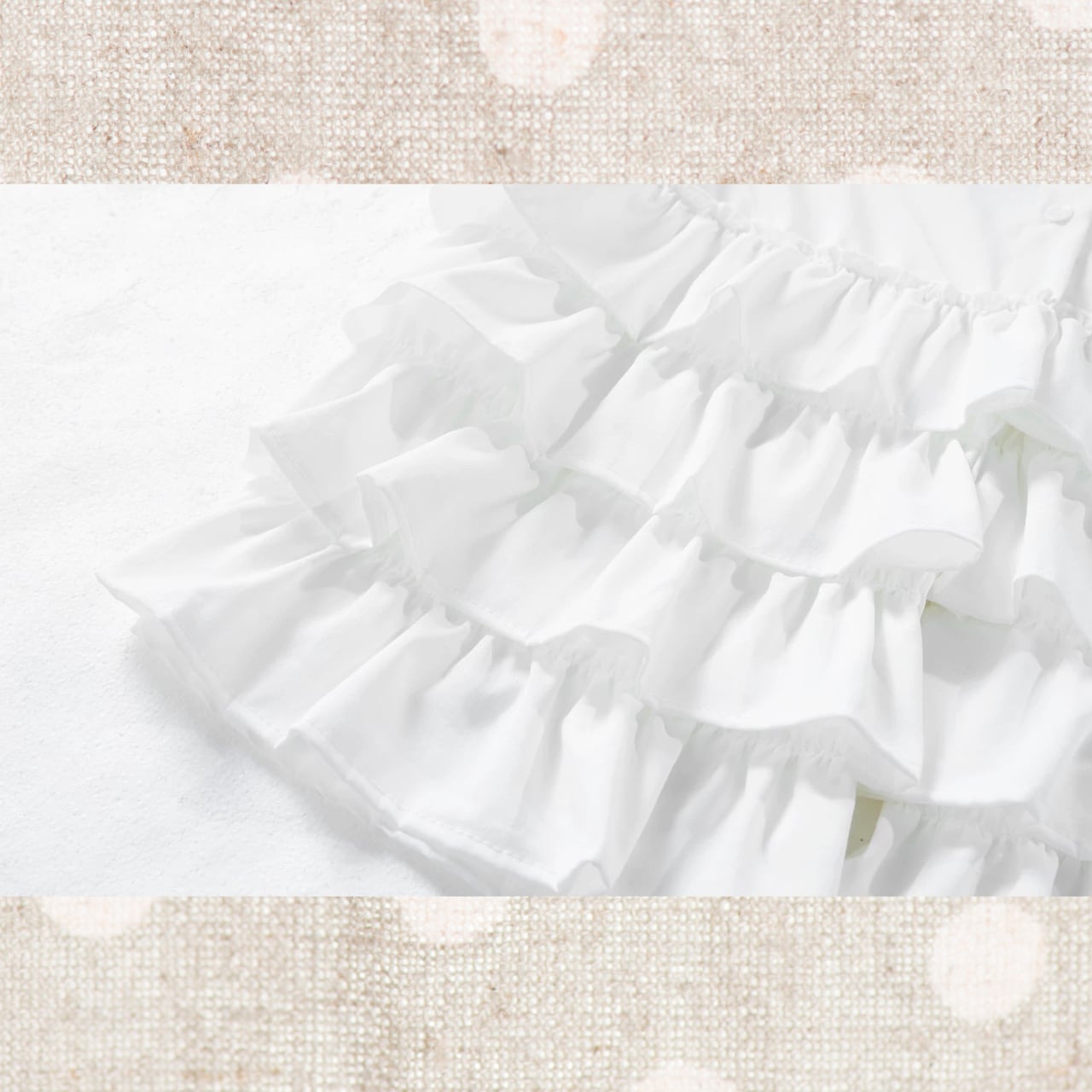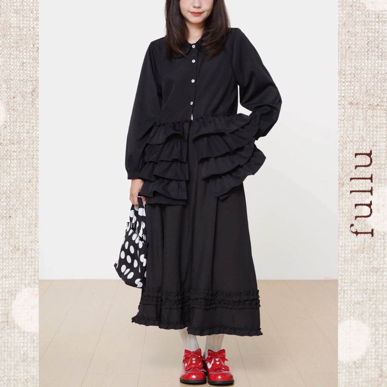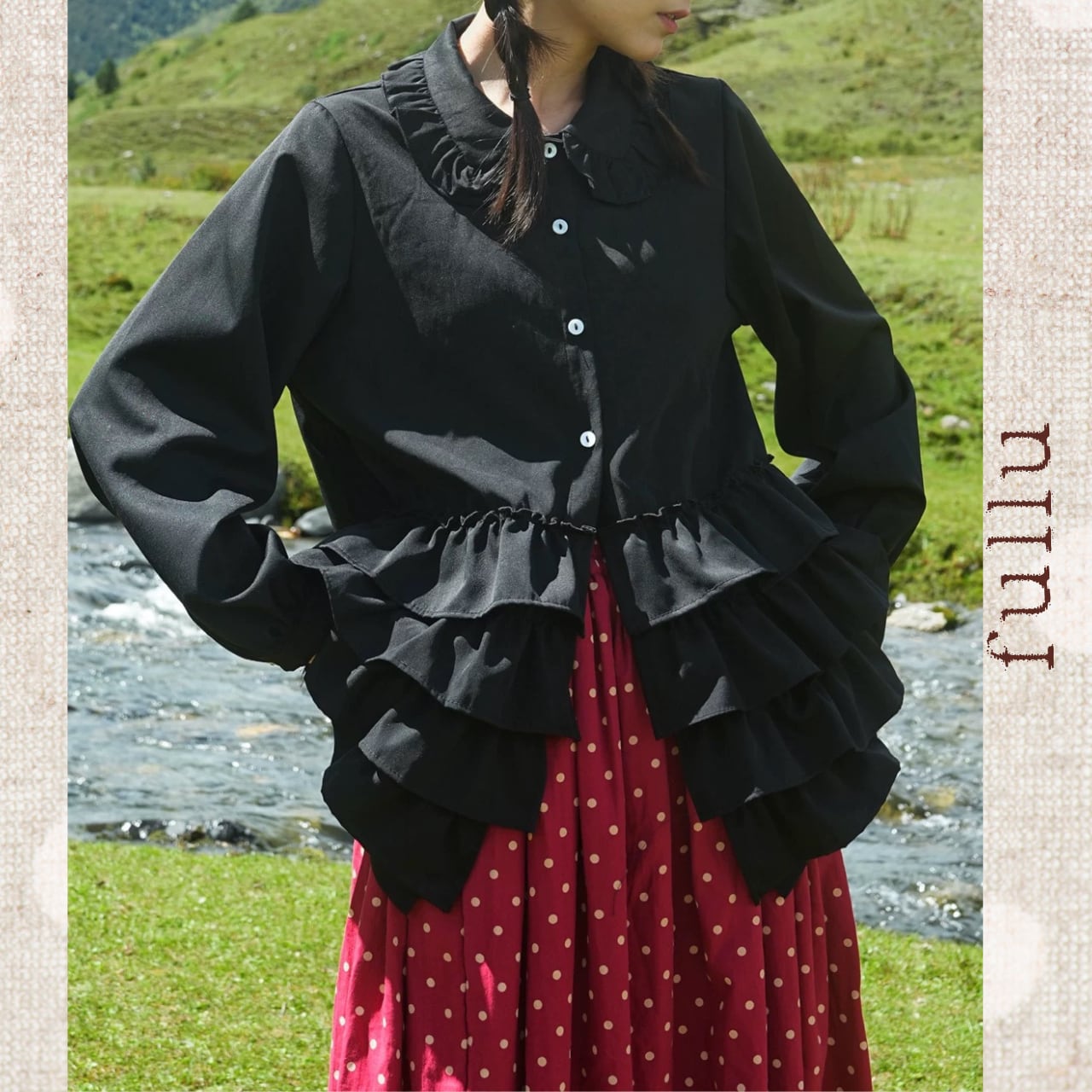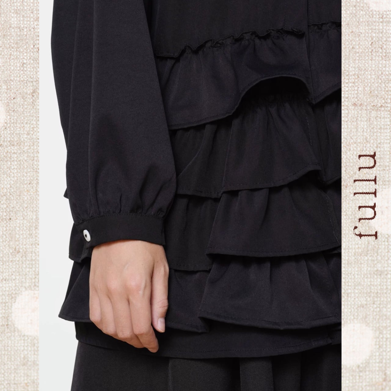 フロントに段状のフリルを重ねた、存在感のあるデザインブラウス。