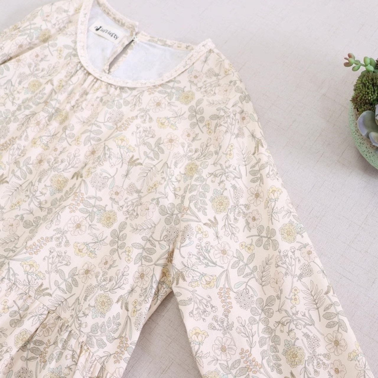 首元はラウンドネックですっきりと見せつつ、程よいギャザーが立体感をプラス。