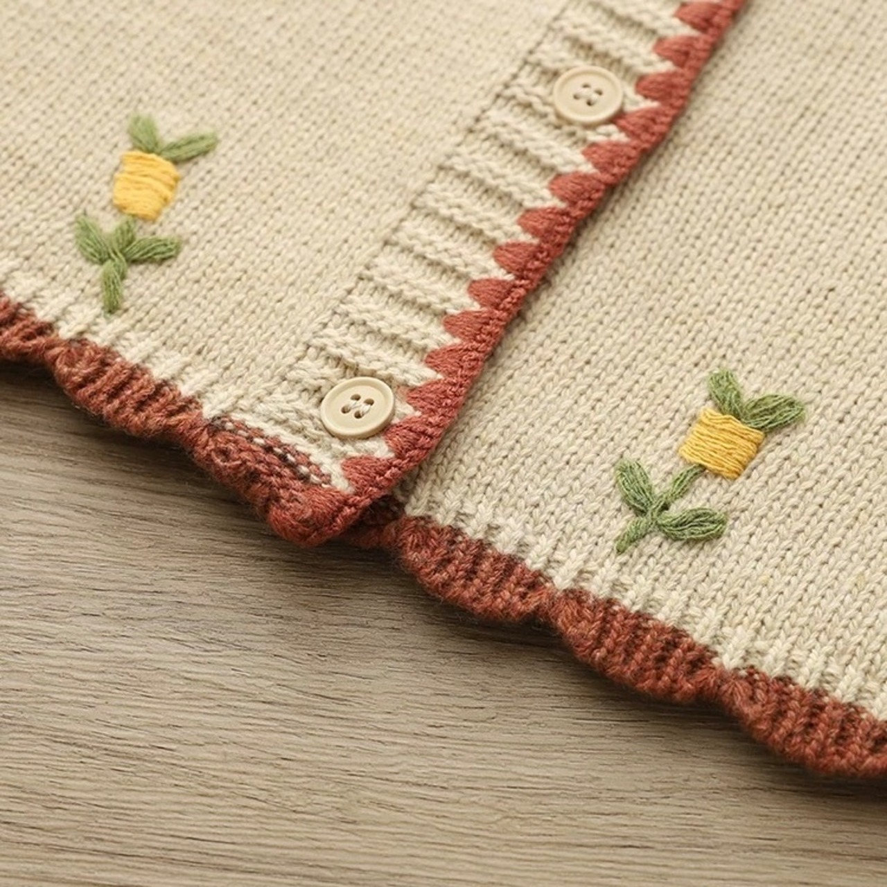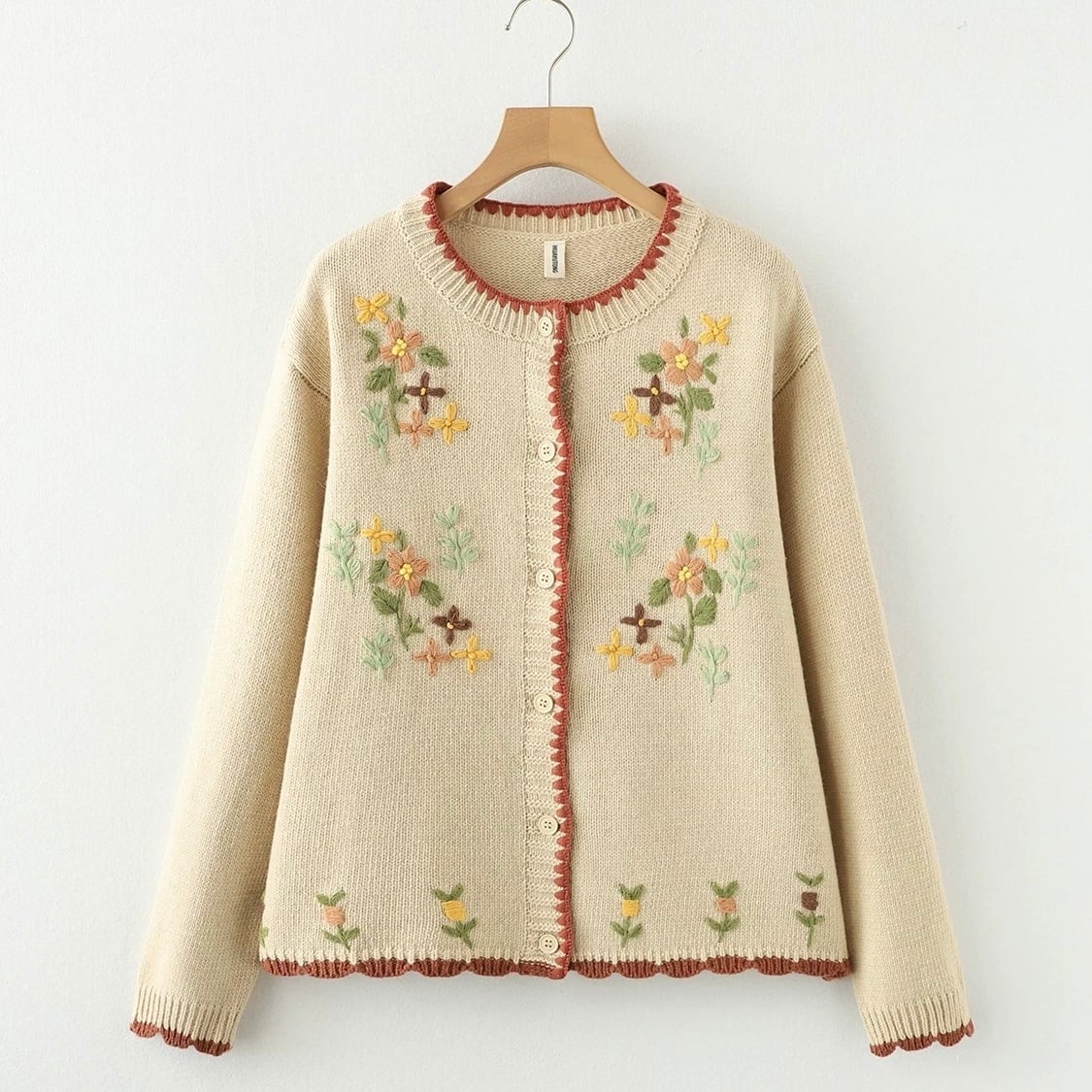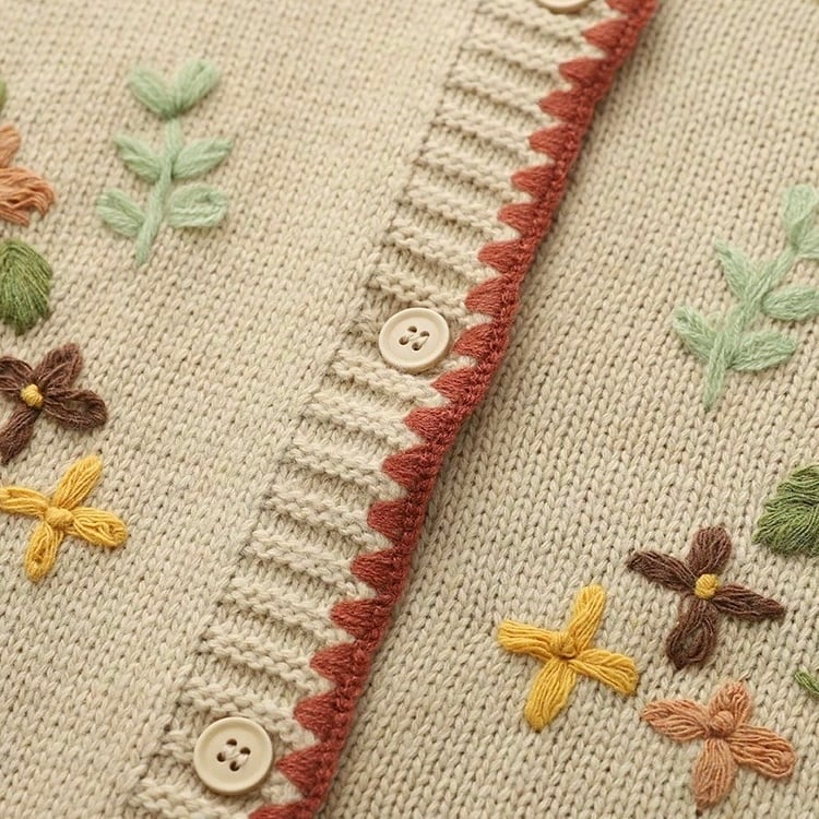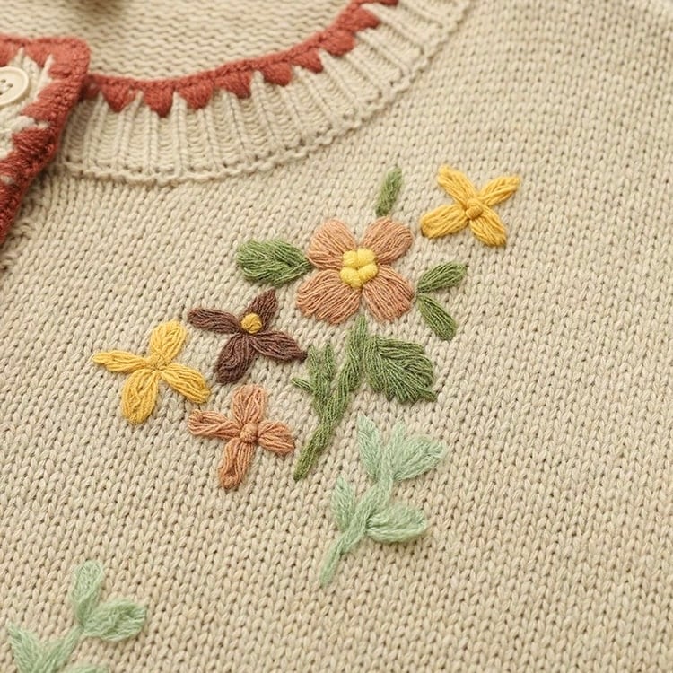 フロントと胸元に施した小花の刺繍が印象的なカーディガン。