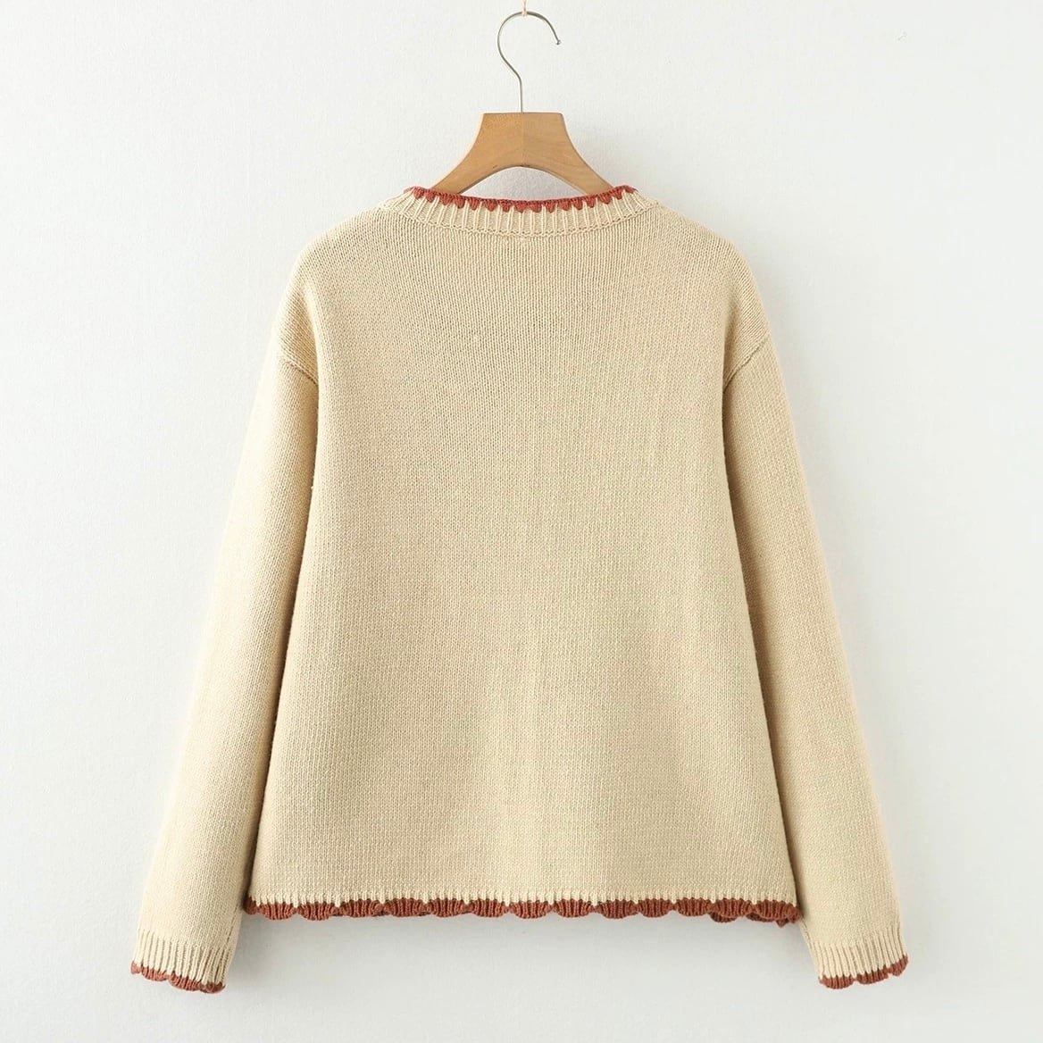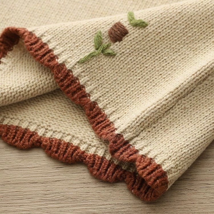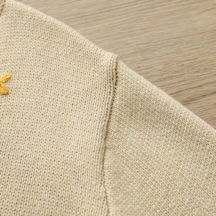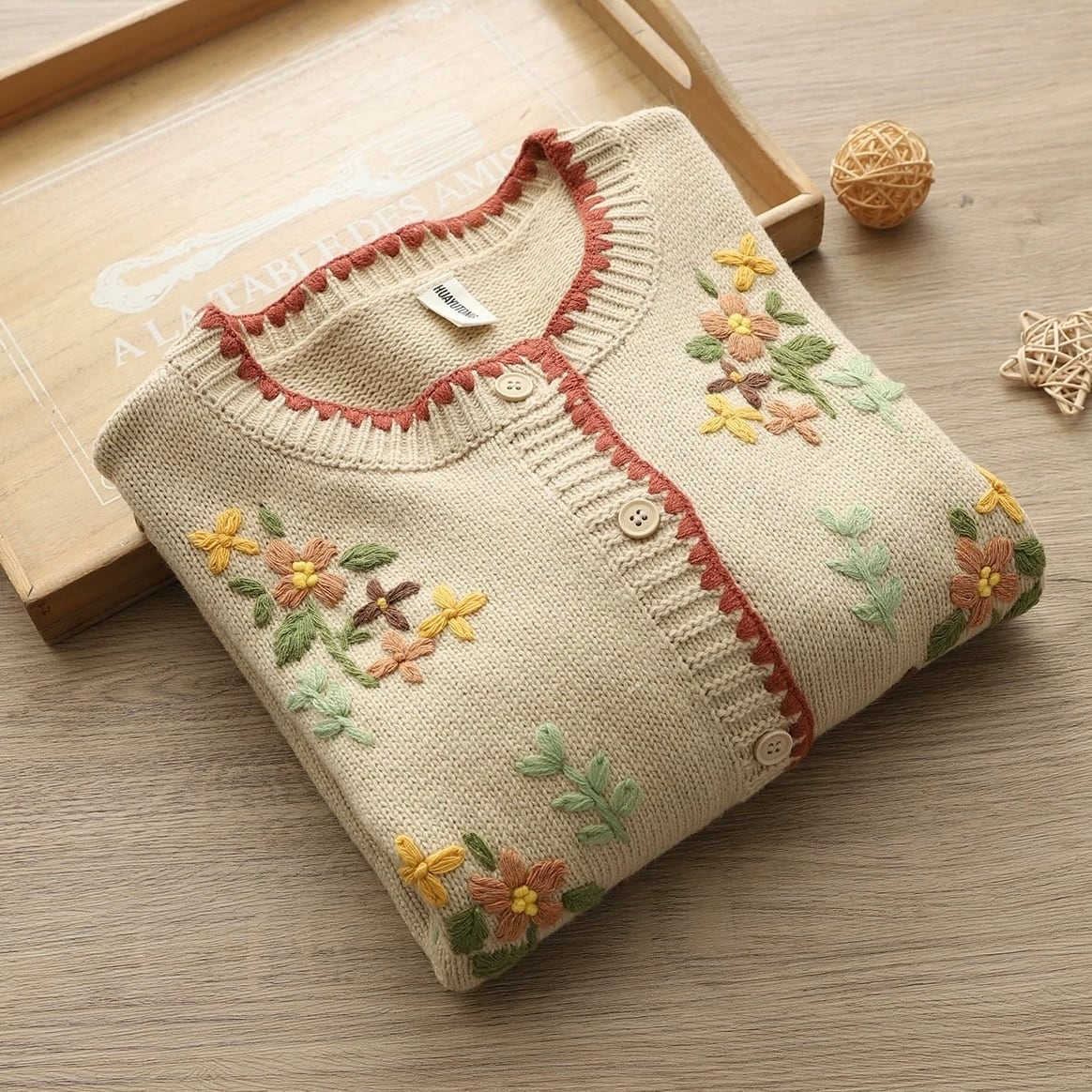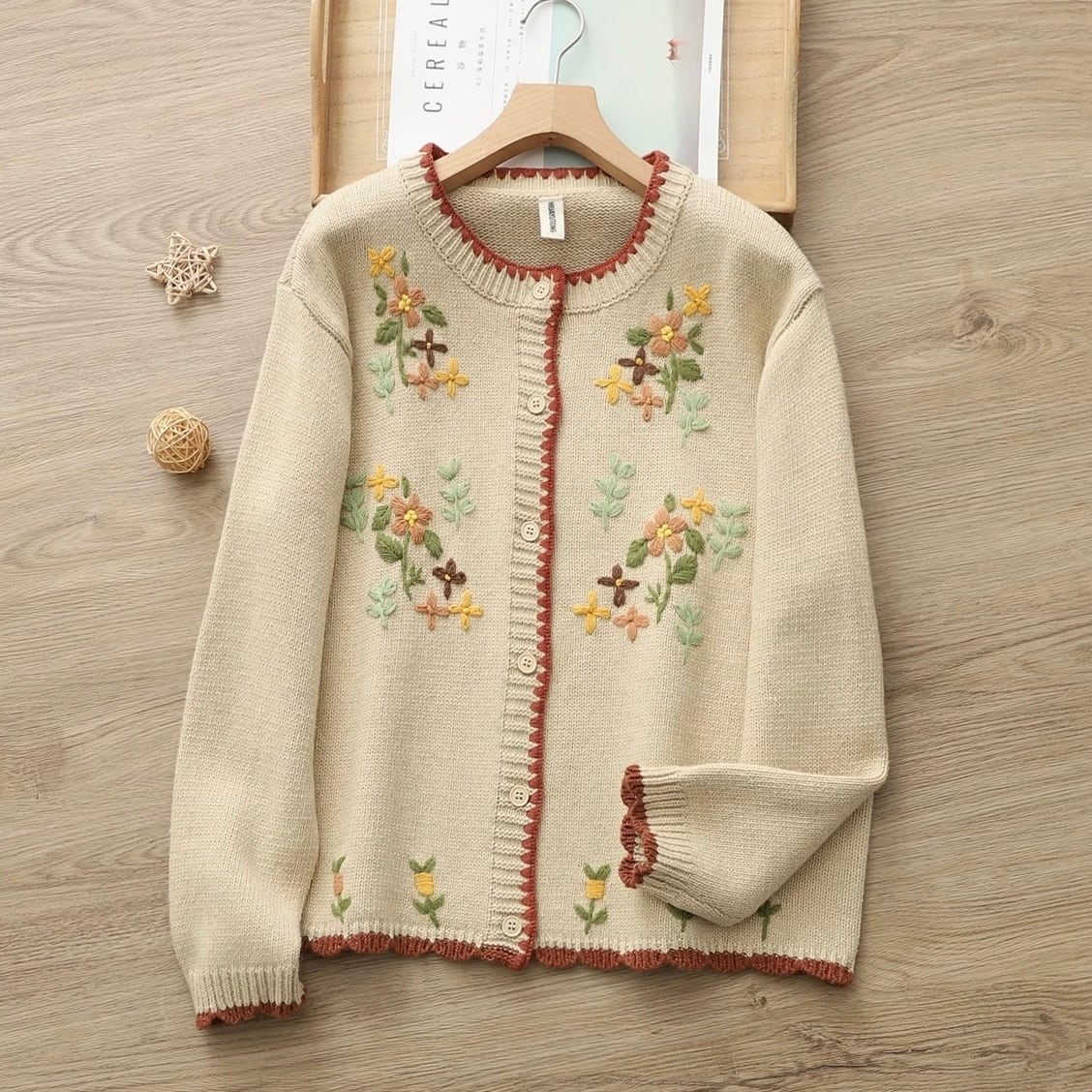 フロントと胸元に施した小花の刺繍が印象的なカーディガン。