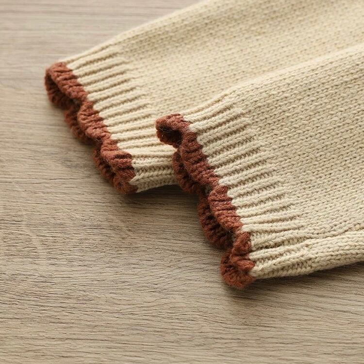 ラウンドネックと前立て、袖口・裾には配色の縁取りを入れ、全体の輪郭を引き締めています。