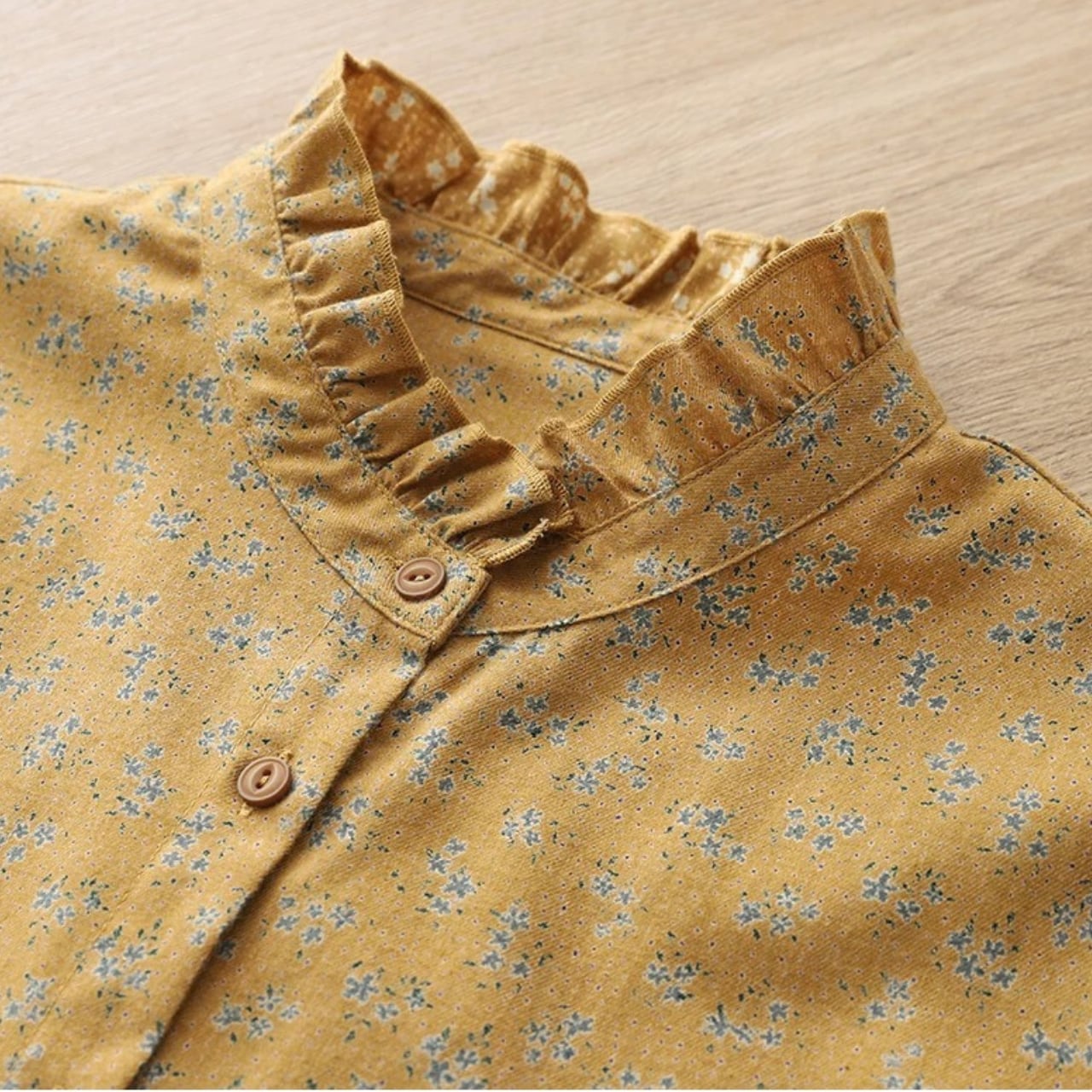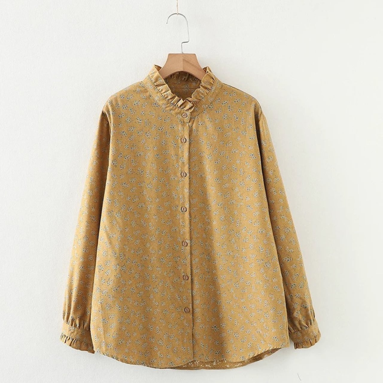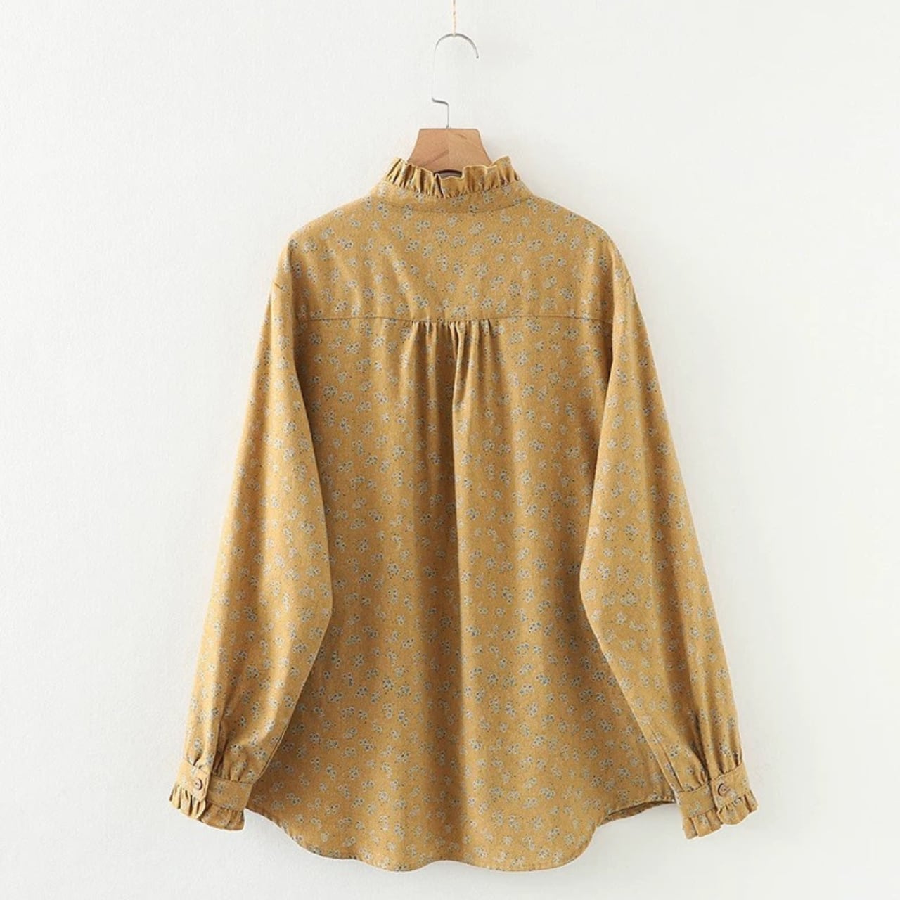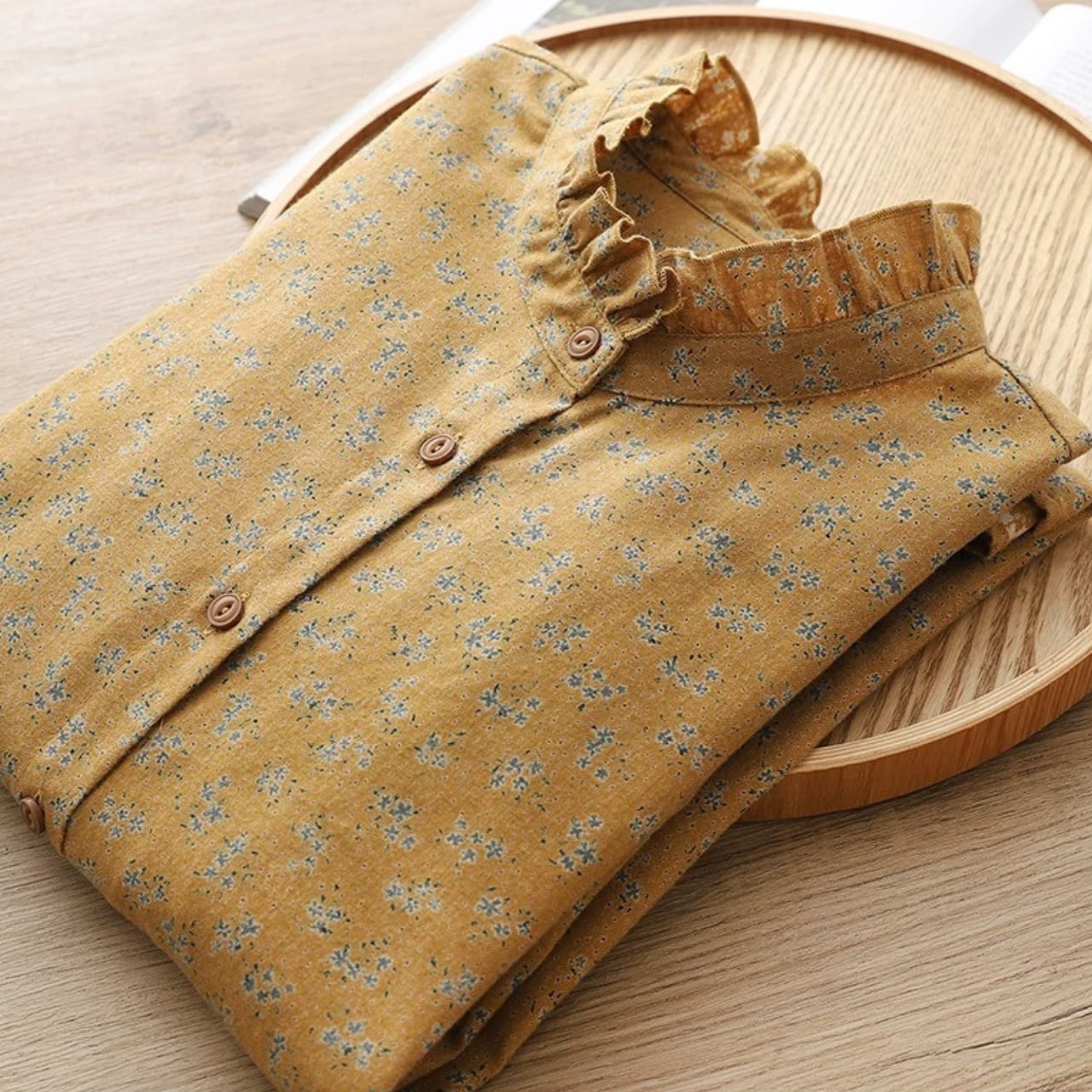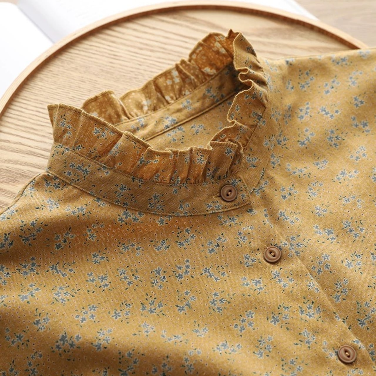 首元にさりげなくあしらったフリルがポイントの小花柄ブラウス。