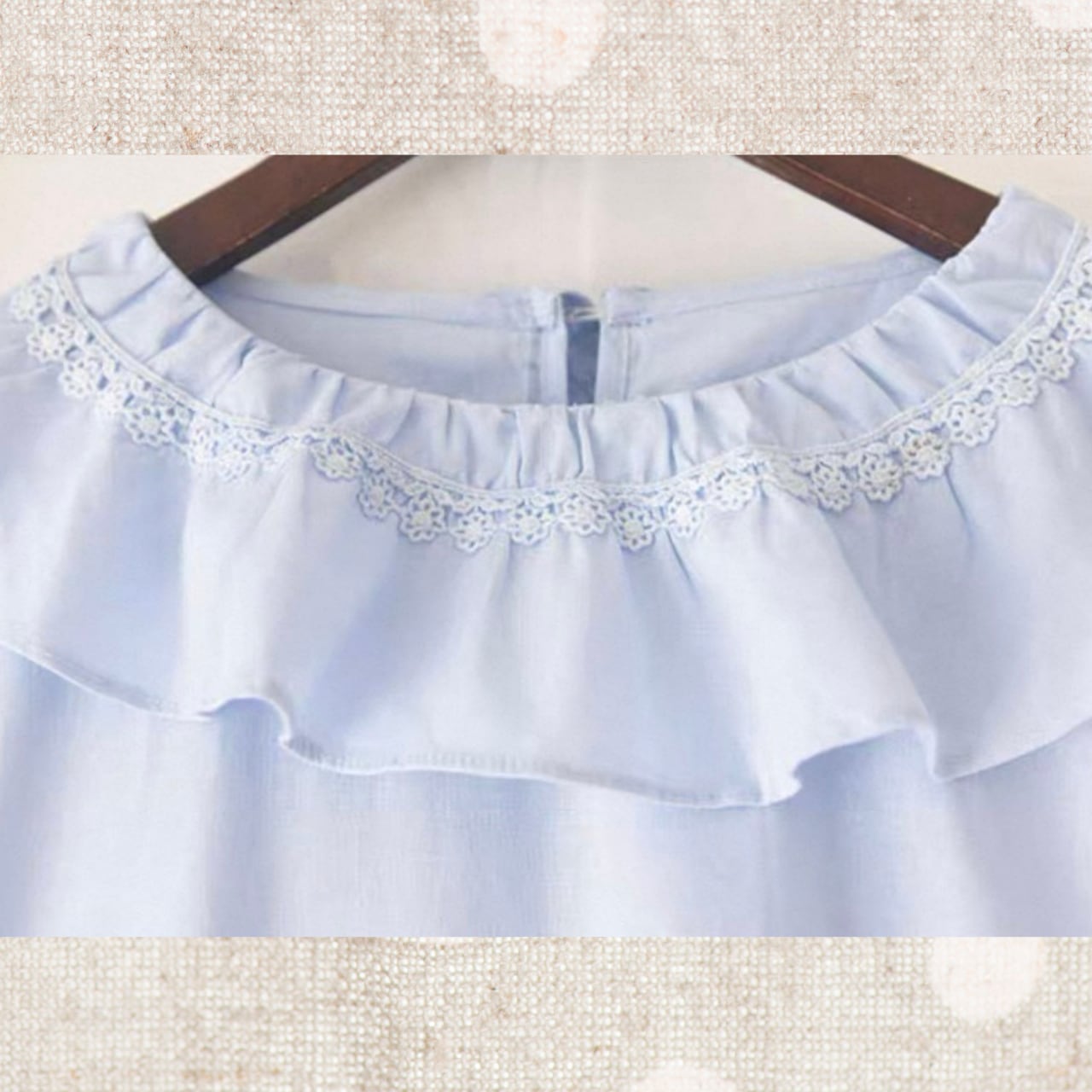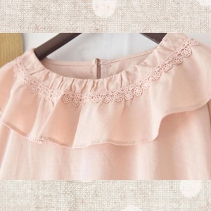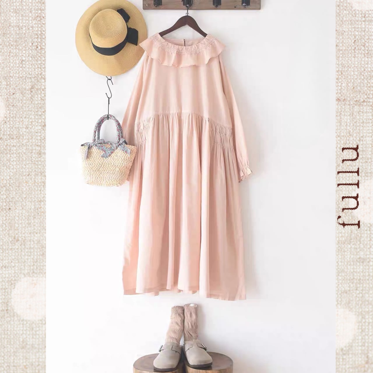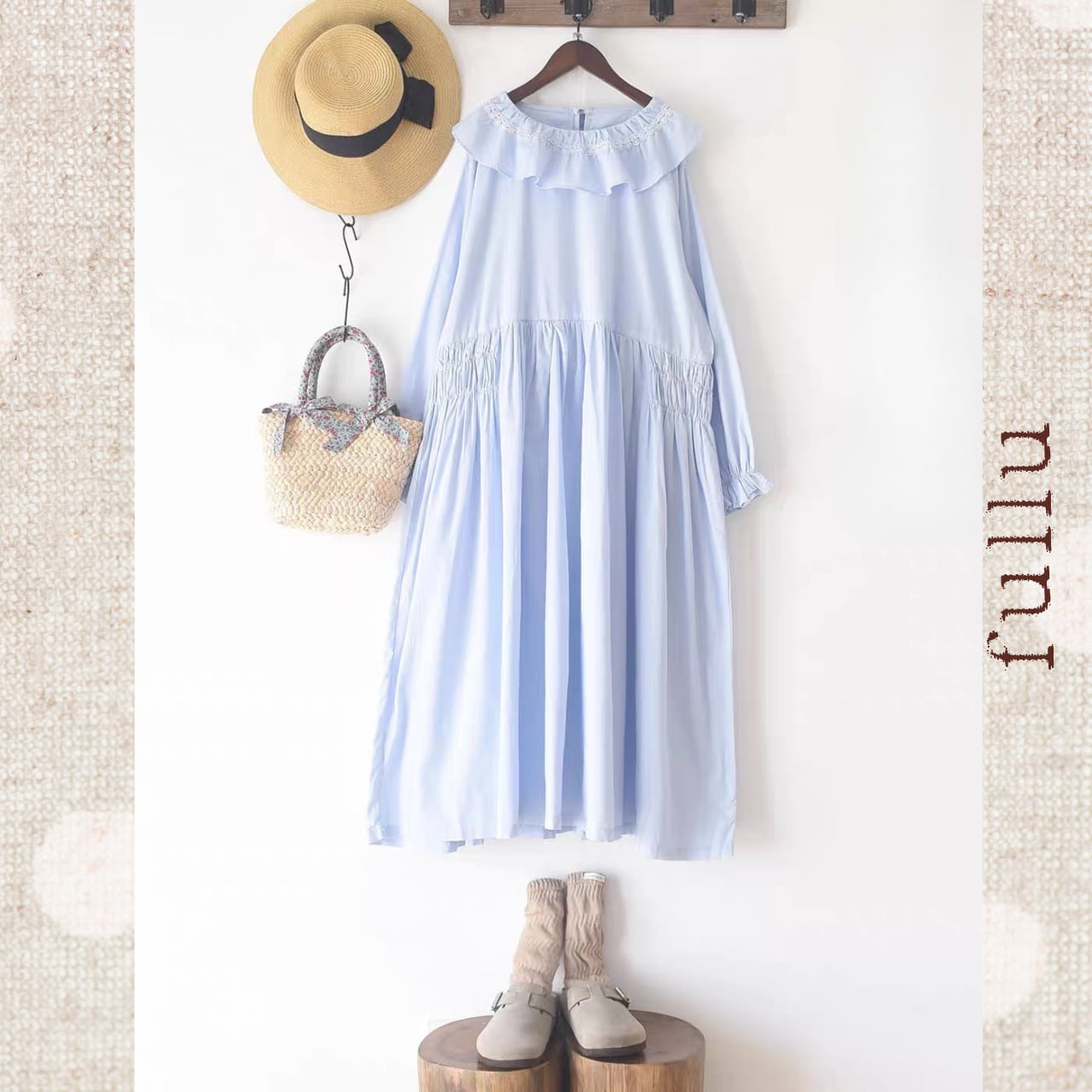 首元にフリルデザインをあしらった、パステルカラーのロングワンピース。