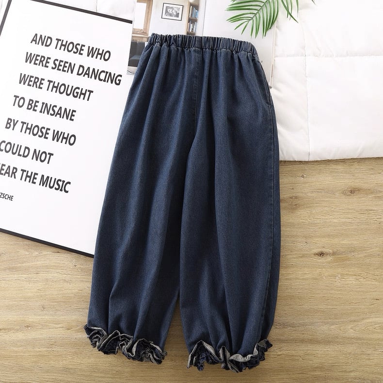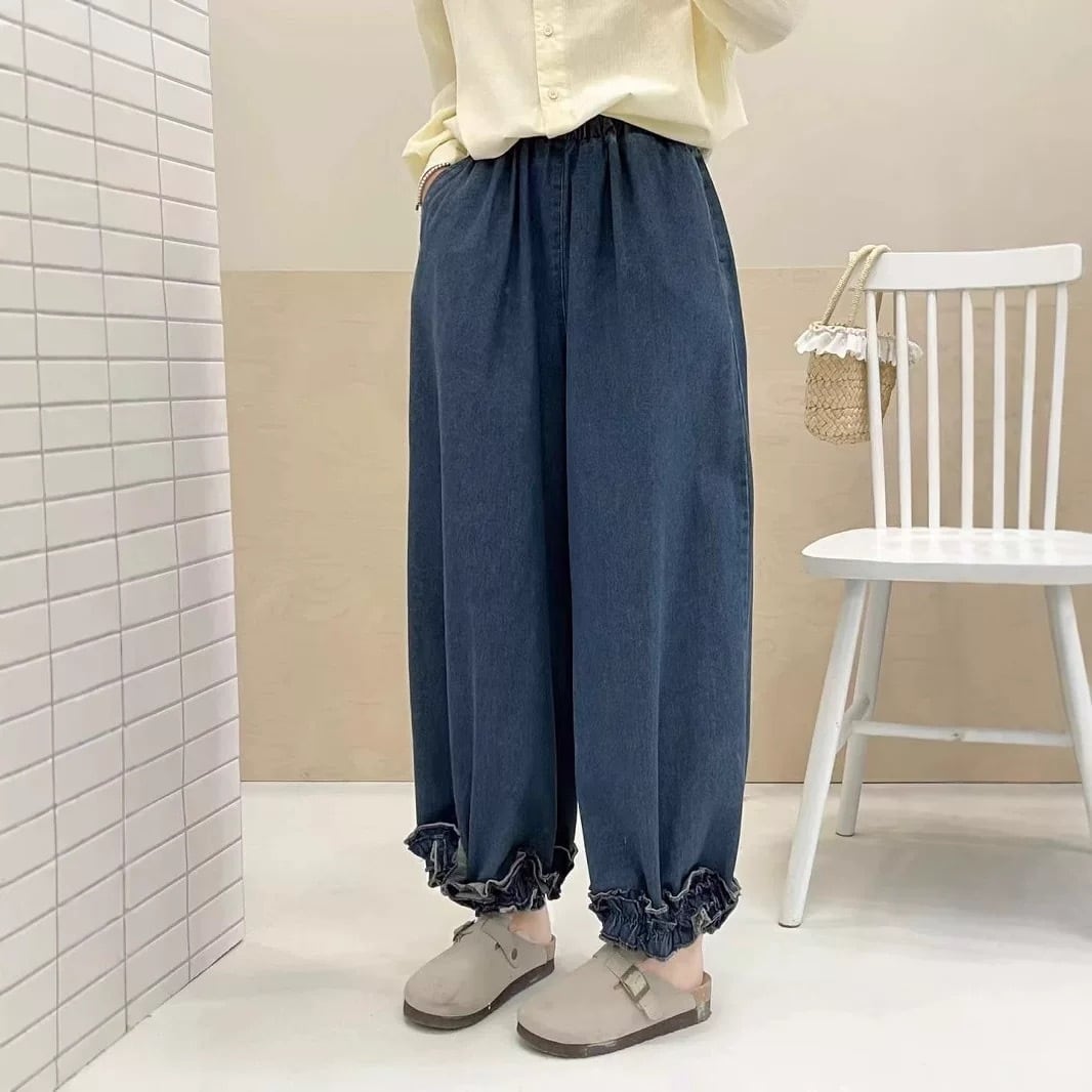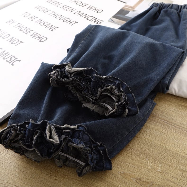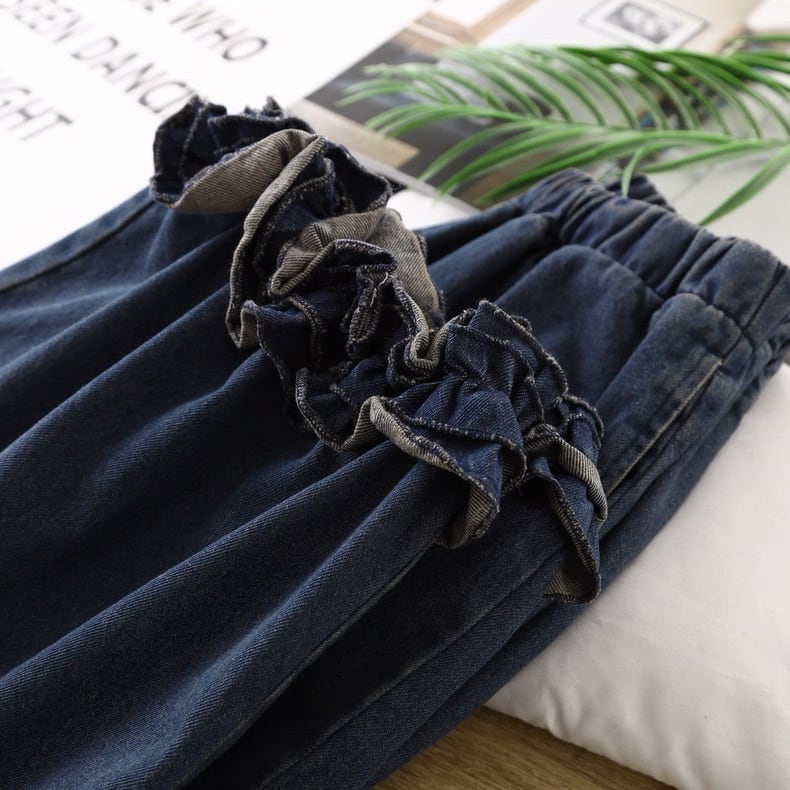 裾にあしらったフリルデザインが印象的なデニムパンツ。