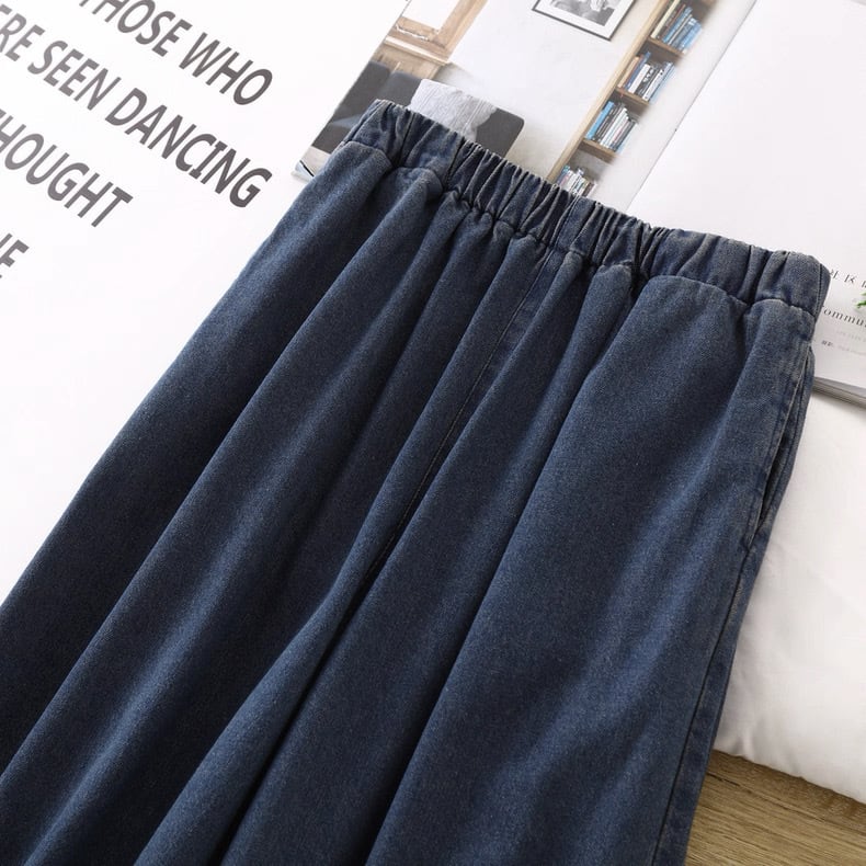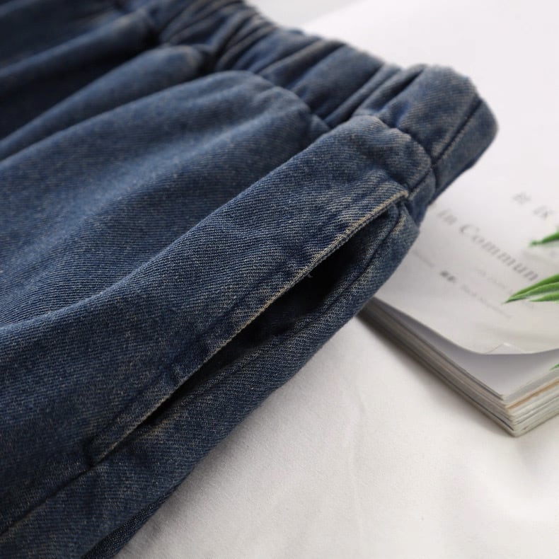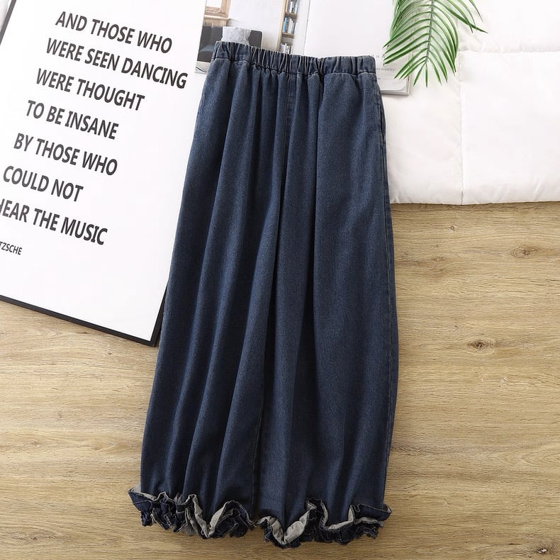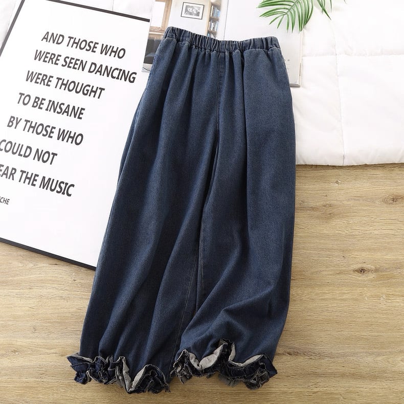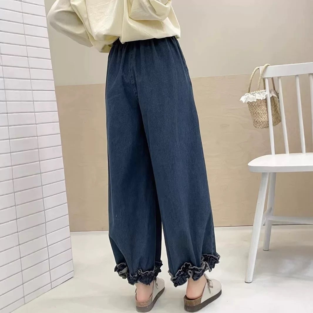 裾にあしらったフリルデザインが印象的なデニムパンツ。