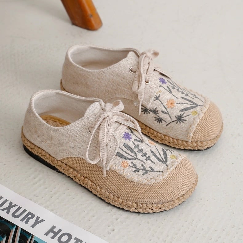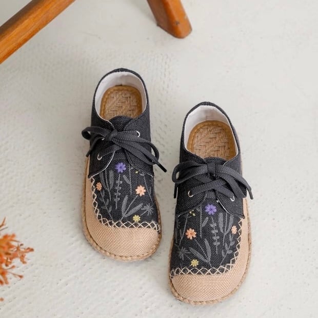 ナチュラルな風合いのキャンバス地に、野花モチーフの刺繍をあしらったレースアップシューズ。