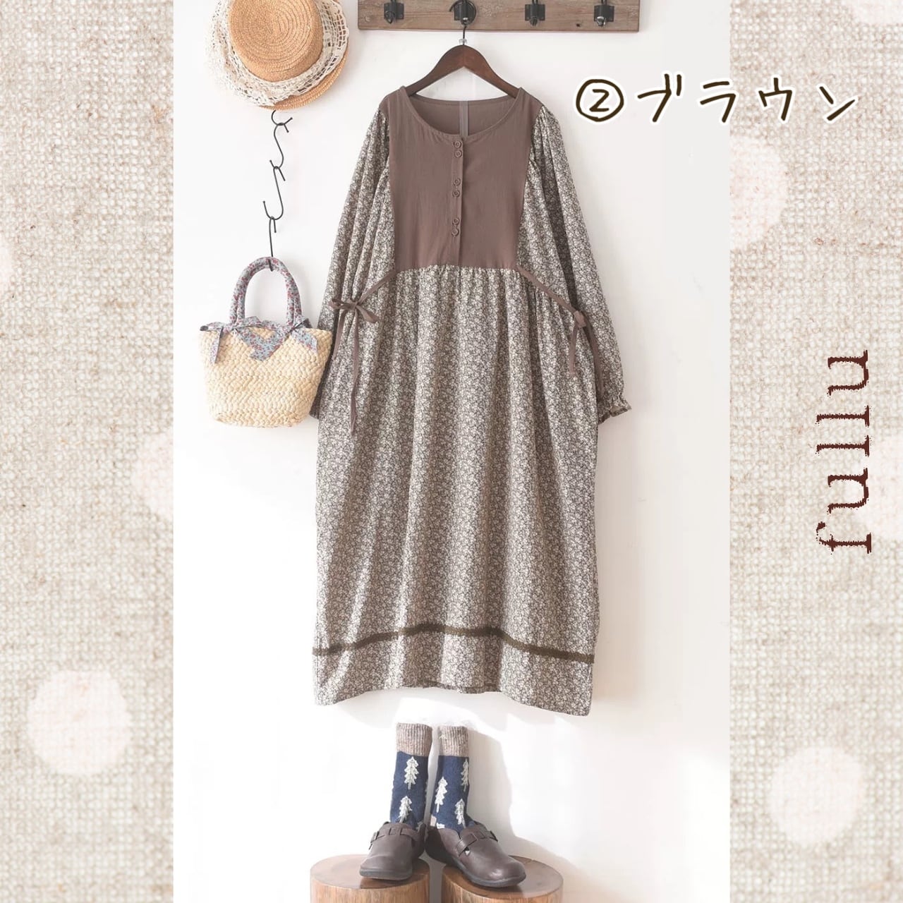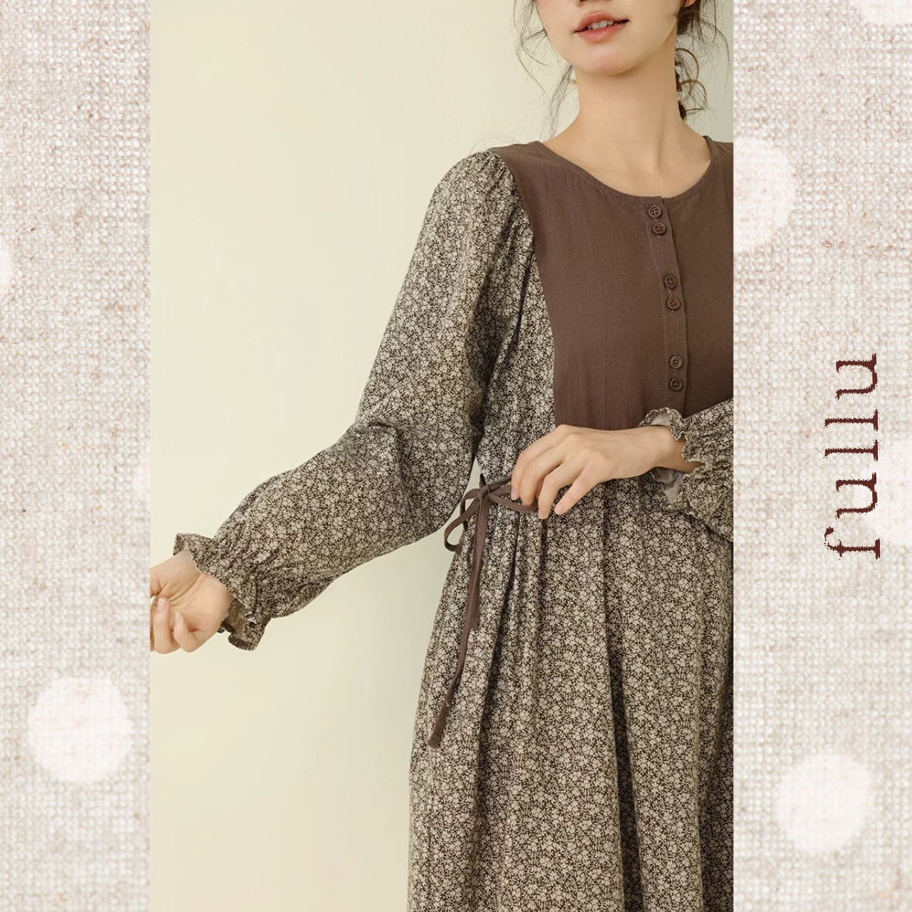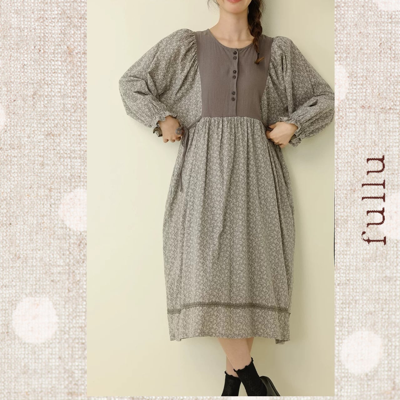 胸元からウエストにかけて無地で切り替えた、落ち着いた配色の小花柄ワンピースです。フロントに並ぶボタンが縦のラインをつくり、全体を引き締めるデザイン。