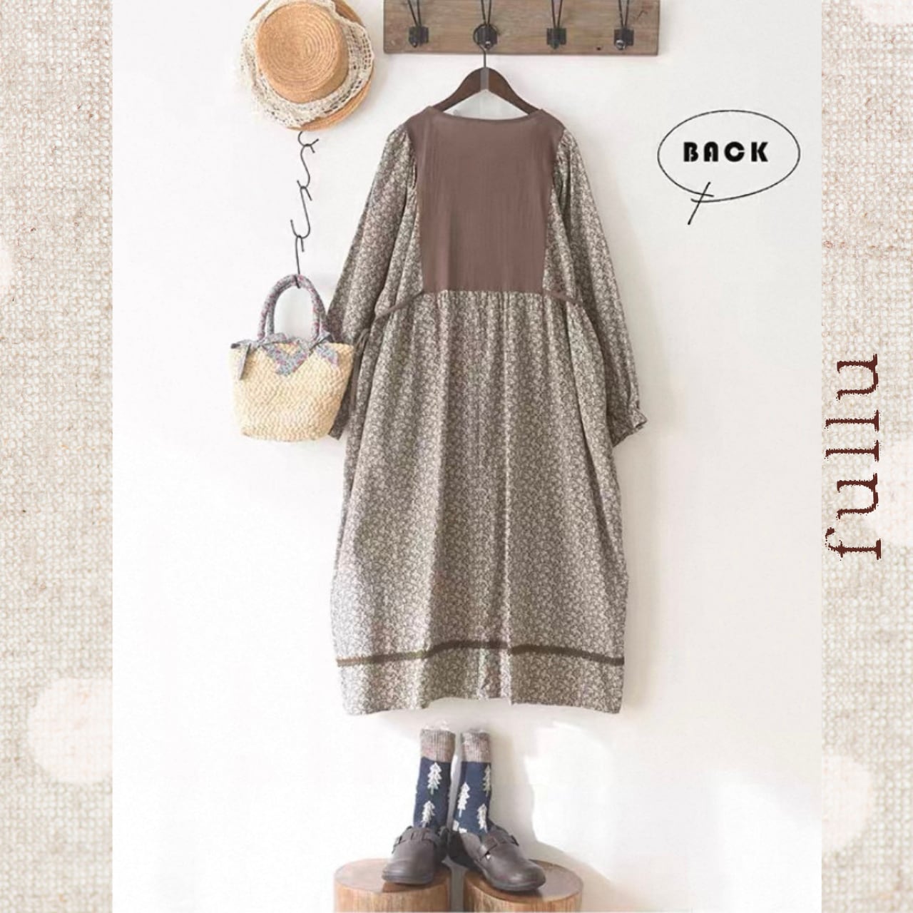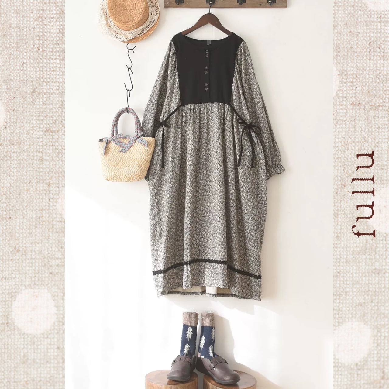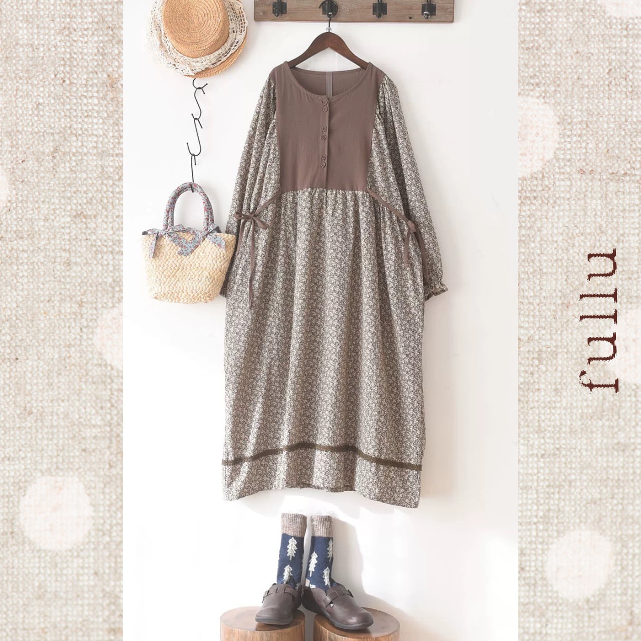 胸元からウエストにかけて無地で切り替えた、落ち着いた配色の小花柄ワンピースです。フロントに並ぶボタンが縦のラインをつくり、全体を引き締めるデザイン。