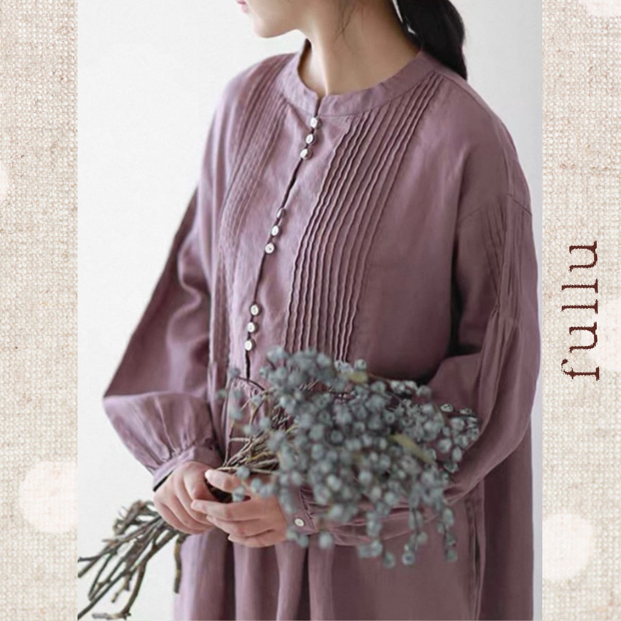 胸元には縦に並ぶピンタックデザイン。